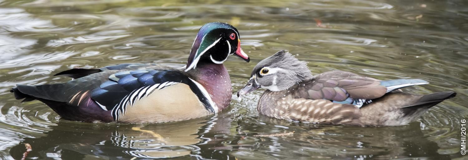 Die Brautente ist eine der am schönsten gezeichneten Arten aus der Gruppe der Glanz-Enten. Das Prachtgefieder der Männchen schillert zur Paarungszeit in den verschiedensten Farben. Das Federkleid des Weibchens ist vorwiegend in Grau und Braun gehalten. Ursprünglich kam die Brautente ausschliesslich in Nordamerika, meist an küstennahen Gewässern und grossen Seen in bewaldeter Landschaft, vor. Doch bereits im 17. Jahrhundert wurde die Brautente vom französischen Adel zur Zierde in den berühmten Parkanlagen von Chantilly und Versailles gehalten. Die Verwilderung fand wohl erst im 19. Jahrhundert durch Gefangenschafts-Flüchtlinge statt. Manchmal werden auch in Europa einzelne Exemplare in der freien Natur gesichtet. Es ist aber davon auszugehen, dass es sich hierbei vor allem um aus Zuchten entflohene Tiere oder um deren Nachkommen handelt. Allgemein scheint die Brautente in Europa nicht wirklich Fuss zu fassen. In Nordamerika war sie zu Beginn des 20. Jahrhundert beinahe ausgerottet worden. Heute ist ihr Bestand in Amerika gesichert, obwohl sie gejagt werden darf. Für Brautenten gilt: „Was auf den Tisch kommt, wird gefressen“. Je nach Verfügbarkeit sind dies Wasserpflanzen, verschiedene Früchte oder Beeren, aber auch unterschiedlichste Insekten und teilweise sogar kleine Fische. Zur Not werden auch Nutzpflanzen wie Sojabohnen oder Mais verspeist. Dank ihres anpassungsfähigen Fressverhaltens müssen Brautenten nur selten Hunger leiden. Brautenten nisten in Baumhöhlen oder Nistkästen in der Nähe von Seen und Flüssen. Sind ausreichend Brutplätze vorhanden, nisten die Brautenten in grösseren Gruppen. Bereits einen Tag nach dem Schlupf verlassen die Küken ihr Nest und folgen der Mutter. Dazu müssen sie aus dem Nest springen – in der Regel aus einer Höhe von mehreren Metern. Für die weitere Aufzucht der Küken ist das Weibchen meist alleine verantwortlich. Im Süden des Verbreitungsgebietes ziehen Brautenten in der Regel zweimal pro Jahr Nachwuchs auf. Im Tierpark Goldau kann man die Brautenten auf dem Blauweiher beobachten.