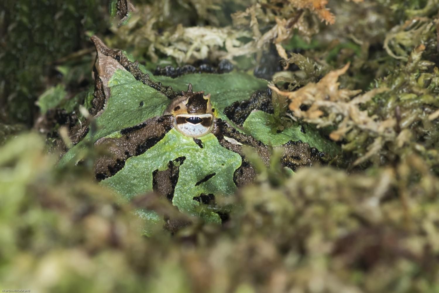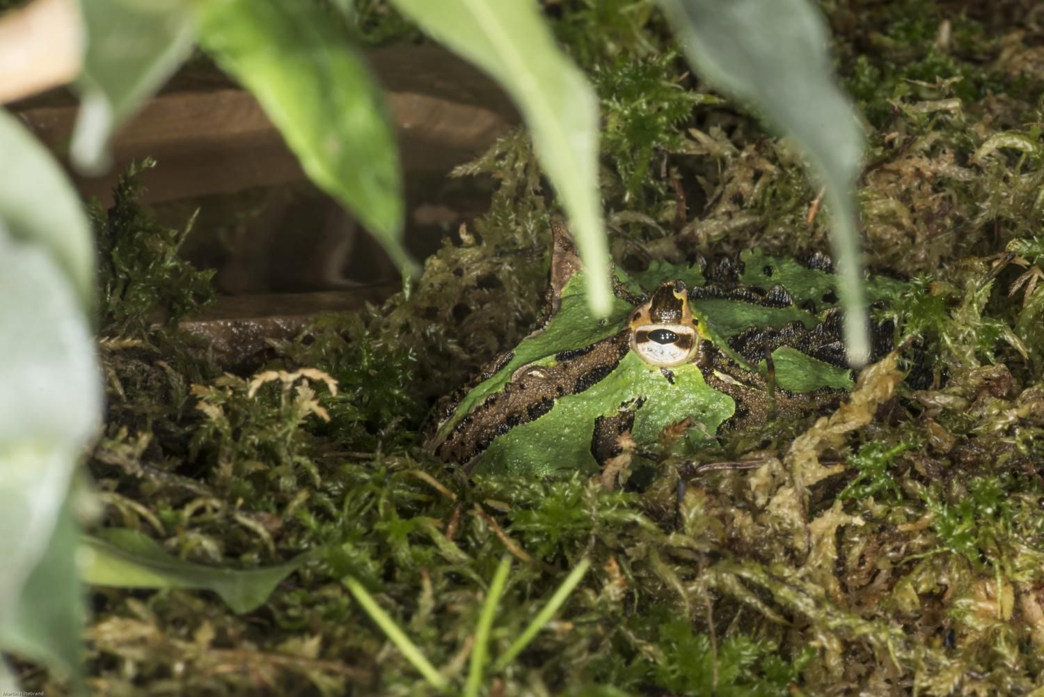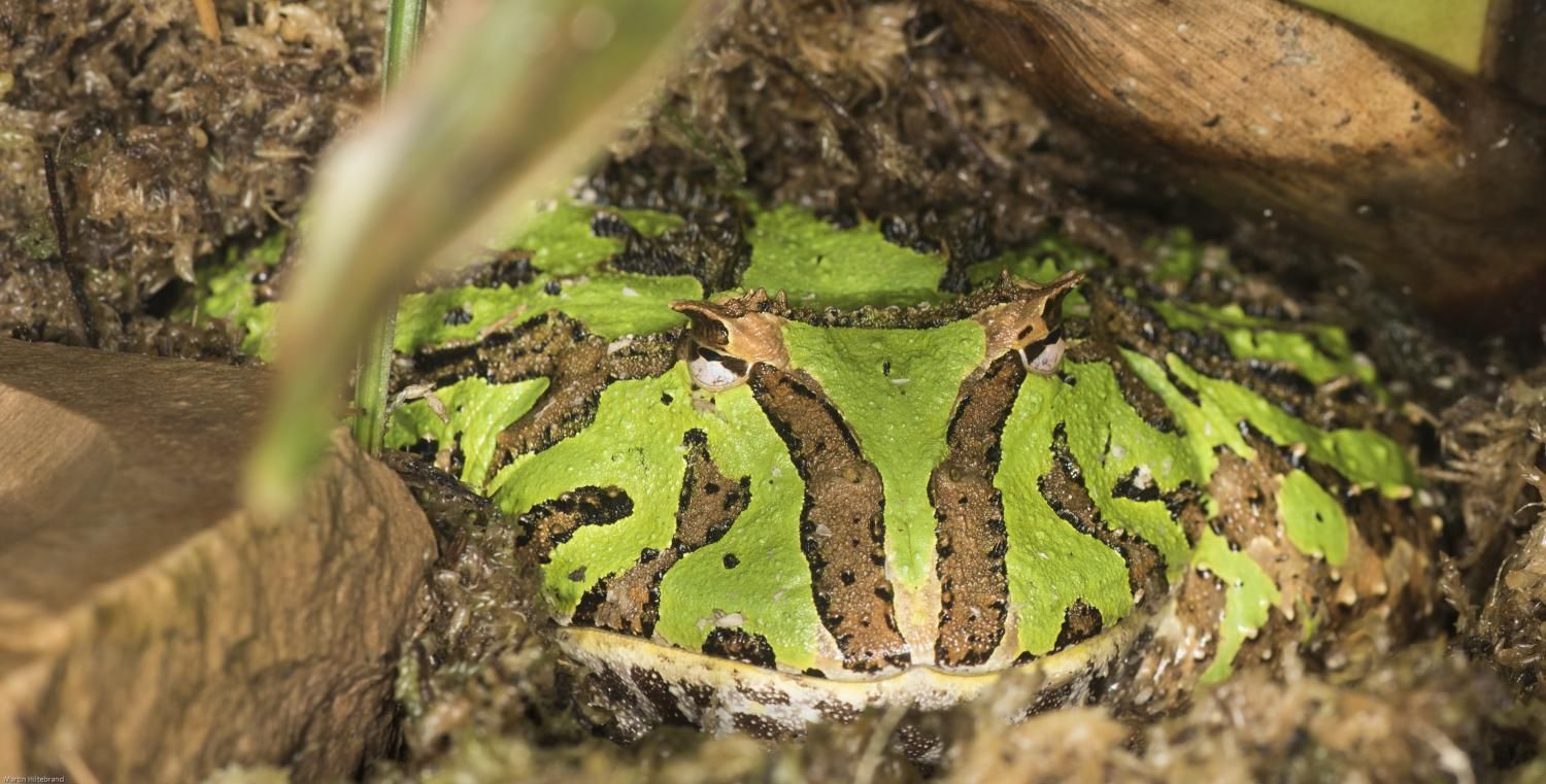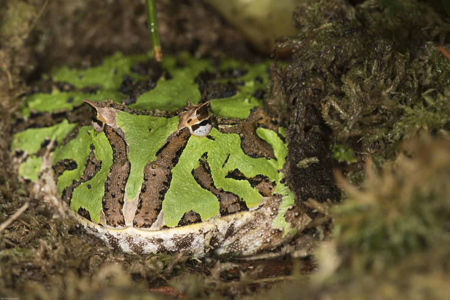 Schmuckhornfrösche sind Meister der Tarnung. Bis zum Kopf eingegraben lauern sie tags- und nachtsüber auf Beutetiere. Schmuckhornfrösche haben ein zum restlichen Körper riesiges Maul, dafür sind die Springbeine kurz. Sie besiedeln den primären Tropischen Regenwald Südamerikas.
