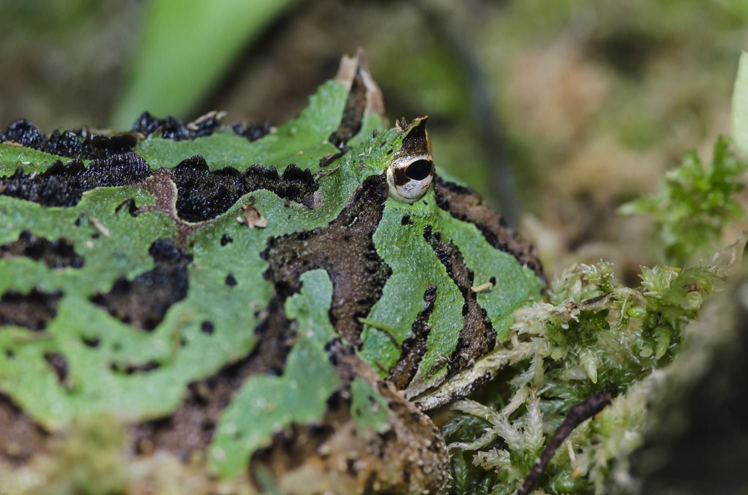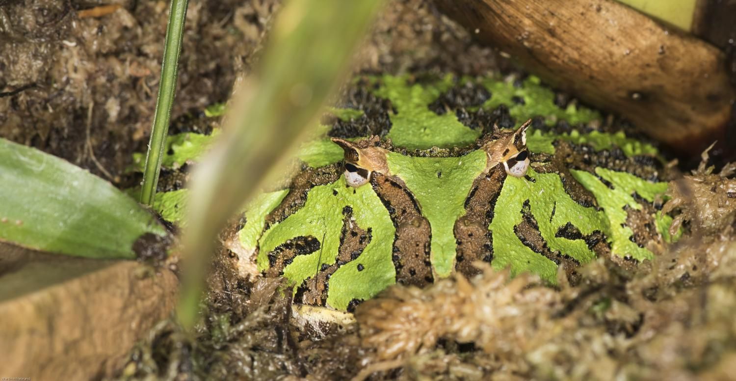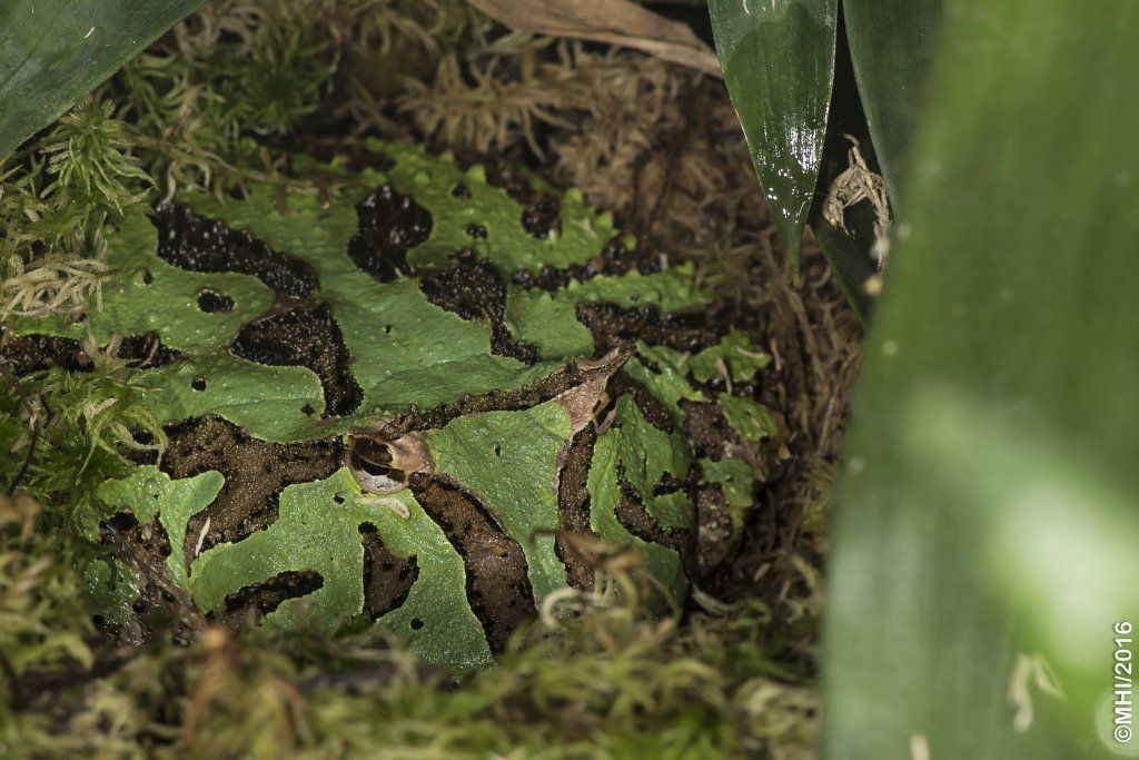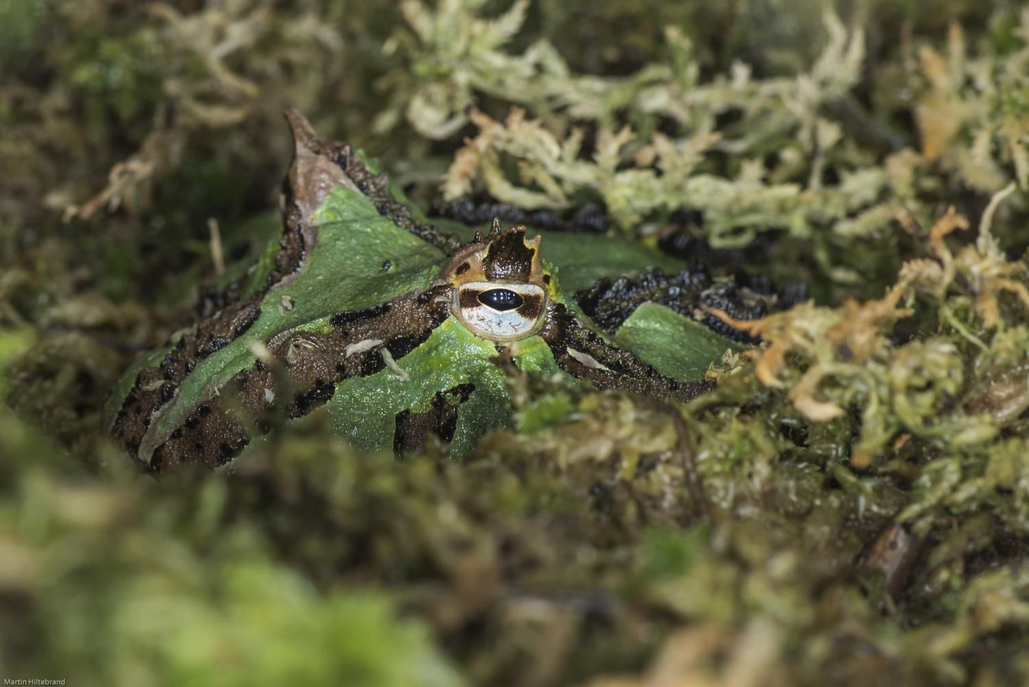 Schmuckhornfrösche sind Meister der Tarnung. Bis zum Kopf eingegraben lauern sie tags- und nachtsüber auf Beutetiere. Schmuckhornfrösche haben ein zum restlichen Körper riesiges Maul, dafür sind die Springbeine kurz. Sie besiedeln den primären Tropischen Regenwald Südamerikas.