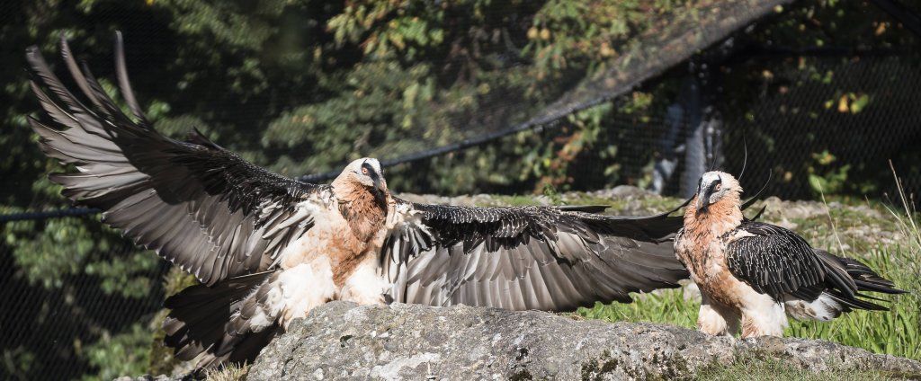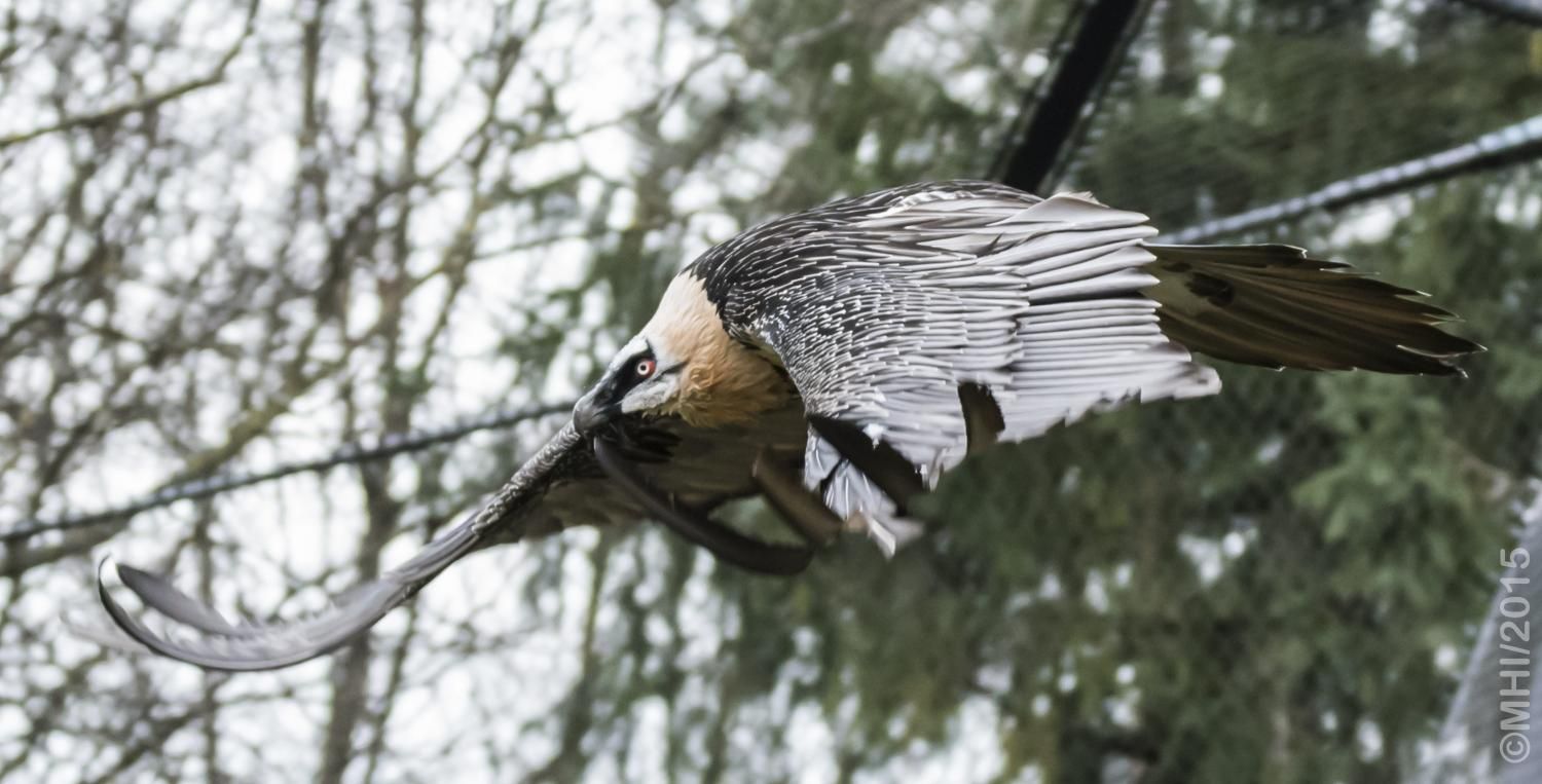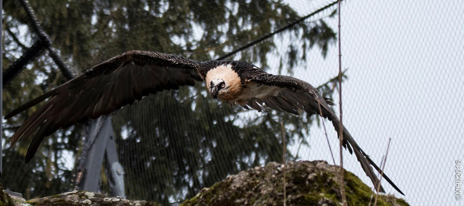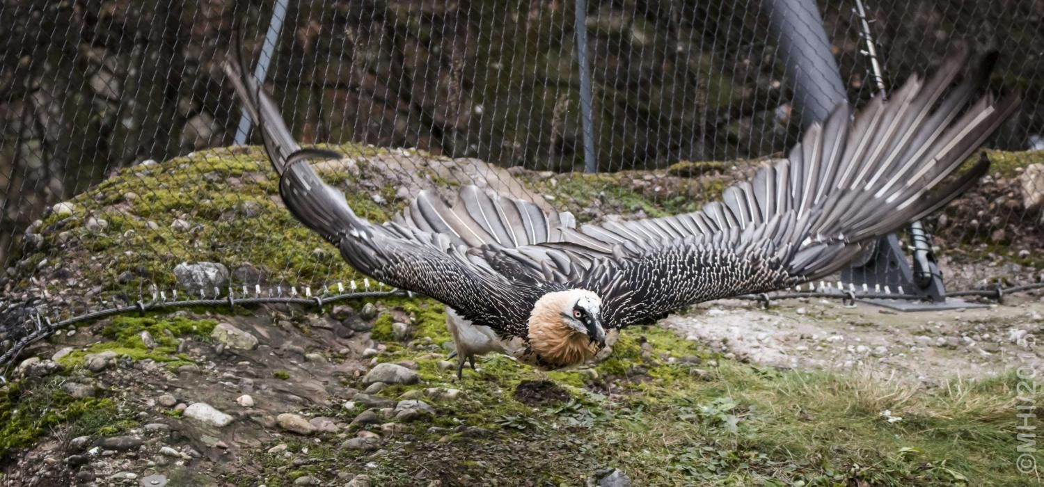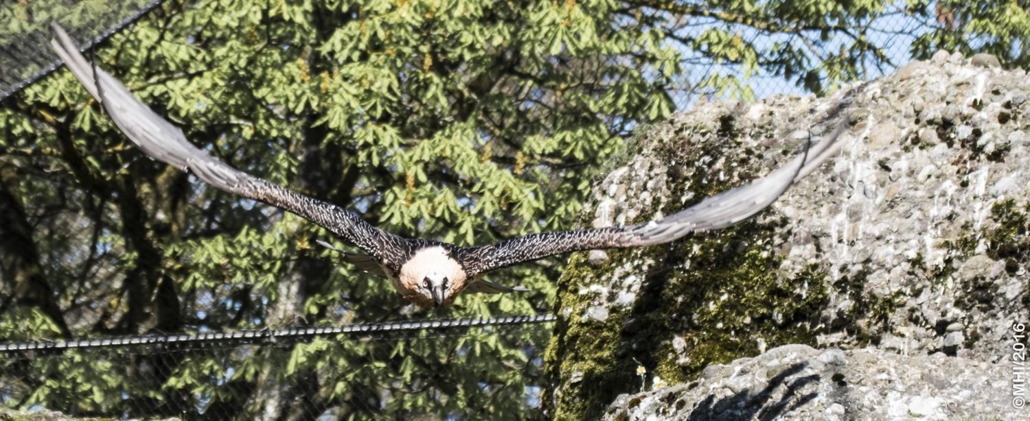 Mit einer beeindruckenden Spannweite bis zu drei Metern übertrifft der Bartgeier in der Grösse sogar den Steinadler. Der grösste einheimische Vogel ist aber ganz harmlos. Wie alle Geier ernährt er sich ausschliesslich von Aas. Zudem ist er auf Knochen spezialisiert, die etwa 80% seiner Nahrung ausmachen. Jungvögel benötigen allerdings zu Beginn ihres Lebens Fleisch, sie können erst später Knochen verdauen. In Anpassung an diesen Umstand brüten Bartgeier im Winter. Die Jungvögel schlüpfen ab Ende Februar – eine Zeit, in welcher in den Alpen viele Wildtiere an Hunger oder in Lawinen verenden und daher auch für einen Aasfresser, der nicht jagt, genügend Nahrung für den Nachwuchs zu finden ist. Ursprünglich in Europa weit verbreitet wurde der Bartgeier anfangs des 20. Jahrhunderts in den Alpen ausgerottet. Er galt fälschlicherweise als gefährlich, so dass er intensiv bejagt und mit ausgelegten Ködern vergiftet wurde. Im Volksglauben wurde diesem majestätischen Vogel unter anderem sogar Kindsraub angedichtet. Namen wie „Kindstöter“ oder „Lämmergeier“ zeugten davon. Ein Nahrungsmangel (es gab zu jener Zeit deutlich weniger Wild als heute) machte ihm ebenfalls zu schaffen. In den 80er Jahren wurde ein Wiederansiedlungsprojekt gestartet. Der Natur- und Tierpark Goldau ist an diesem sehr anspruchsvollen und auch finanziell aufwändigen Projekt federführend beteiligt. Seither sind schon über 180 junge, in Zoos geschlüpfte Bartgeier ausgesetzt worden, davon 12 vom Natur- und Tierpark Goldau (Stand Juni 2012). Zu den Wiederansiedlungsgebieten im Alpenraum gehören Österreich, die Schweiz, Italien und Frankreich. Seit 1997 können Freilandbruten beobachtet werden, seit 2007 auch in der Schweiz. Das Projekt Wiederansiedlung Bartgeier gilt denn auch als eines der erfolgreichsten Auswilderungsprojekte weltweit. Aktuelle Angaben und Informationen finden Sie jeweils unter www.bartgeier.ch.