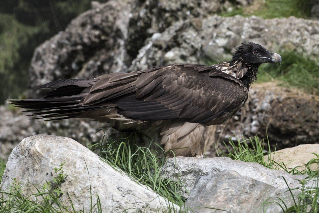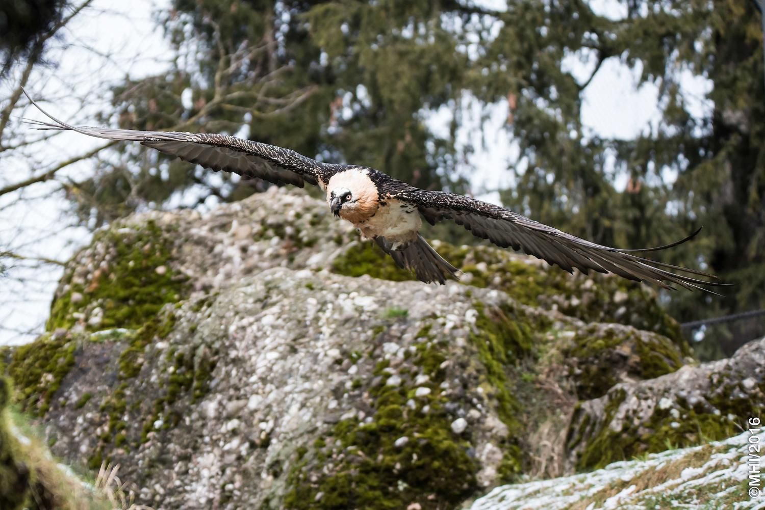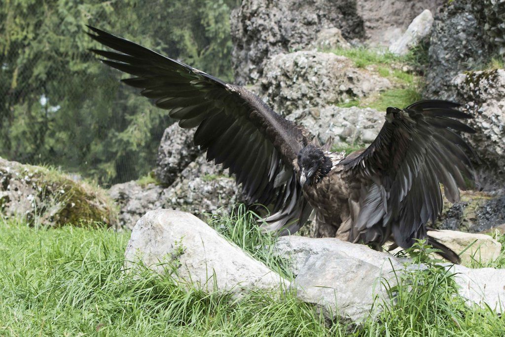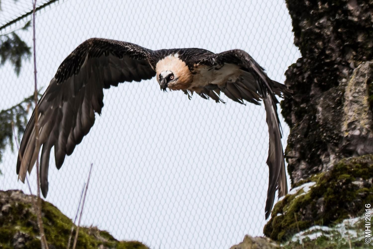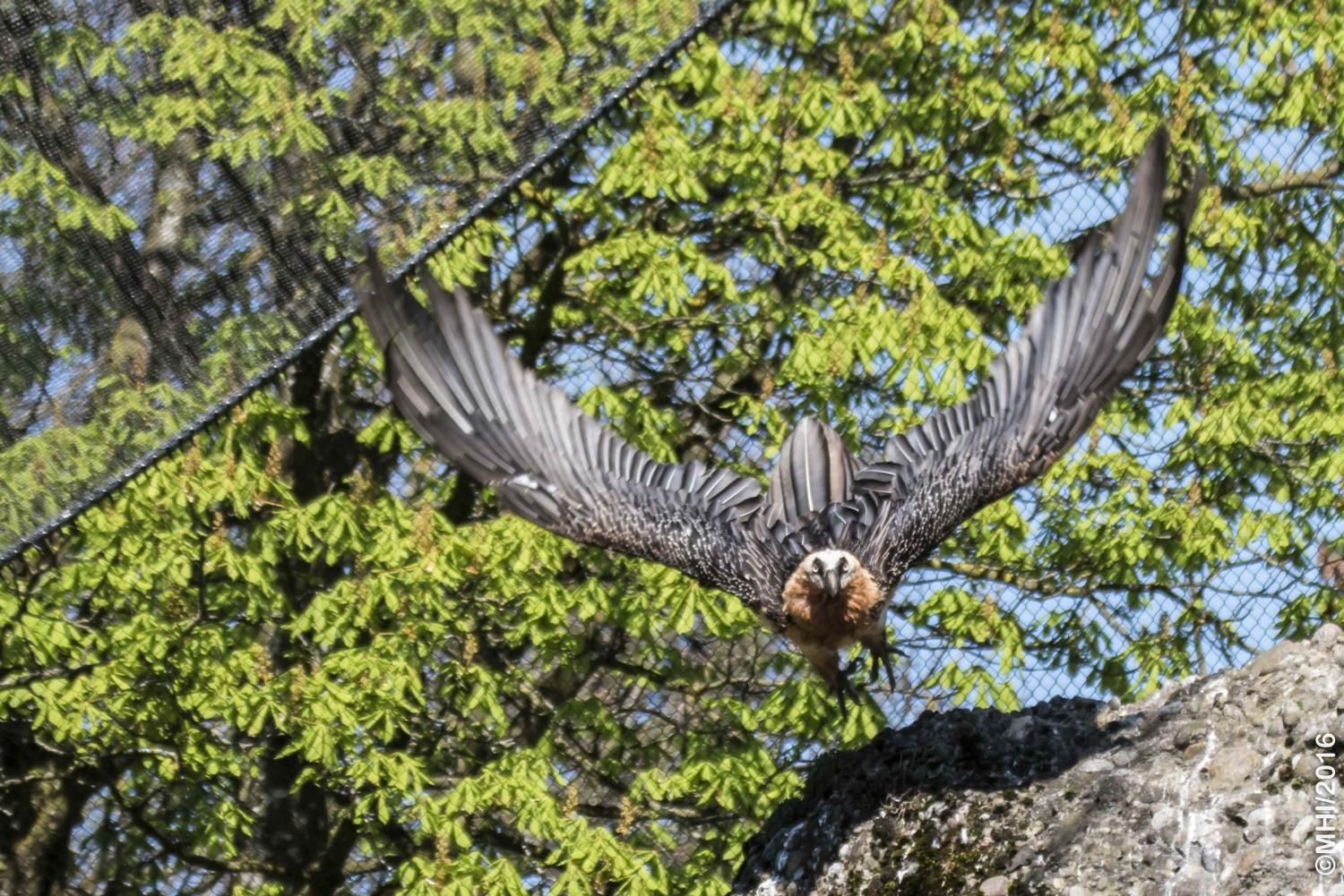Mit einer beeindruckenden Spannweite bis zu drei Metern übertrifft der Bartgeier in der Grösse sogar den Steinadler. Der grösste einheimische Vogel ist aber ganz harmlos. Wie alle Geier ernährt er sich ausschliesslich von Aas. Zudem ist er auf Knochen spezialisiert, die etwa 80% seiner Nahrung ausmachen. Jungvögel benötigen allerdings zu Beginn ihres Lebens Fleisch, sie können erst später Knochen verdauen. In Anpassung an diesen Umstand brüten Bartgeier im Winter. Die Jungvögel schlüpfen ab Ende Februar – eine Zeit, in welcher in den Alpen viele Wildtiere an Hunger oder in Lawinen verenden und daher auch für einen Aasfresser, der nicht jagt, genügend Nahrung für den Nachwuchs zu finden ist. Ursprünglich in Europa weit verbreitet wurde der Bartgeier anfangs des 20. Jahrhunderts in den Alpen ausgerottet. Er galt fälschlicherweise als gefährlich, so dass er intensiv bejagt und mit ausgelegten Ködern vergiftet wurde. Im Volksglauben wurde diesem majestätischen Vogel unter anderem sogar Kindsraub angedichtet. Namen wie „Kindstöter“ oder „Lämmergeier“ zeugten davon. Ein Nahrungsmangel (es gab zu jener Zeit deutlich weniger Wild als heute) machte ihm ebenfalls zu schaffen. In den 80er Jahren wurde ein Wiederansiedlungsprojekt gestartet. Der Natur- und Tierpark Goldau ist an diesem sehr anspruchsvollen und auch finanziell aufwändigen Projekt federführend beteiligt. Seither sind schon über 180 junge, in Zoos geschlüpfte Bartgeier ausgesetzt worden, davon 12 vom Natur- und Tierpark Goldau (Stand Juni 2012). Zu den Wiederansiedlungsgebieten im Alpenraum gehören Österreich, die Schweiz, Italien und Frankreich. Seit 1997 können Freilandbruten beobachtet werden, seit 2007 auch in der Schweiz. Das Projekt Wiederansiedlung Bartgeier gilt denn auch als eines der erfolgreichsten Auswilderungsprojekte weltweit. Aktuelle Angaben und Informationen finden Sie jeweils unter www.bartgeier.ch.