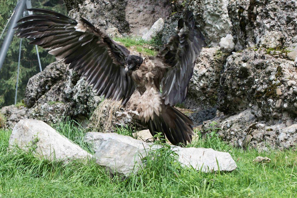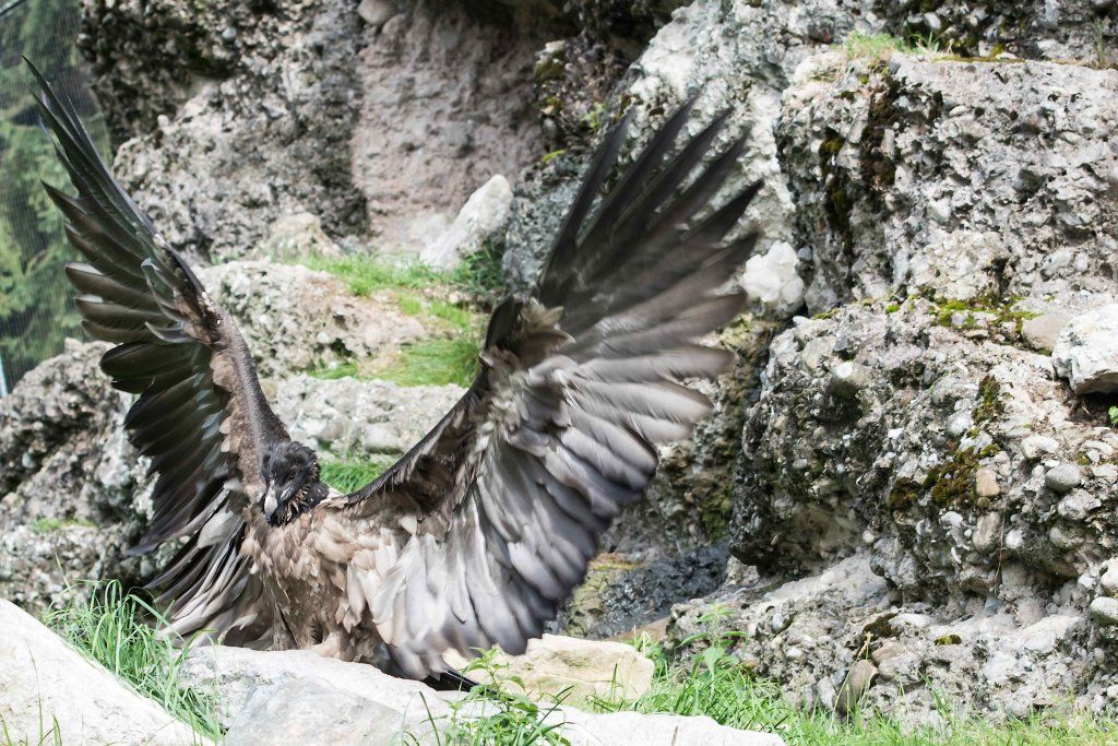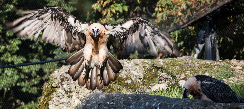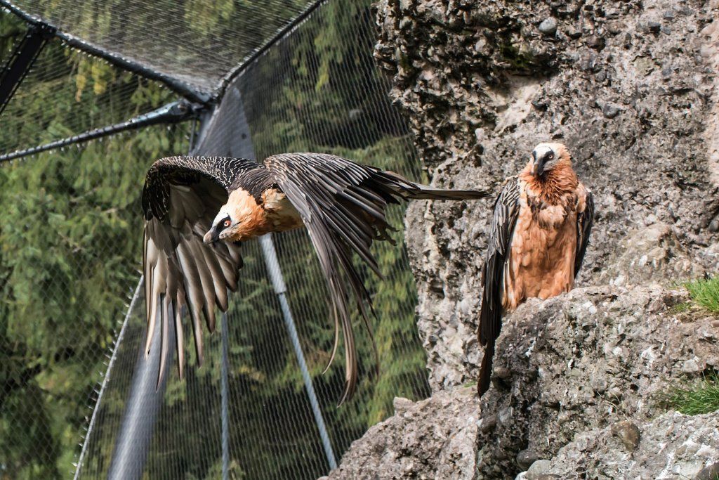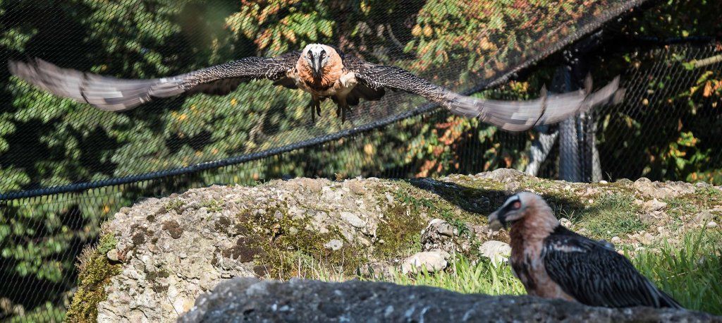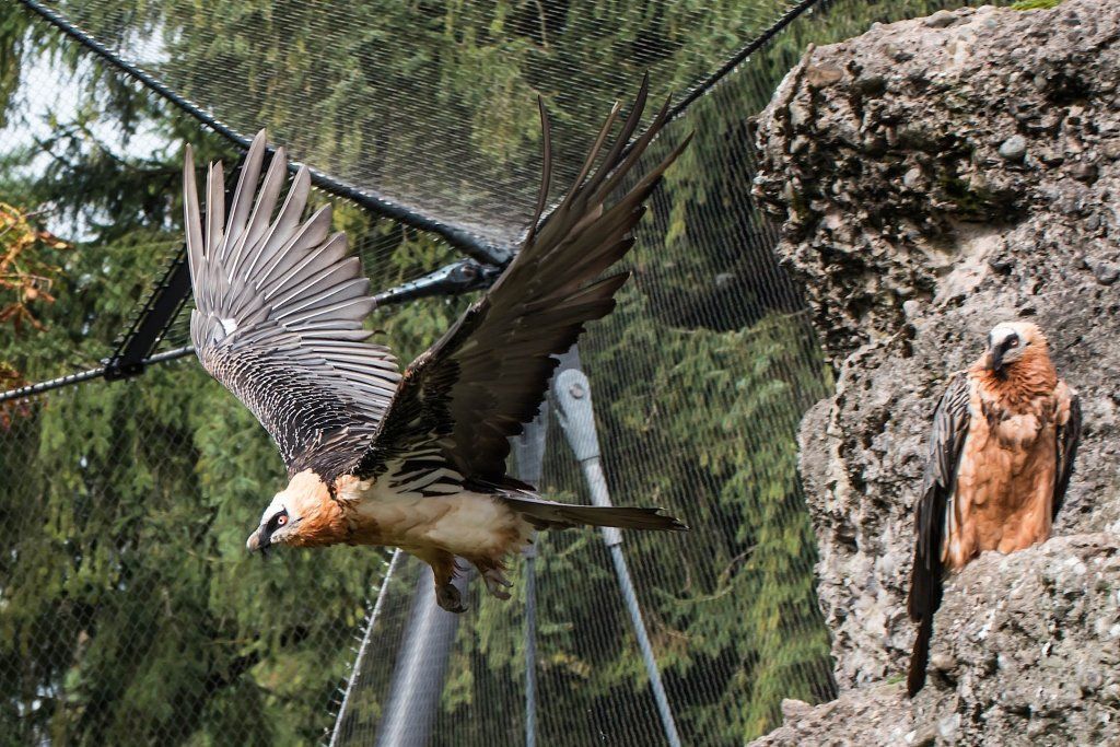 Im Tierpark finden Sie die Bartgeier gegenüber dem Wildschweingehege, wo die Vögel zusammen mit den Schneehasen eine Voliere bewohnen. Da sie aber nur Aas und Knochen fressen, stellen sie für die Schneehasen keine Gefahr dar.