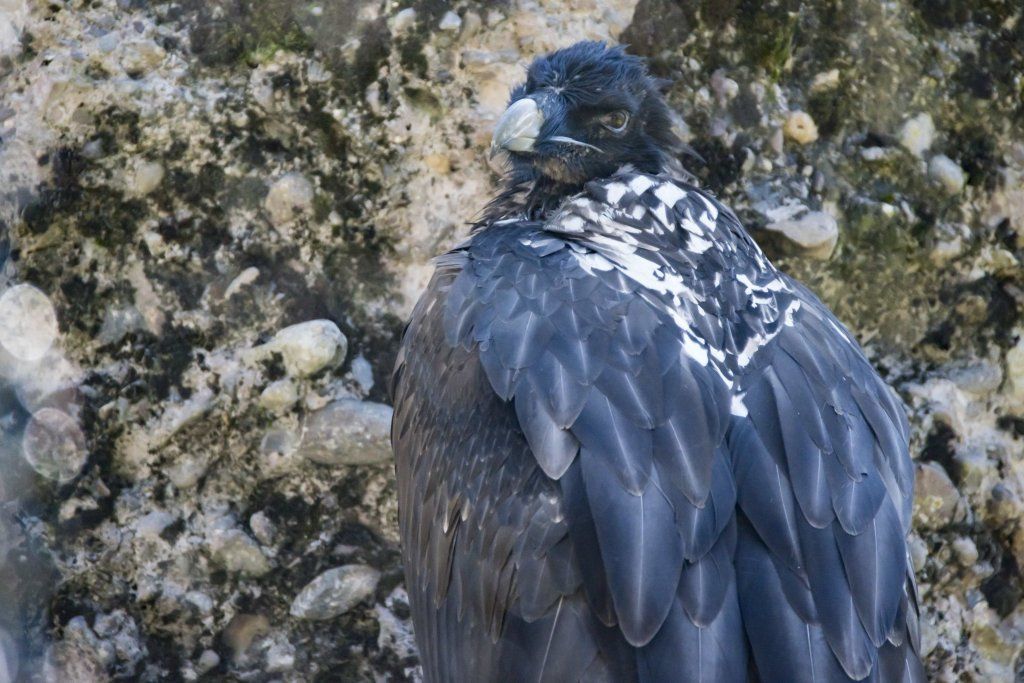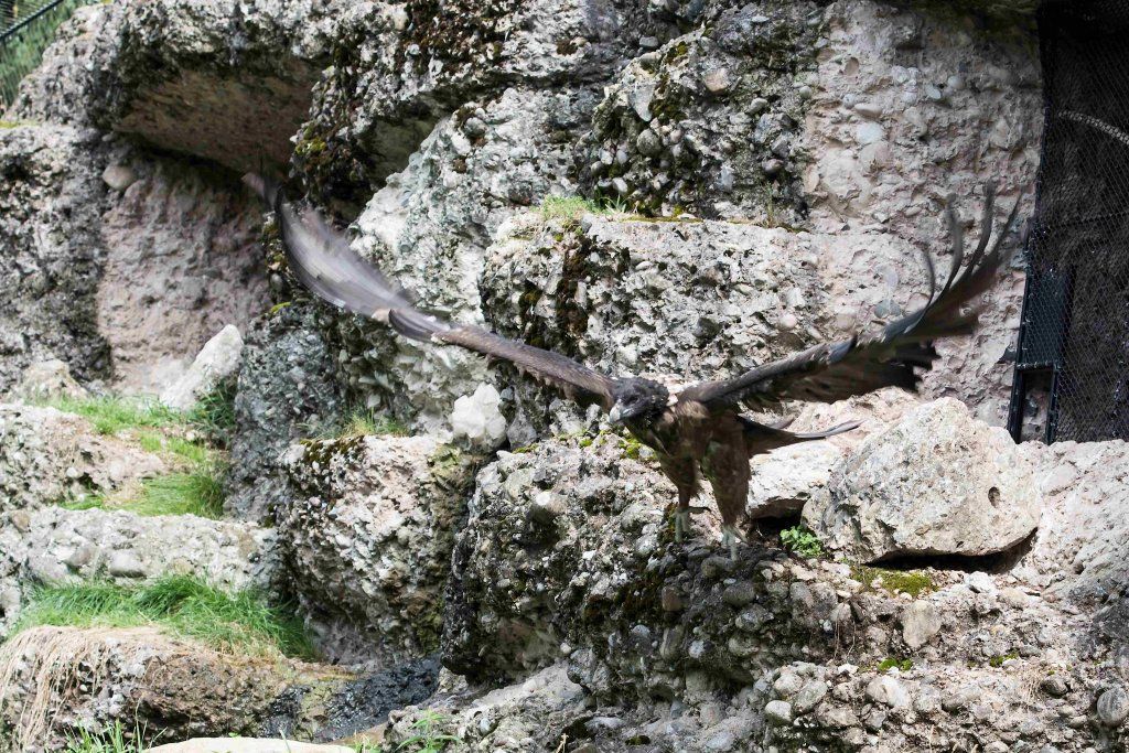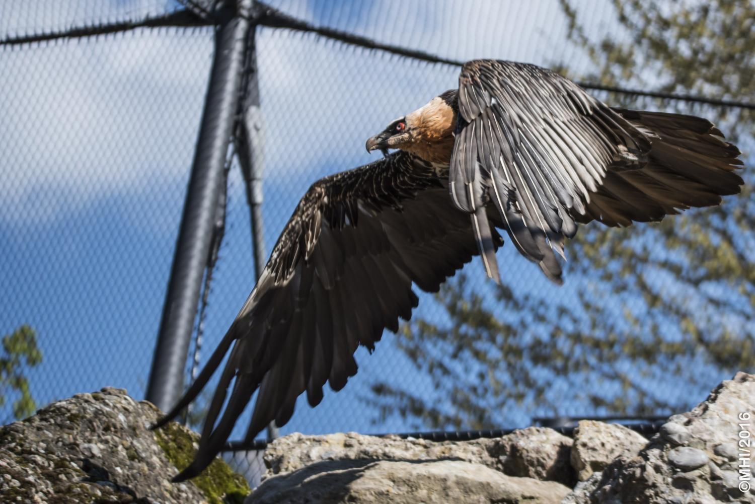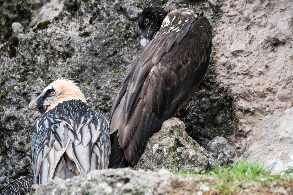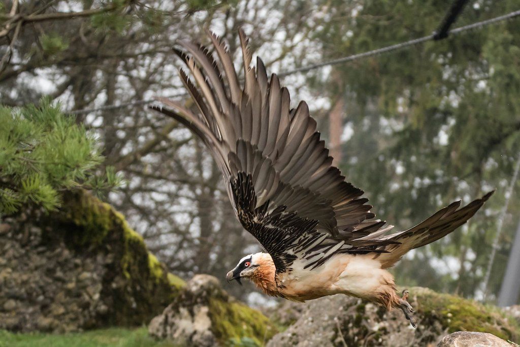Im Tierpark finden Sie die Bartgeier gegenüber dem Wildschweingehege, wo die Vögel zusammen mit den Schneehasen eine Voliere bewohnen. Da sie aber nur Aas und Knochen fressen, stellen sie für die Schneehasen keine Gefahr dar.