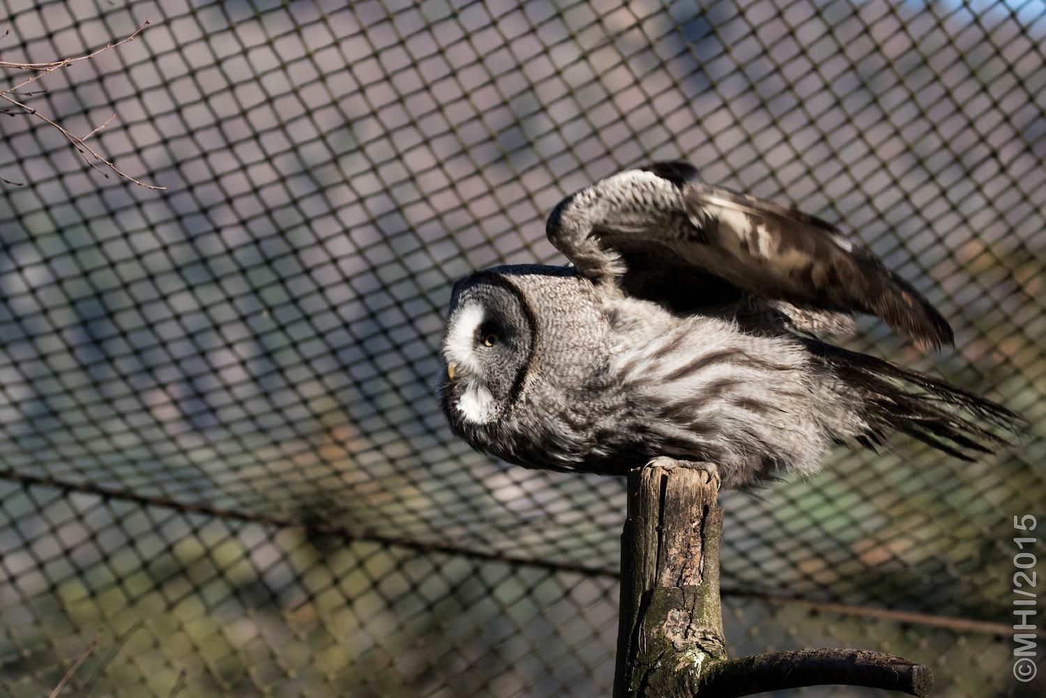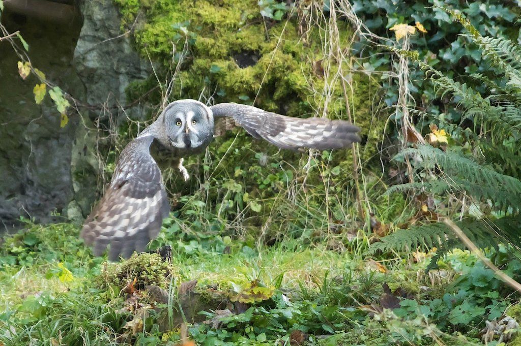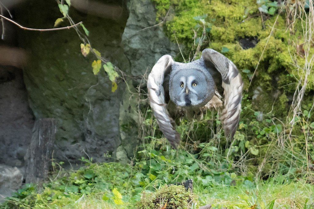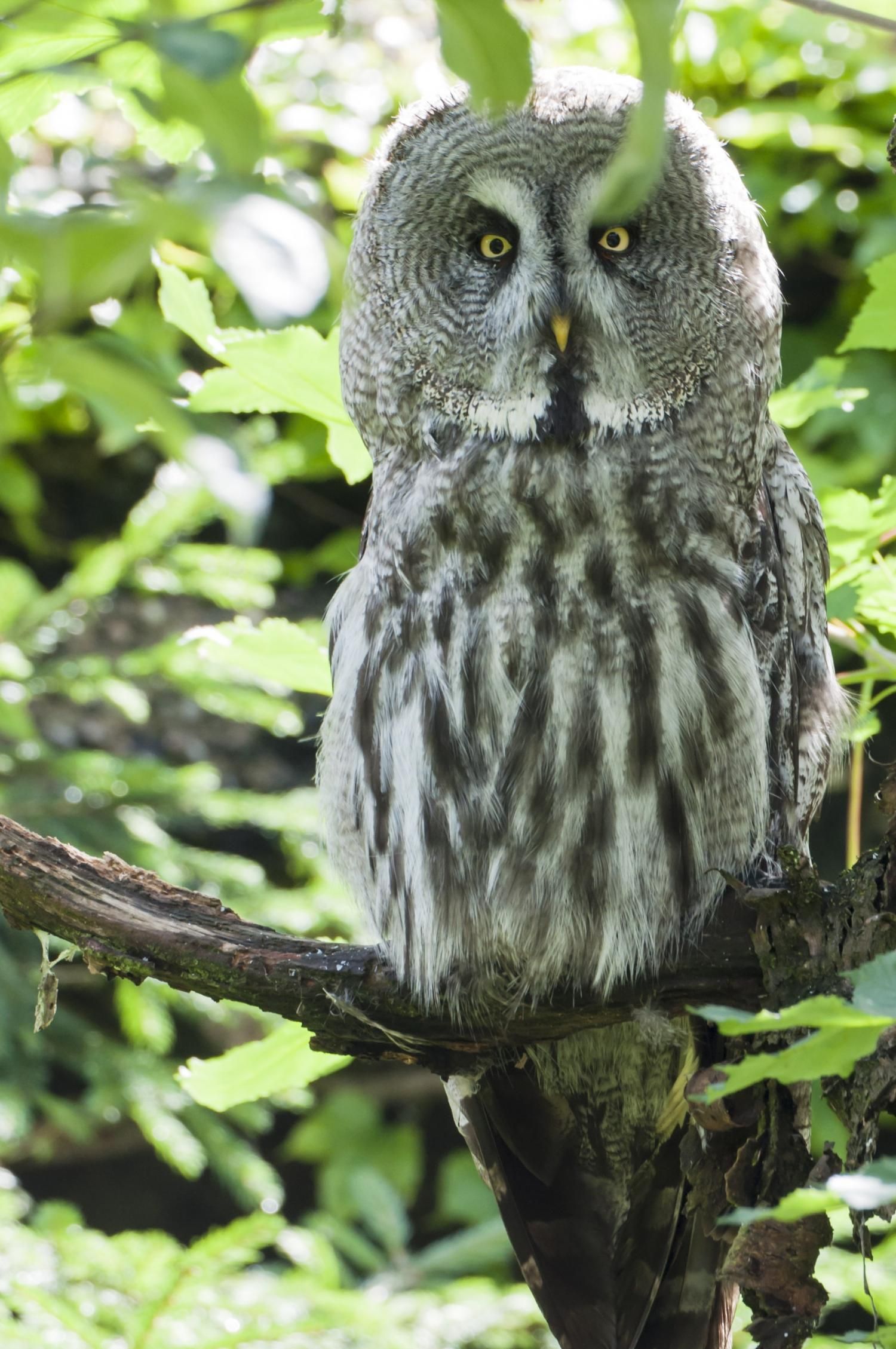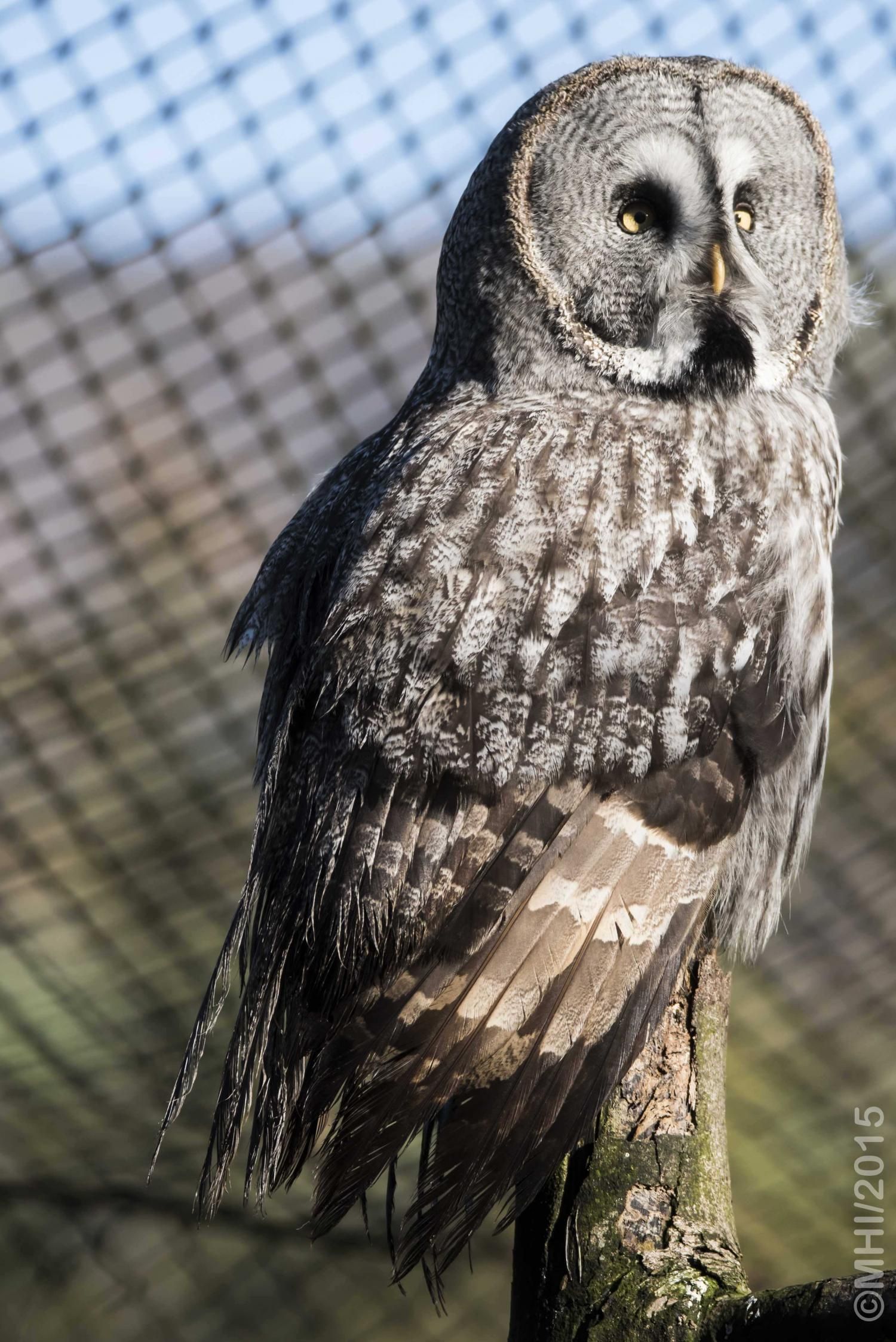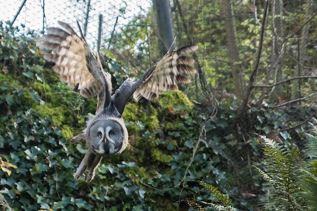 Der Bartkauz ist ein Bewohner der nordischen Wälder. Meist sitzt er unbeweglich auf einem erhöhten Standpunkt und späht nach Wühlmäusen, seiner bevorzugten Nahrung. Mit einer Grösse von fast siebzig Zentimetern ist der Bartkauz eine der grössten Eulenarten. Trotz seiner Grösse gleitet er ruhig und geschickt durch die Wälder. Seine grosse, fast kreisrunde Gesichtsmaske verleiht ihm einen etwas starren Ausdruck. Typisch sind die feinen jahresringähnlichen Linien im Muster der Gesichtsmaske. Seinen Namen hat er von einem Büschel schwarzer Federn unter dem Schnabel. Dieser so genannte „Bart“ sticht aus dem ansonsten grauen Gefieder hervor. Obwohl beinahe so gross wie der Uhu, ist der Bartkauz bedeutend leichter. Ein Grossteil seines Körpervolumens besteht aus Federn. Anders als viele seiner Verwandten trifft man den Bartkauz auch am helllichten Tage aktiv an. Hat er einmal eine Beute gesichtet, so ist er darauf so konzentriert, dass er sich bei der Jagd ungestört beobachten lässt. Vermutlich leben Bartkäuze in „Dauerehe“. Das Weibchen ist, wie bei den meisten Eulen, deutlich grösser als das Männchen. Gebrütet wird in verlassenen Greifvogelnestern oder in Baumstümpfen, seltener in selbst gescharrten Bodenmulden. Die geschlüpften Jungen (nach vier Wochen Brutzeit im Mai und Juni) bleiben bis zu 30 Tage im Nest. Wenn sie nach etwas mehr als 50 Tagen flügge sind, lassen sie sich meist noch bis Ende Oktober von ihren Eltern durchfüttern. In Jahren mit geringem Nahrungsangebot fällt die Brut manchmal auch aus. Bei uns im Tierpark Goldau lassen sich unsere Bartkäuze auch tagsüber gut in der Eulenvoliere beobachten. Sie teilen sich dort die Anlage problemlos mit verschiedenen kleineren Eulenarten.