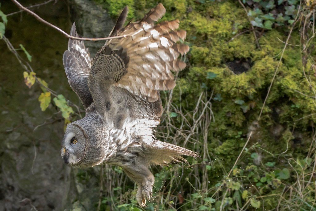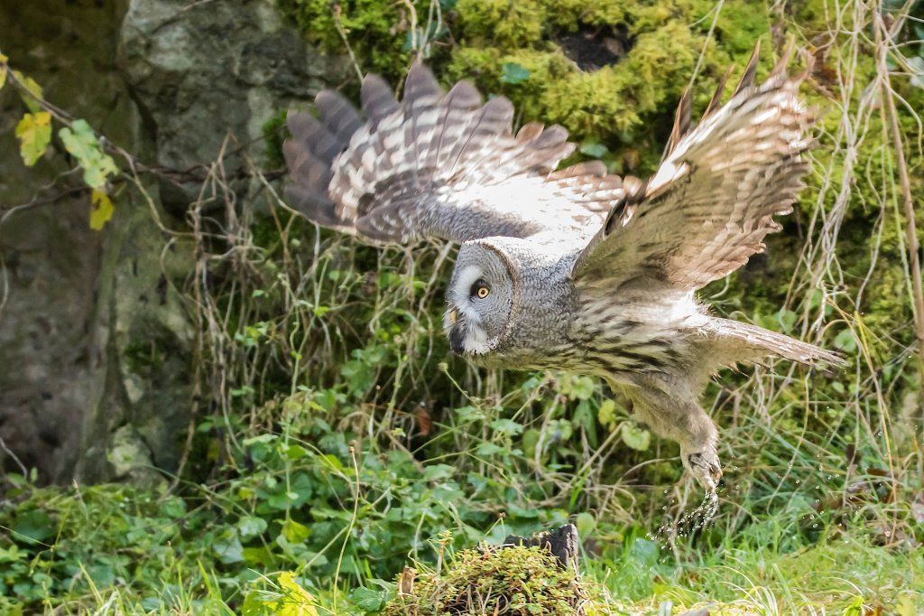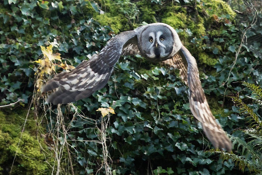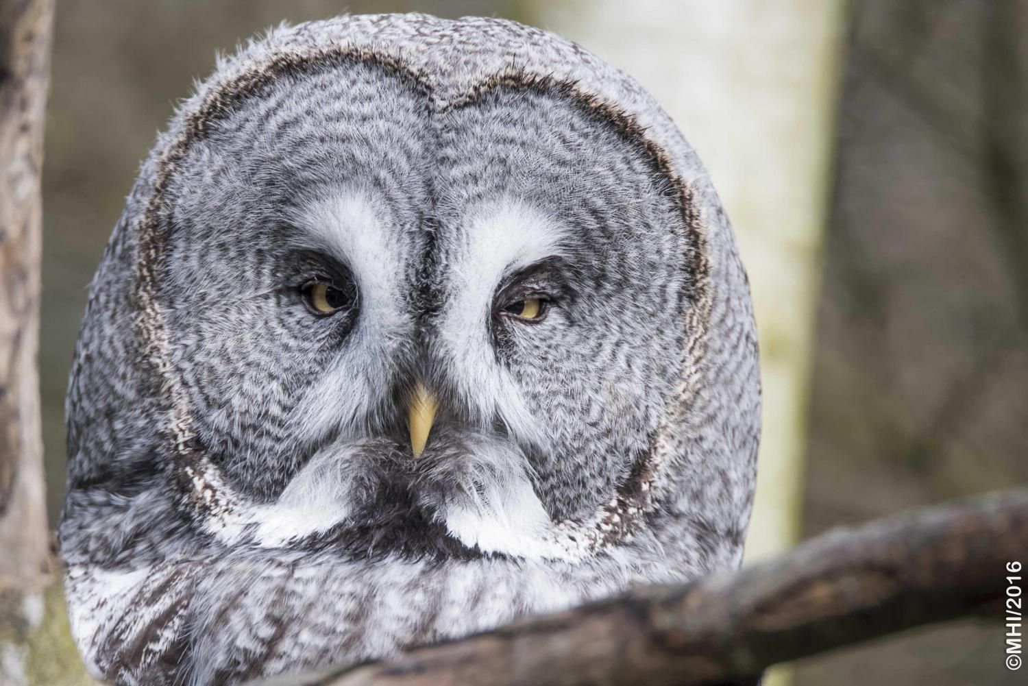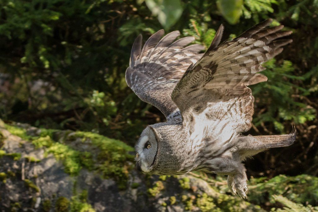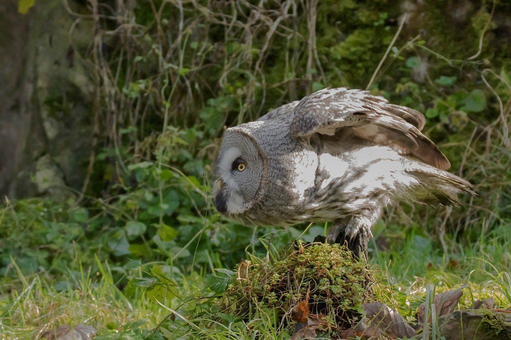 Der Bartkauz ist ein Bewohner der nordischen Wälder. Meist sitzt er unbeweglich auf einem erhöhten Standpunkt und späht nach Wühlmäusen, seiner bevorzugten Nahrung. Mit einer Grösse von fast siebzig Zentimetern ist der Bartkauz eine der grössten Eulenarten. Trotz seiner Grösse gleitet er ruhig und geschickt durch die Wälder. Seine grosse, fast kreisrunde Gesichtsmaske verleiht ihm einen etwas starren Ausdruck. Typisch sind die feinen jahresringähnlichen Linien im Muster der Gesichtsmaske. Seinen Namen hat er von einem Büschel schwarzer Federn unter dem Schnabel. Dieser so genannte „Bart“ sticht aus dem ansonsten grauen Gefieder hervor. Obwohl beinahe so gross wie der Uhu, ist der Bartkauz bedeutend leichter. Ein Grossteil seines Körpervolumens besteht aus Federn. Anders als viele seiner Verwandten trifft man den Bartkauz auch am helllichten Tage aktiv an. Hat er einmal eine Beute gesichtet, so ist er darauf so konzentriert, dass er sich bei der Jagd ungestört beobachten lässt. Vermutlich leben Bartkäuze in „Dauerehe“. Das Weibchen ist, wie bei den meisten Eulen, deutlich grösser als das Männchen. Gebrütet wird in verlassenen Greifvogelnestern oder in Baumstümpfen, seltener in selbst gescharrten Bodenmulden. Die geschlüpften Jungen (nach vier Wochen Brutzeit im Mai und Juni) bleiben bis zu 30 Tage im Nest. Wenn sie nach etwas mehr als 50 Tagen flügge sind, lassen sie sich meist noch bis Ende Oktober von ihren Eltern durchfüttern. In Jahren mit geringem Nahrungsangebot fällt die Brut manchmal auch aus. Bei uns im Tierpark Goldau lassen sich unsere Bartkäuze auch tagsüber gut in der Eulenvoliere beobachten. Sie teilen sich dort die Anlage problemlos mit verschiedenen kleineren Eulenarten.