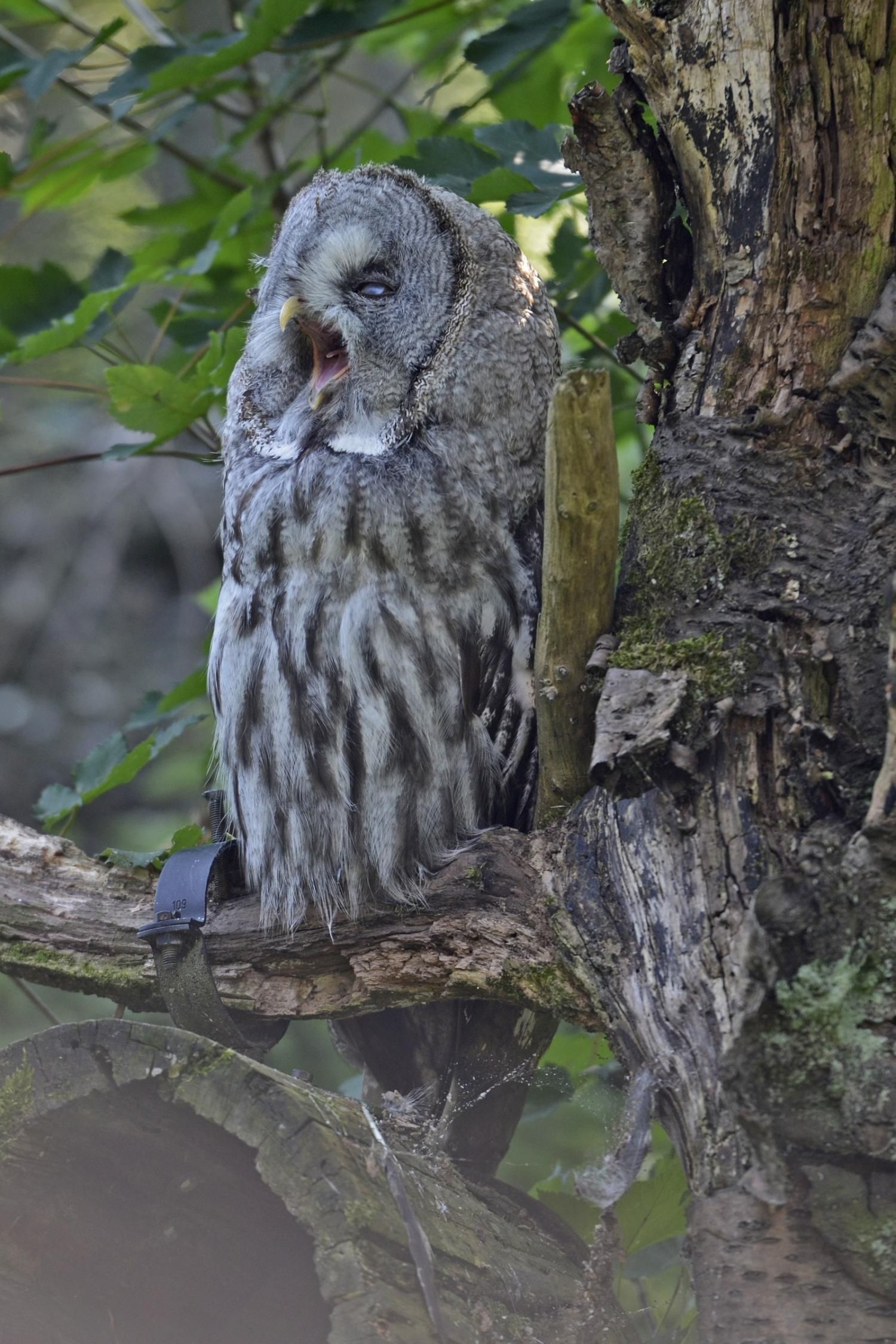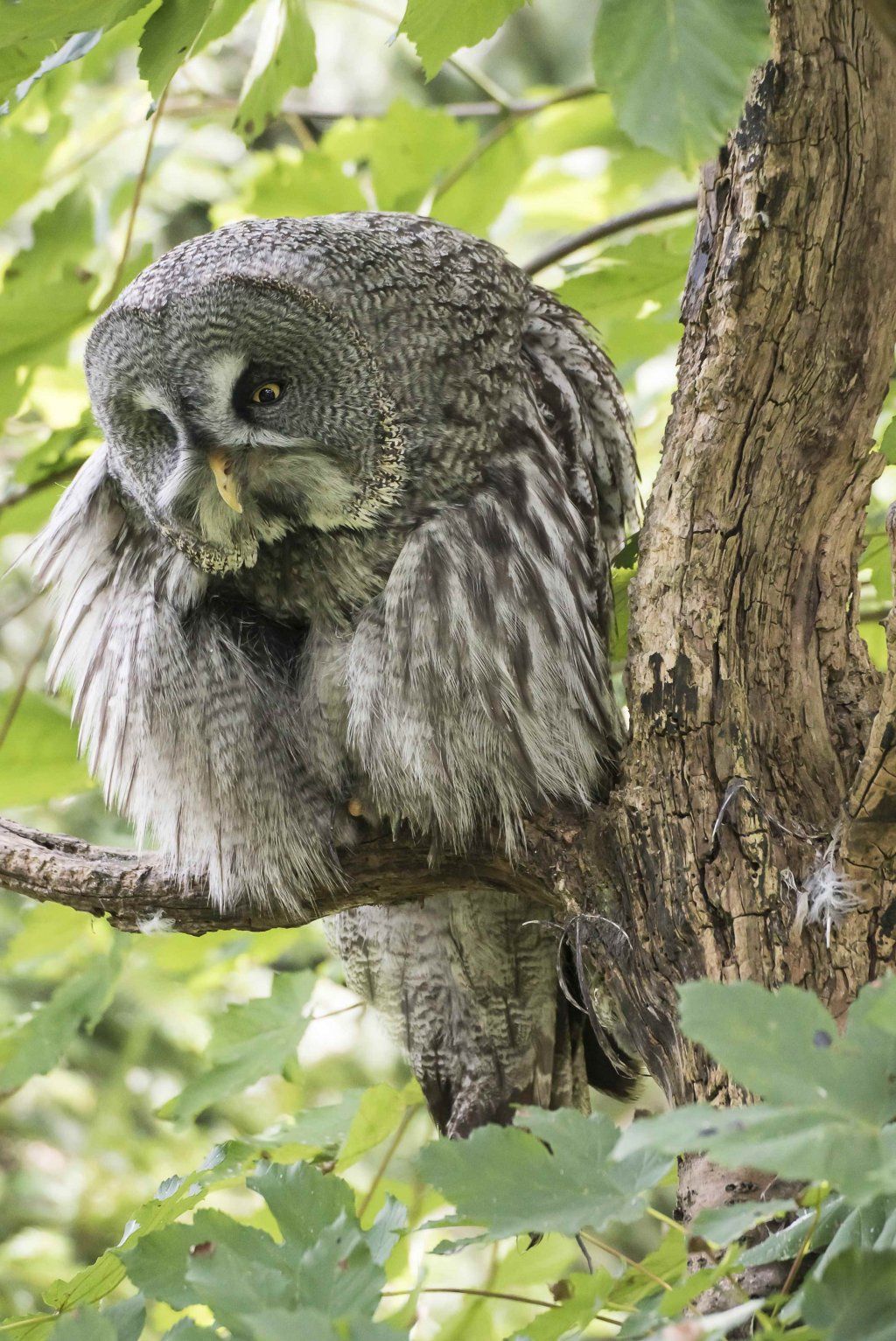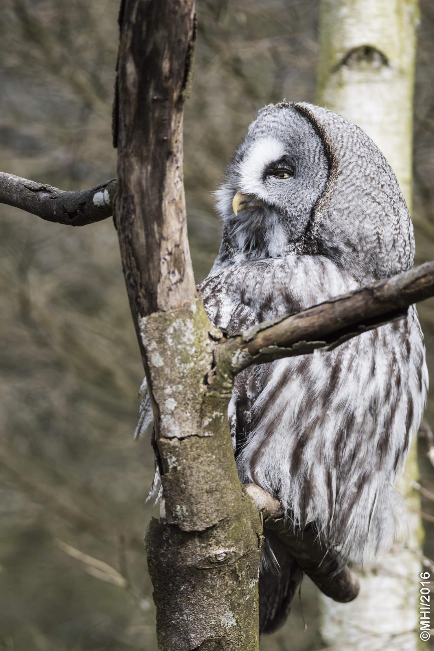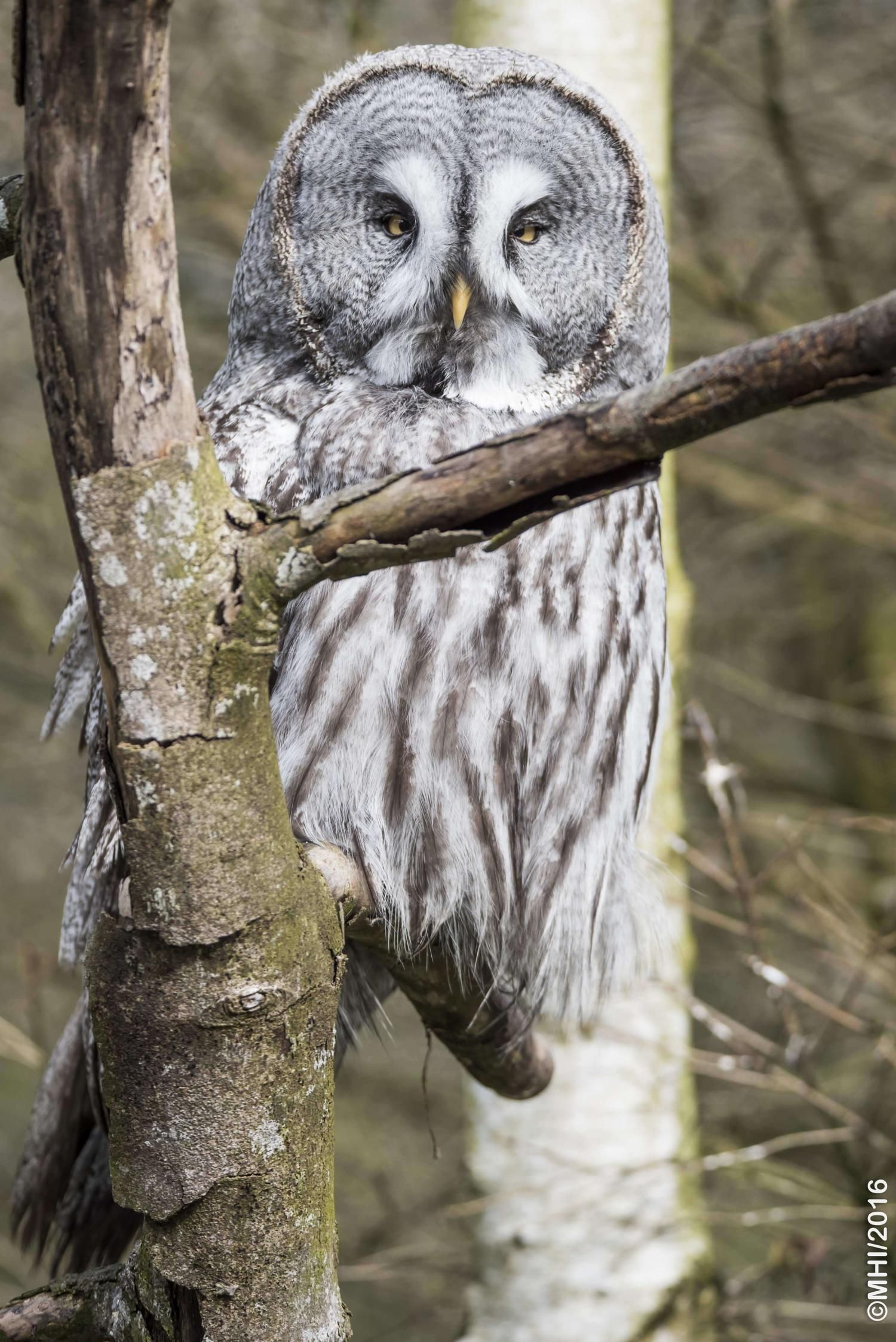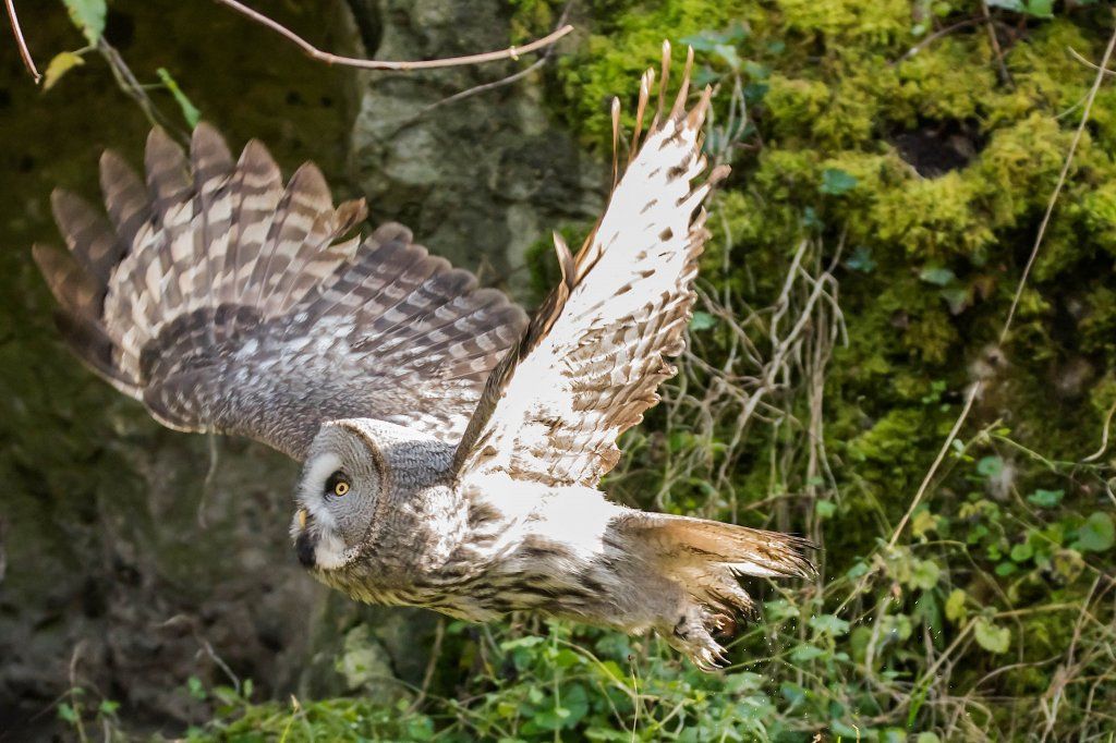 Der Bartkauz ist ein Bewohner der nordischen Wälder. Meist sitzt er unbeweglich auf einem erhöhten Standpunkt und späht nach Wühlmäusen, seiner bevorzugten Nahrung. Mit einer Grösse von fast siebzig Zentimetern ist der Bartkauz eine der grössten Eulenarten. Trotz seiner Grösse gleitet er ruhig und geschickt durch die Wälder. Seine grosse, fast kreisrunde Gesichtsmaske verleiht ihm einen etwas starren Ausdruck. Typisch sind die feinen jahresringähnlichen Linien im Muster der Gesichtsmaske. Seinen Namen hat er von einem Büschel schwarzer Federn unter dem Schnabel. Dieser so genannte „Bart“ sticht aus dem ansonsten grauen Gefieder hervor. Obwohl beinahe so gross wie der Uhu, ist der Bartkauz bedeutend leichter. Ein Grossteil seines Körpervolumens besteht aus Federn. Anders als viele seiner Verwandten trifft man den Bartkauz auch am helllichten Tage aktiv an. Hat er einmal eine Beute gesichtet, so ist er darauf so konzentriert, dass er sich bei der Jagd ungestört beobachten lässt. Vermutlich leben Bartkäuze in „Dauerehe“. Das Weibchen ist, wie bei den meisten Eulen, deutlich grösser als das Männchen. Gebrütet wird in verlassenen Greifvogelnestern oder in Baumstümpfen, seltener in selbst gescharrten Bodenmulden. Die geschlüpften Jungen (nach vier Wochen Brutzeit im Mai und Juni) bleiben bis zu 30 Tage im Nest. Wenn sie nach etwas mehr als 50 Tagen flügge sind, lassen sie sich meist noch bis Ende Oktober von ihren Eltern durchfüttern. In Jahren mit geringem Nahrungsangebot fällt die Brut manchmal auch aus. Bei uns im Tierpark Goldau lassen sich unsere Bartkäuze auch tagsüber gut in der Eulenvoliere beobachten. Sie teilen sich dort die Anlage problemlos mit verschiedenen kleineren Eulenarten.