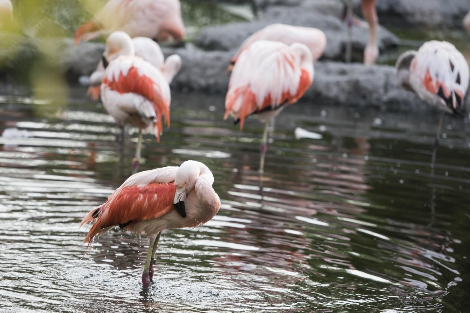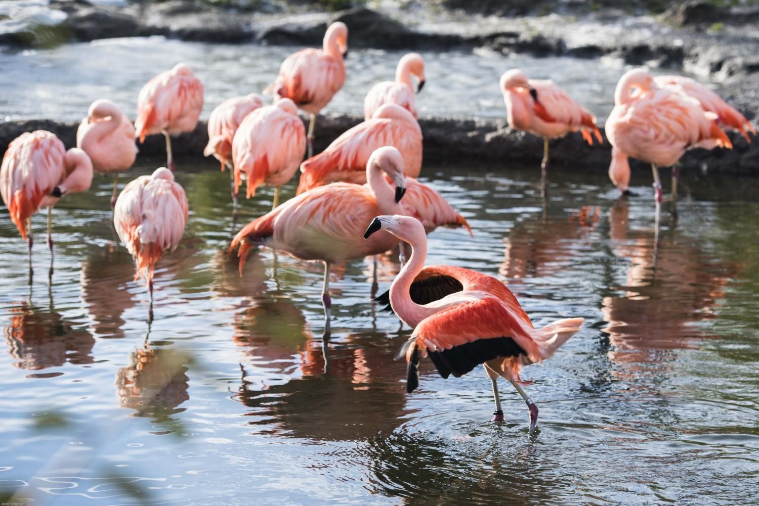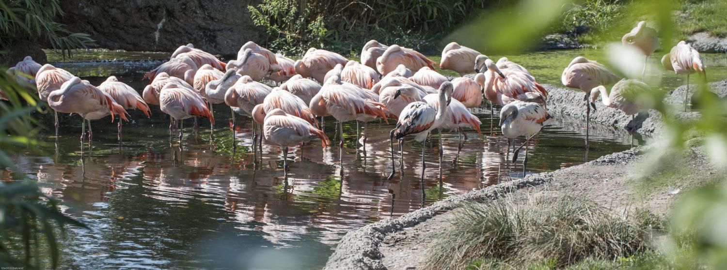Flamingos leben in grossen Kolonien und können sich nur in grösseren Gruppen fortpflanzen. Trotzdem sind sie Distanztiere. Die Ausstattung der Anlage im Zoo Zürich mit Schlickzonen, fliessendem Wasser, geschützten Lagen sowie Hügeln für den Nestbau erfüllt ihre Ansprüche. Beim Fressen filtern Flamingos unter anderem kleine Krebse aus dem Wasser. Der in den Kleinkrebsen enthaltene Farbstoff gibt den Tieren die schöne rote Färbung.