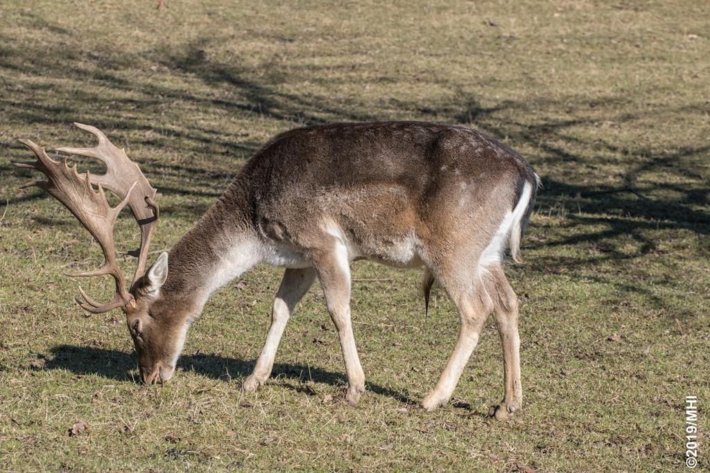 Der Damhirsch ist wie der Rothirsch ein Wiederkäuer. Er frisst Gräser, Kräuter, Knospen, Früchte und Blätter von Sträuchern und Bäumen. |