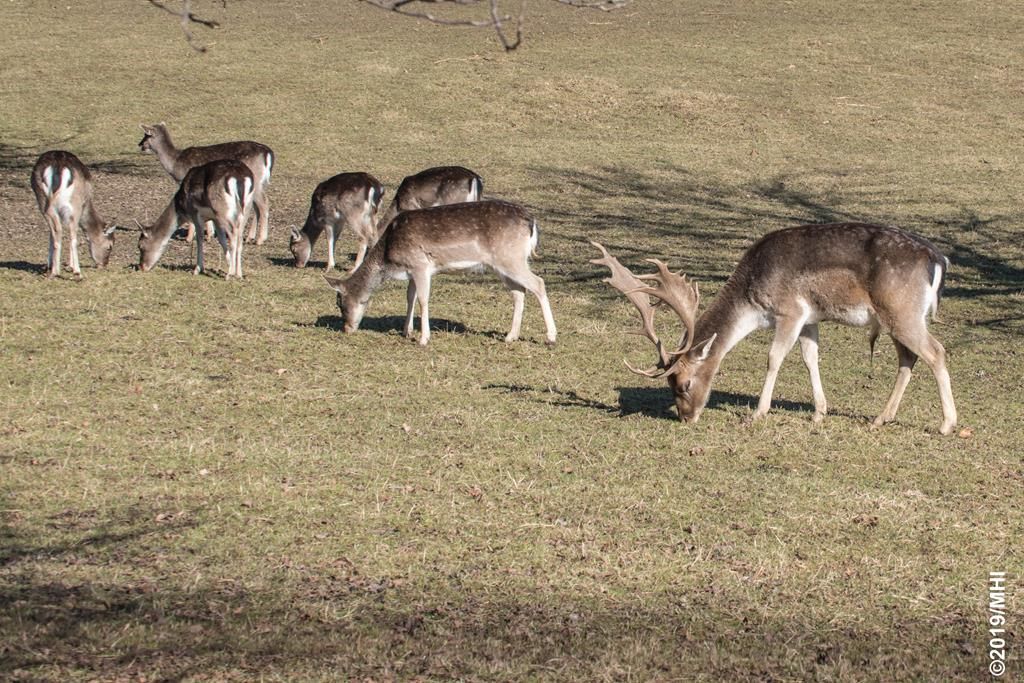 Damhirschkühe und Jungtiere leben ganzjärig in Rudeln. Die Stiere schliessen sich in der Brunftzeit den Rudeln an, sonst leben sie als Einzelgänger. |