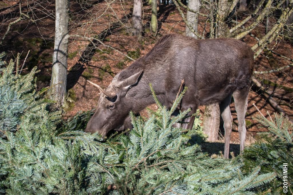 Der Elch frisst nur nährstoffreiche Pflanzen oder Pflanzenteile, vor allem Zweige, Blätter und Knospen von Salweiden, Pappeln und Birken; im Winter ausschliesslich von Nadelbäumen. Auf der Suche nach Wasserpflanzen kann er einige Meter tief tauchen. Er schliesst dabei seine Nasenlöcher. |