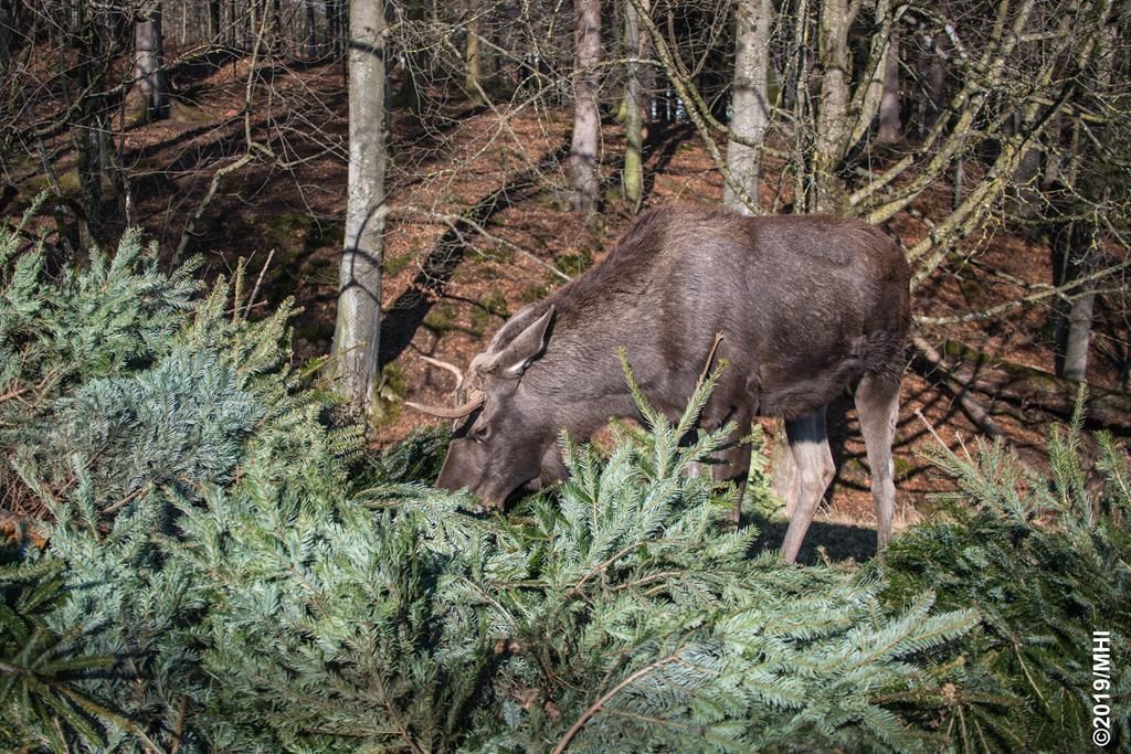Elche leben in Revieren von rund 500 Hektaren. Sie wandern auf der Suche nach Nahrung täglich viele Kilometer. Durch seine langen Beine kann der Elch bequem hohe Hindernisse übersteigen oder in hohem Schnee gehen, was für seine Feinde fast unmöglich ist. Als sehr alte Hirschform (Trughirsche) haben sie ein wenig entwickeltes Sozialverhalten und leben meist als Einzelgänger. Lediglich zur Brunftzeit schliessen sie sich zu kleinen Gruppen zusammen. Elche sind hervorragende Schwimmer mit einer Schwimmhaut zwischen den Hufen. |