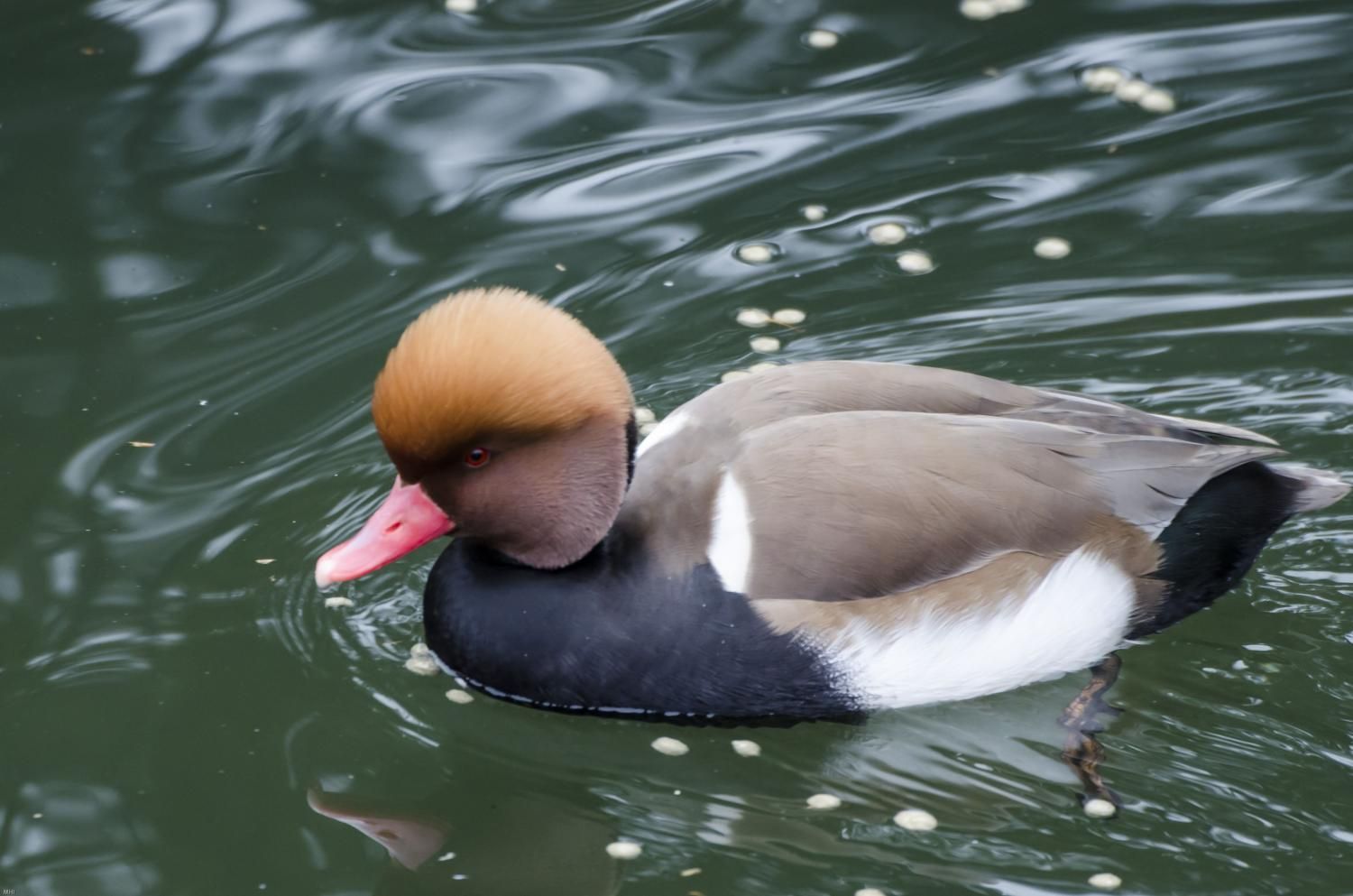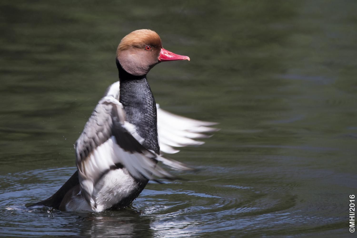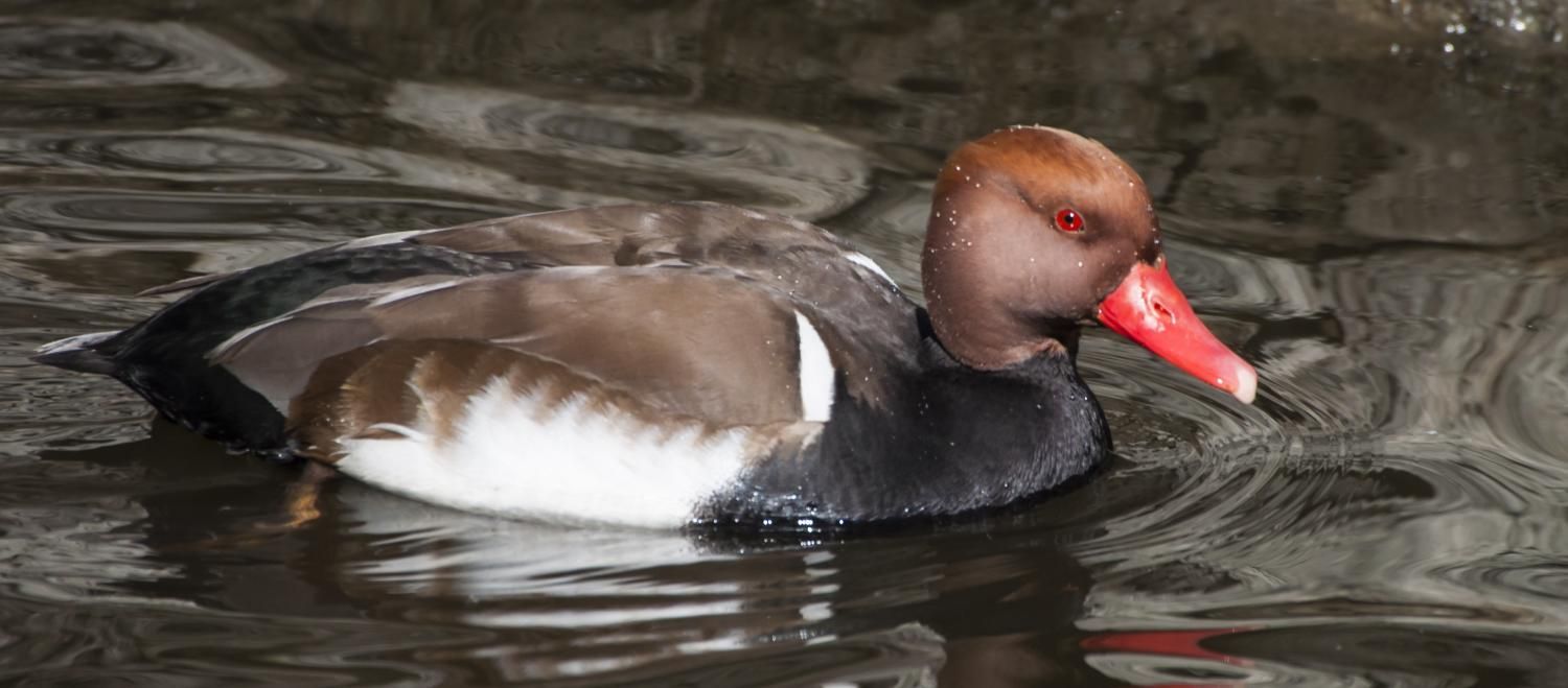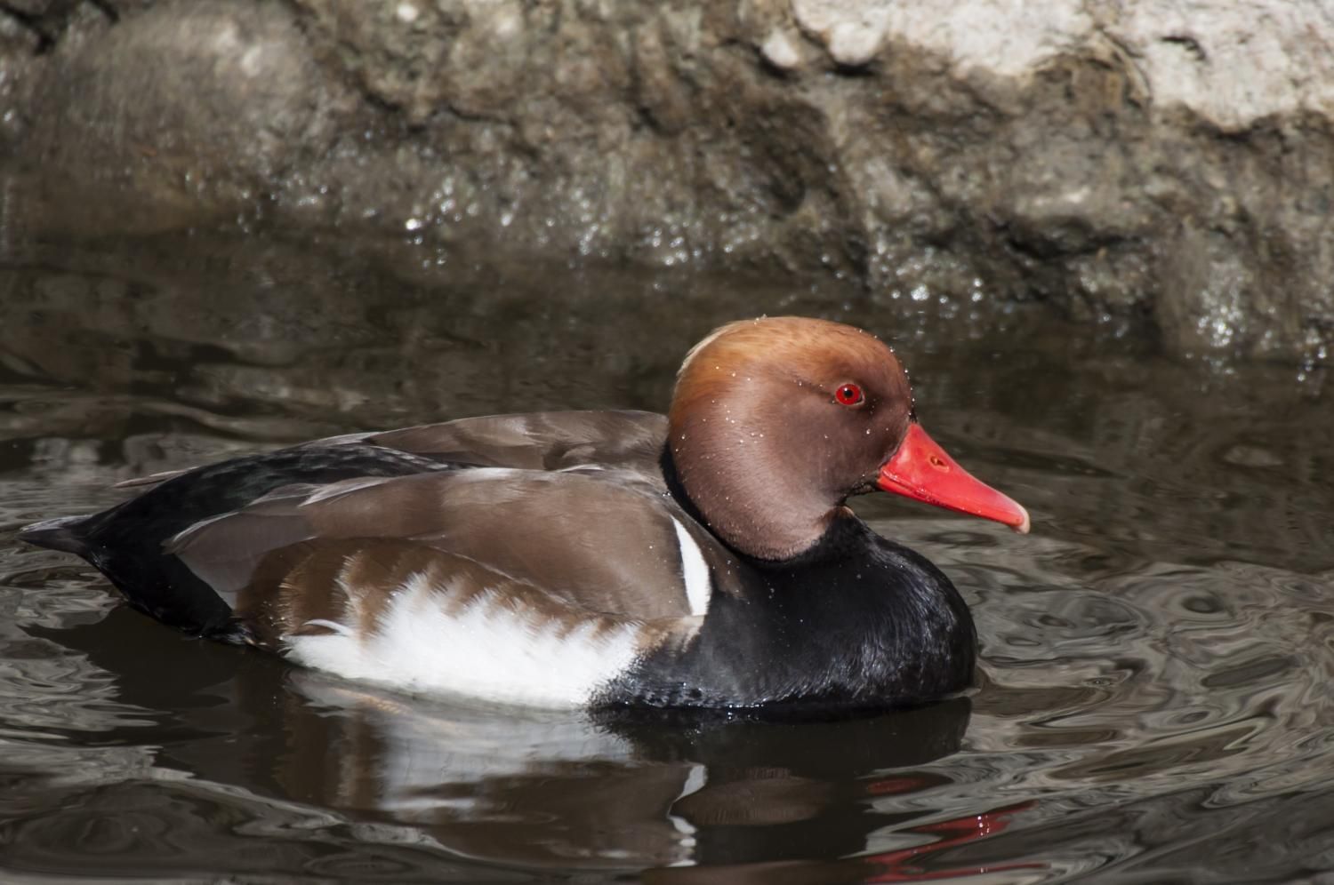 Die männliche Kolbenente erkennt man sofort an ihrem karminroten Schnabel. Kolbenenten finden sich als Zug- und Standvögel in ganz Mitteleuropa und Zentralasien. In der Schweiz brüten etwa 100 bis 200 Paare. Rund 20’000 Tiere überwintern hier, die meisten auf den vier grössten Seen der Schweiz. Als ausgesprochener Pflanzenfresser ist die Kolbenente an Flachseen mit üppigem Pflanzenbewuchs gebunden. Bevorzugte Brutbiotope sind grosse, flache Binnenseen mit breiten Rohrkanten, Schilfinseln und reicher Unterwasserflora. Die Kolbenente nimmt in erster Linie Algen und Laichkräuter sowie andere Wasserpflanzen auf. Ihre Nahrung nimmt sie tauchend auf, wobei sie bis zu 30 Sekunden unter Wasser bleiben kann. Bei Bedarf wird nur an der Oberfläche „gegründelt“. Dabei befindet sich der Kopf unter Wasser, die hintere Körperhälfte ragt steil aus dem Wasser. Das Nest wird immer in Wassernähe, meist auf einer erhöhten Stelle, inmitten hoher Ufervegetation errichtet. Manchmal befindet es sich am Ende eines schmalen Pfades, auf dem die Ente ungesehen zum Wasser gelangt. Während das Weibchen während 26-28 Tagen die 6-12 Eier bebrütet, bleibt das Männchen stets wachend in Nestnähe. Gegen Ende der Brutzeit sammeln sich die Männchen zur Mauser auf bestimmten Gewässern. Die Jungtiere werden nach dem Schlüpfen während 50-65 Tagen vom Weibchen allein aufgezogen. Kolbenenten sind anspruchslos, robust und relativ kälteunempfindlich. Wegen des ruhigen Wesens werden diese Enten gern als Brut- oder Aufzuchtammen anderer Arten genutzt. Im Tierpark sind die Kolbenenten auf dem Waldweiher zu beobachten.