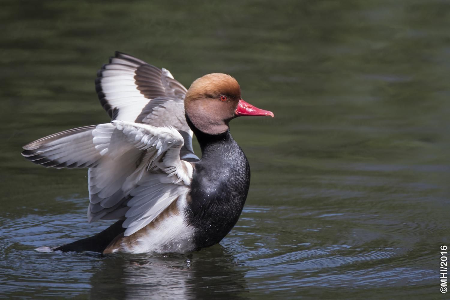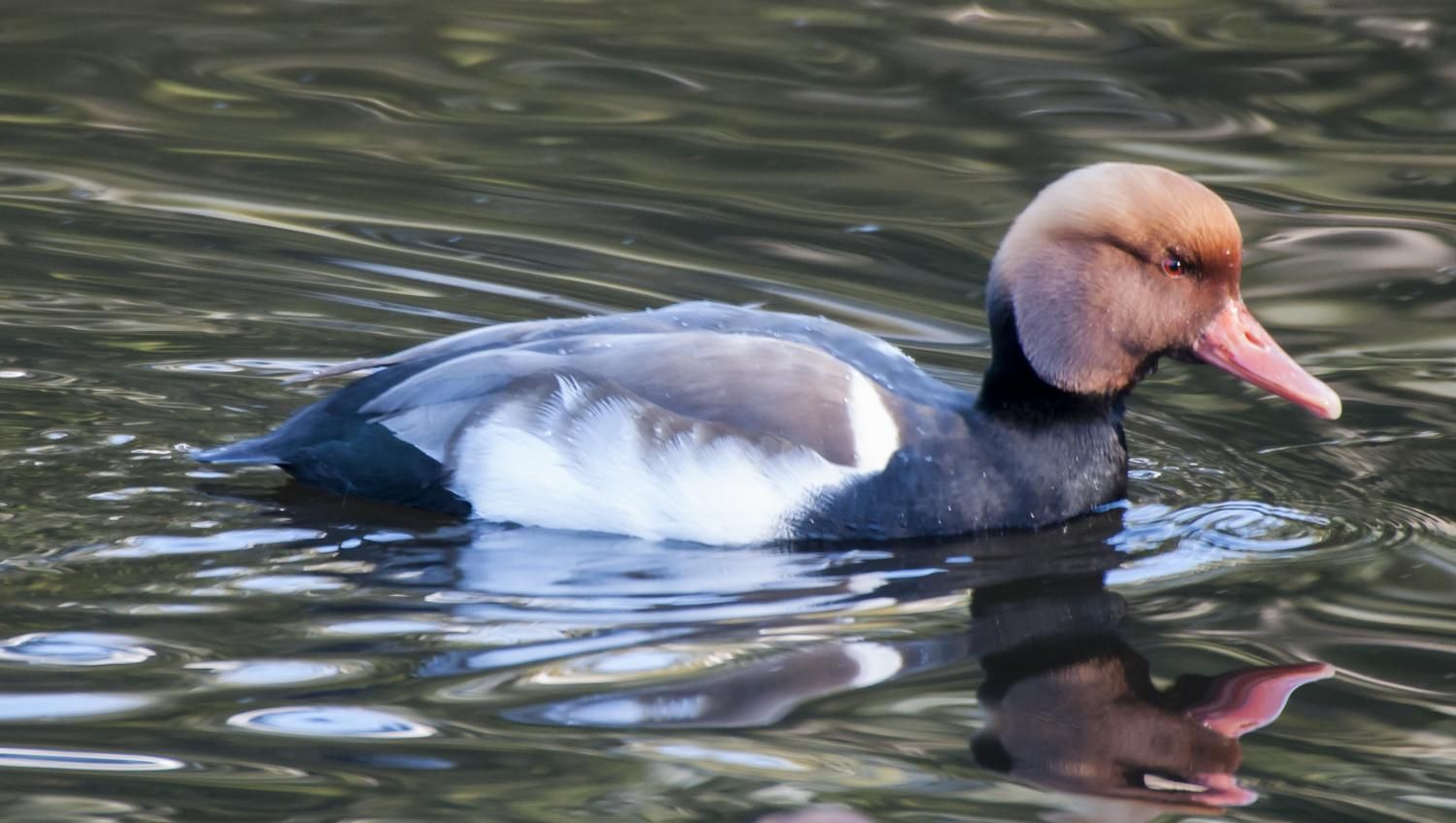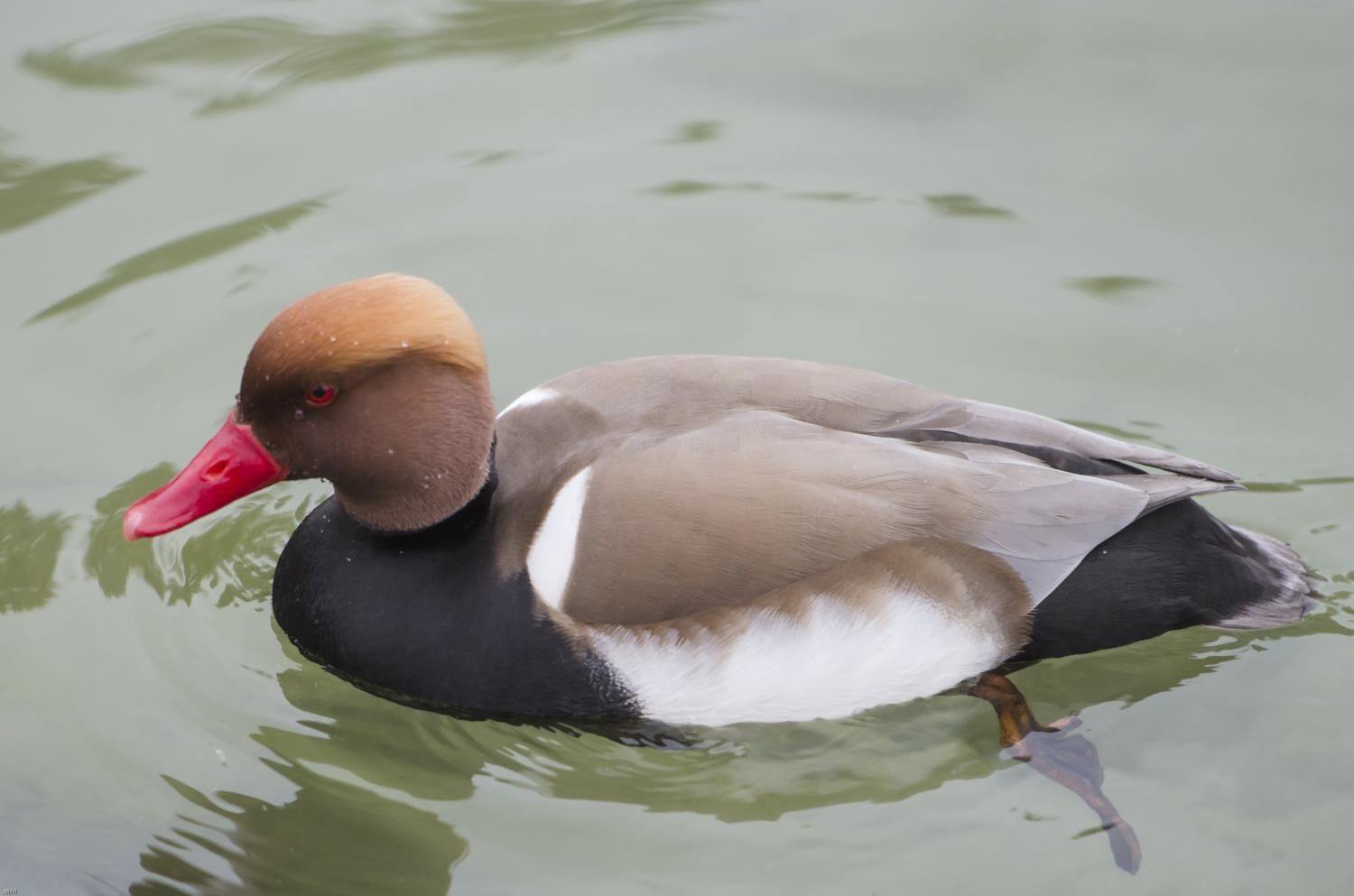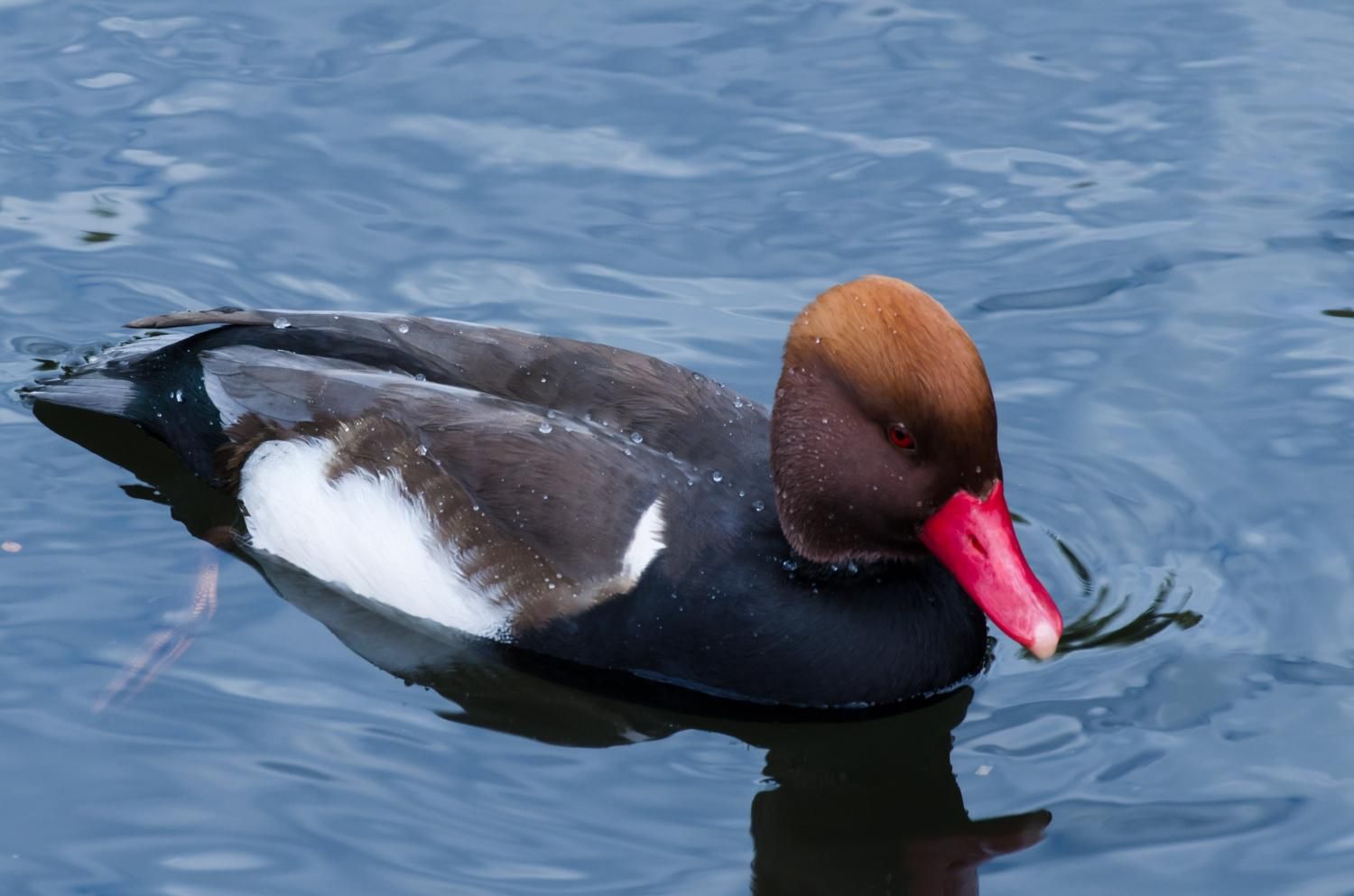 Die männliche Kolbenente erkennt man sofort an ihrem karminroten Schnabel. Kolbenenten finden sich als Zug- und Standvögel in ganz Mitteleuropa und Zentralasien. In der Schweiz brüten etwa 100 bis 200 Paare. Rund 20’000 Tiere überwintern hier, die meisten auf den vier grössten Seen der Schweiz. Als ausgesprochener Pflanzenfresser ist die Kolbenente an Flachseen mit üppigem Pflanzenbewuchs gebunden. Bevorzugte Brutbiotope sind grosse, flache Binnenseen mit breiten Rohrkanten, Schilfinseln und reicher Unterwasserflora. Die Kolbenente nimmt in erster Linie Algen und Laichkräuter sowie andere Wasserpflanzen auf. Ihre Nahrung nimmt sie tauchend auf, wobei sie bis zu 30 Sekunden unter Wasser bleiben kann. Bei Bedarf wird nur an der Oberfläche „gegründelt“. Dabei befindet sich der Kopf unter Wasser, die hintere Körperhälfte ragt steil aus dem Wasser. Das Nest wird immer in Wassernähe, meist auf einer erhöhten Stelle, inmitten hoher Ufervegetation errichtet. Manchmal befindet es sich am Ende eines schmalen Pfades, auf dem die Ente ungesehen zum Wasser gelangt. Während das Weibchen während 26-28 Tagen die 6-12 Eier bebrütet, bleibt das Männchen stets wachend in Nestnähe. Gegen Ende der Brutzeit sammeln sich die Männchen zur Mauser auf bestimmten Gewässern. Die Jungtiere werden nach dem Schlüpfen während 50-65 Tagen vom Weibchen allein aufgezogen. Kolbenenten sind anspruchslos, robust und relativ kälteunempfindlich. Wegen des ruhigen Wesens werden diese Enten gern als Brut- oder Aufzuchtammen anderer Arten genutzt. Im Tierpark sind die Kolbenenten auf dem Waldweiher zu beobachten.