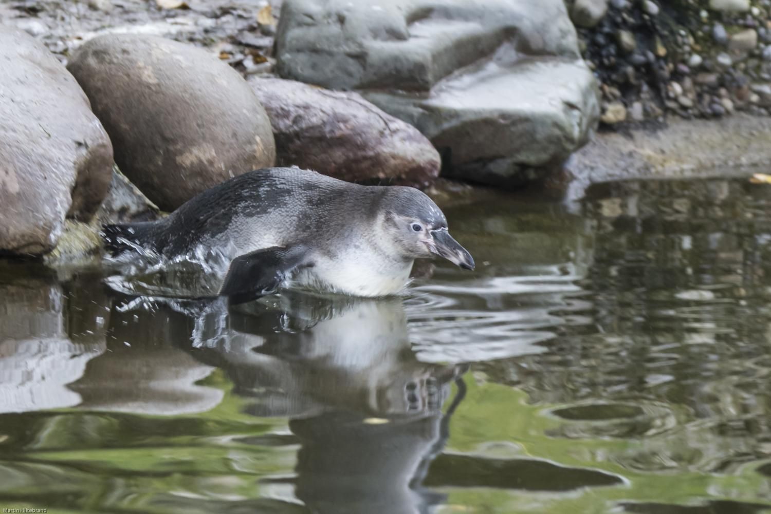 Pinguine tragen keine Haare, sondern Federn wie alle Vogelarten. Die einzelnen Humboldtpinguine kann man an ihrem Punktmuster auf der Brust eindeutig voneinander unterscheiden. Wie andere Koloniebrüter lassen sich auch Pinguine in zoologischen Gärten nur dann zur Fortpflanzung bringen, wenn sie in einer Gruppe gehalten werden. Je umfangreicher die Kolonie, desto grösser sind die Fortpflanzungserfolge. Die Paare brüten Jahr für Jahr in der gleichen Nisthöhle, die im Freiland in den Guano gegraben wird.