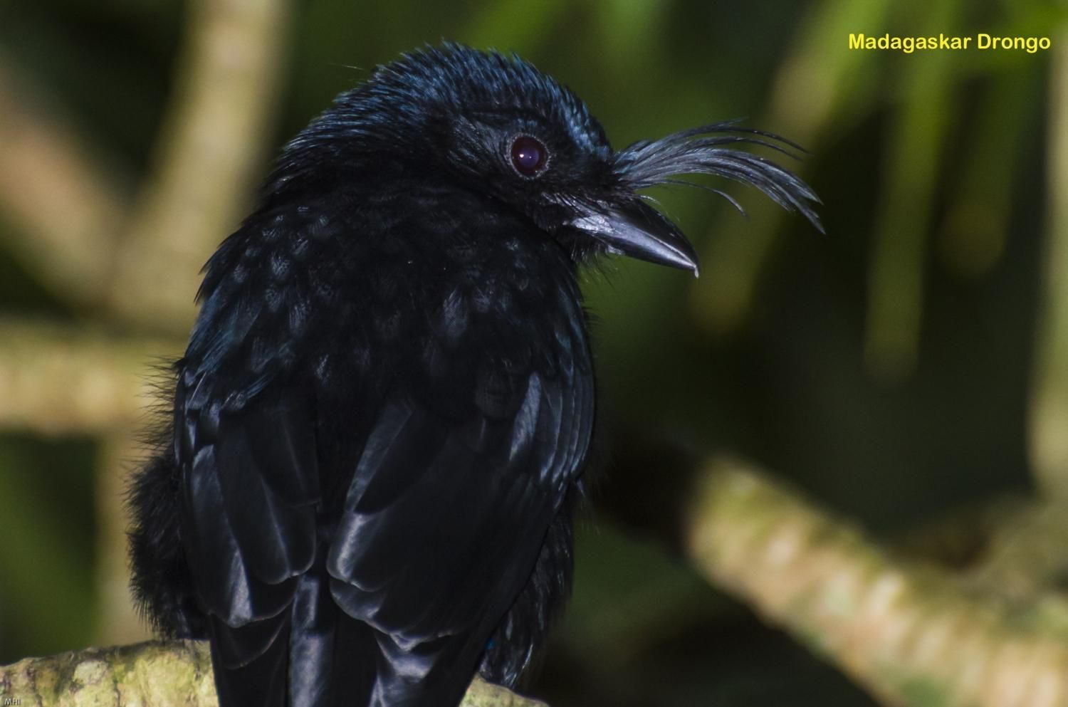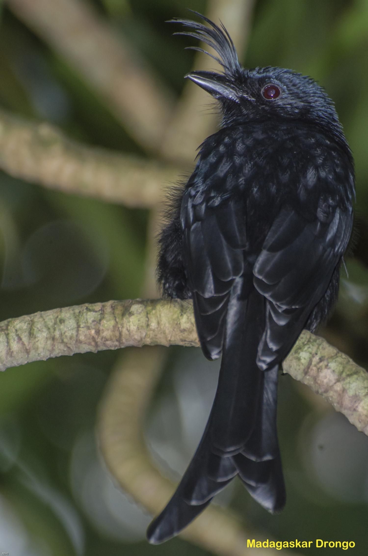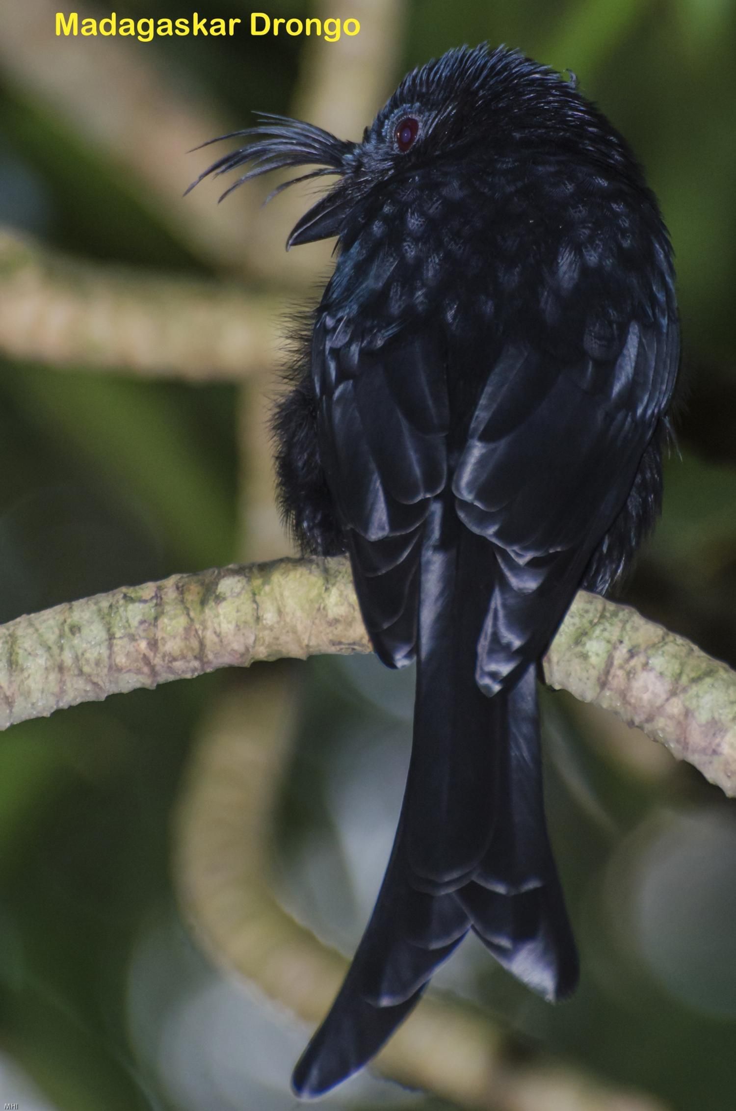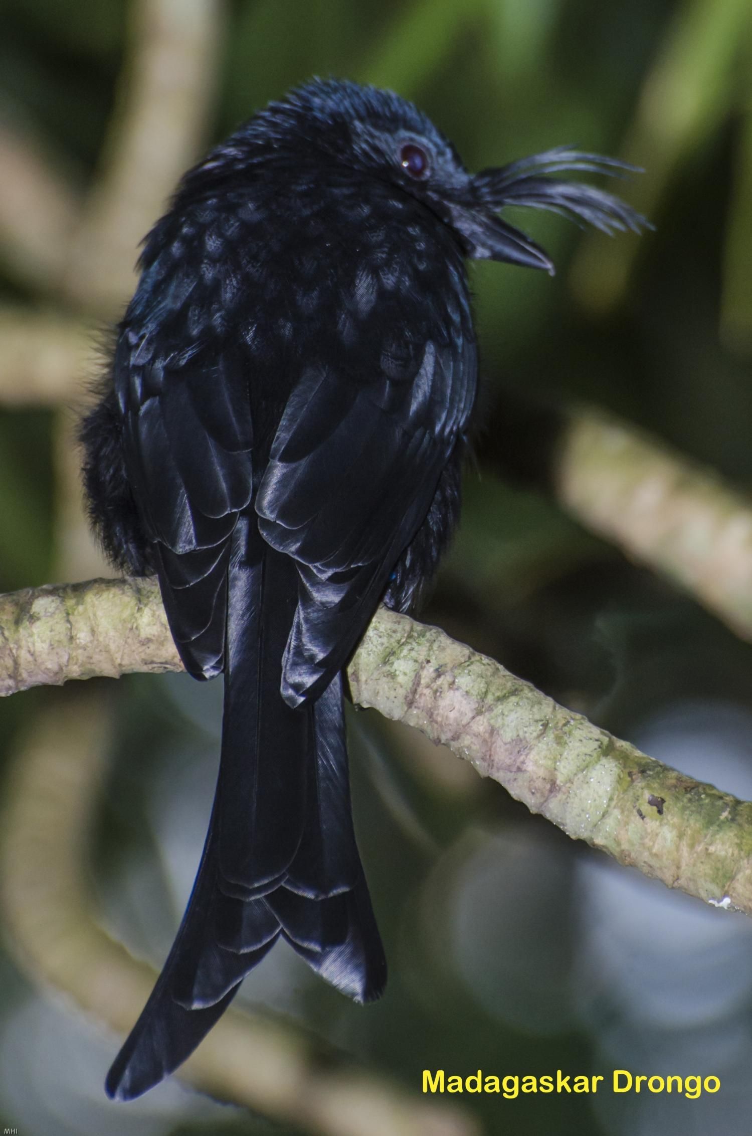 Typisch für den Madagaskar-Drongo sind die drei Federen die von der Schnabelbasis nach vorne stehen. Er ist fast vollständig schwarz befiedert und hat eine tiefrote Iris. Der Gesang des Madagaskar-Drongos ist sehr variabel. Häufig imitieren sie Gesänge anderer Vogelarten. In der Nähe von Dörfern imitieren sie sogar Haustiere und gackern wie Hühner oder miauen wie Katzen. Drongos sind auf Madagaskar nur mit einer Art, dem Madagaskar-Drongo, vertreten, der dort zu den endemischen Tierarten zählt.