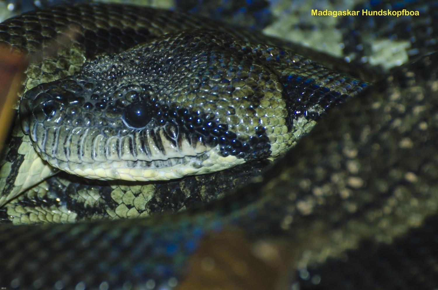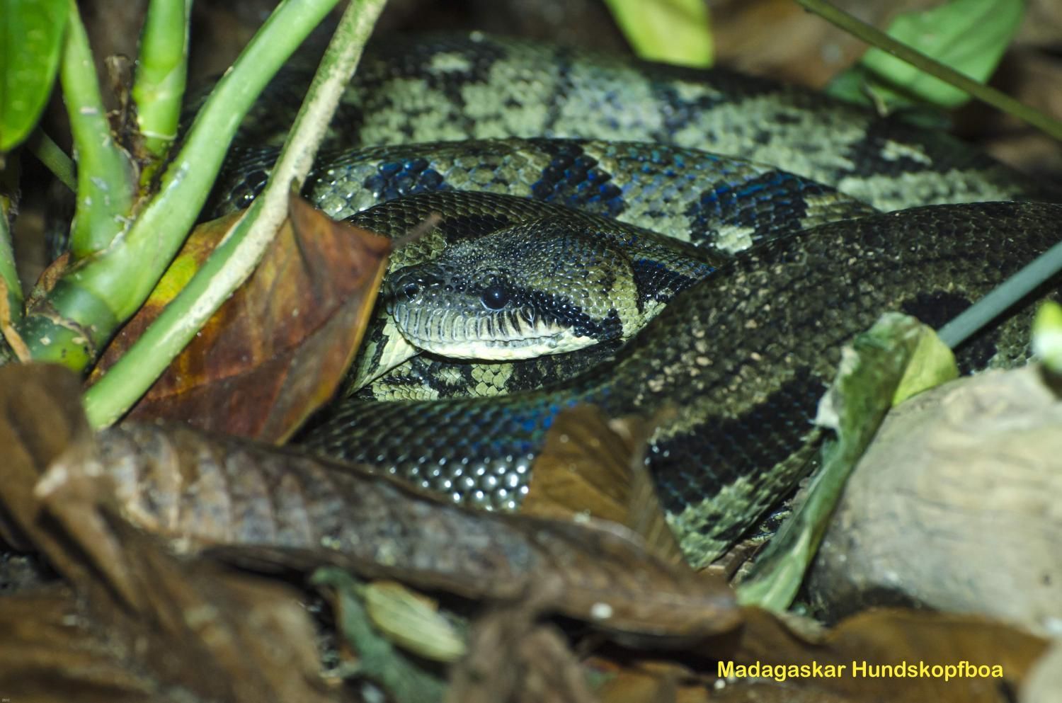 Von den drei madagassischen Riesenschlangenarten ist die Madagaskar-Hundskopfboa am häufigsten. Sie fühlt sich im Trockenwald und im feuchten Regenwald wohl. Sie versteckt sich im dichten Unterholz und in hohlen Wurzeln alter Bäume. Die bis zu 250 Zentimeter langen Schlangen sonnen sich bevorzugt am Boden oder in Bodennähe. Aktiv sind sie in der Nacht. Ihre Nahrung besteht aus Vögeln und kleinen Säugetieren wie Fledermäusen und Borstenigeln. Die Boas sind lebend gebärend. Nach rund fünf bis sechs Monaten Trächtigkeit werden 10 bis 14 Jungtiere geboren. In den ersten Lebenswochen sind die Jungen sehr aggressiv und schnappen nach allem, was sich bewegt. Erwachsene Hundskopfboas sind ruhiger. Die Tiere sind zwar nicht giftig, trotzdem kann ein Biss sehr schmerzhaft sein. Die Schlange hat nach dem Zubeissen die Gewohnheit, ihre Beute mit ihren Fangzähnen kräftig durchzukauen.