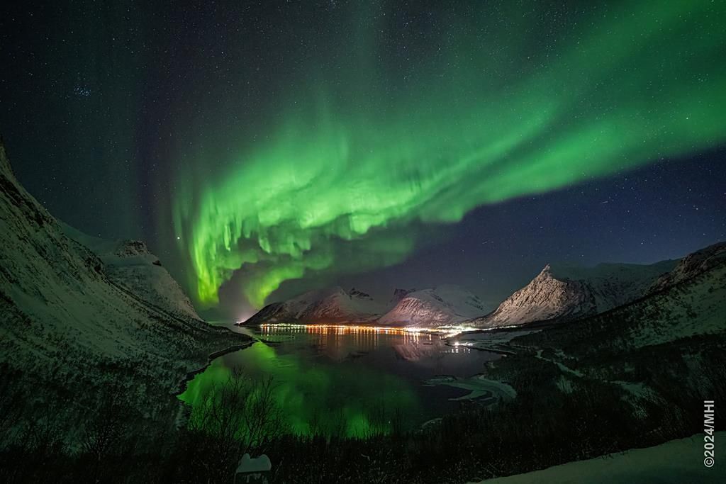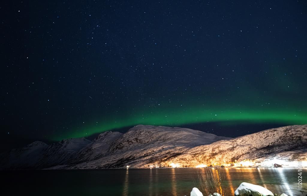Polarlicht vom Grotfjord aus, das Dorf Grotfjord ist am unteren Bildrand zu sehen.