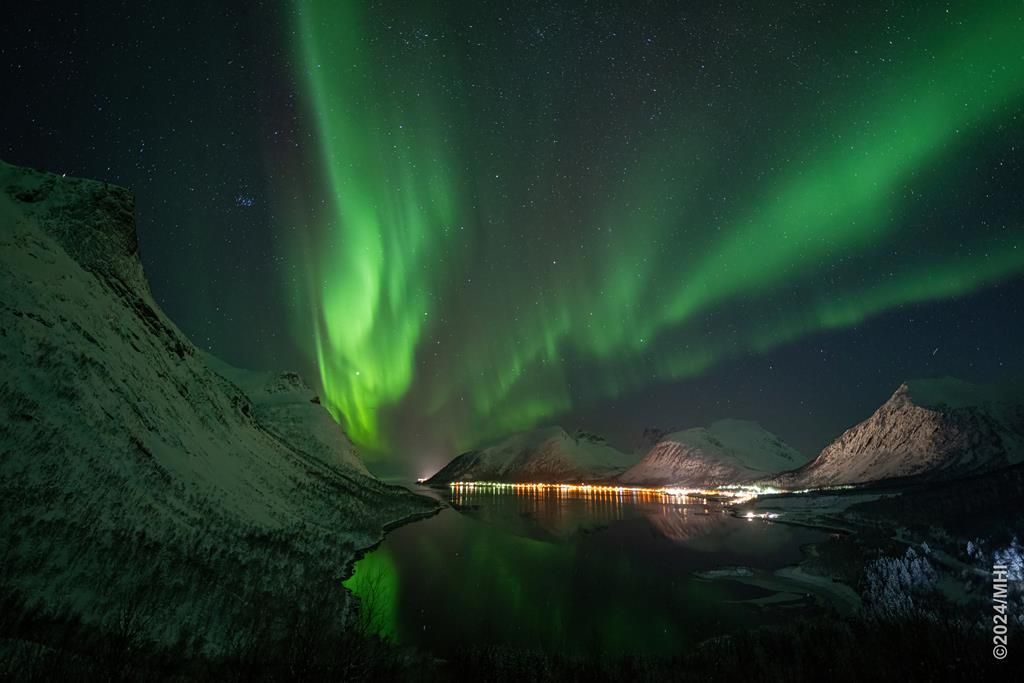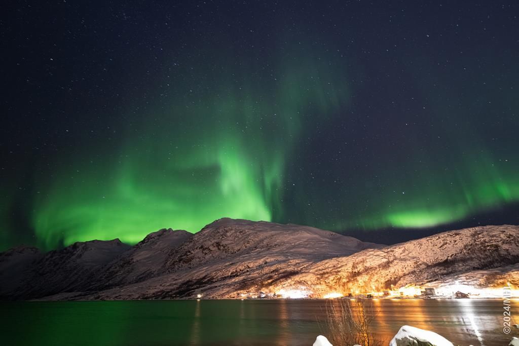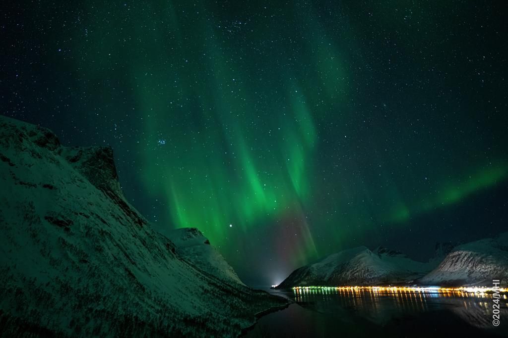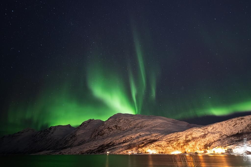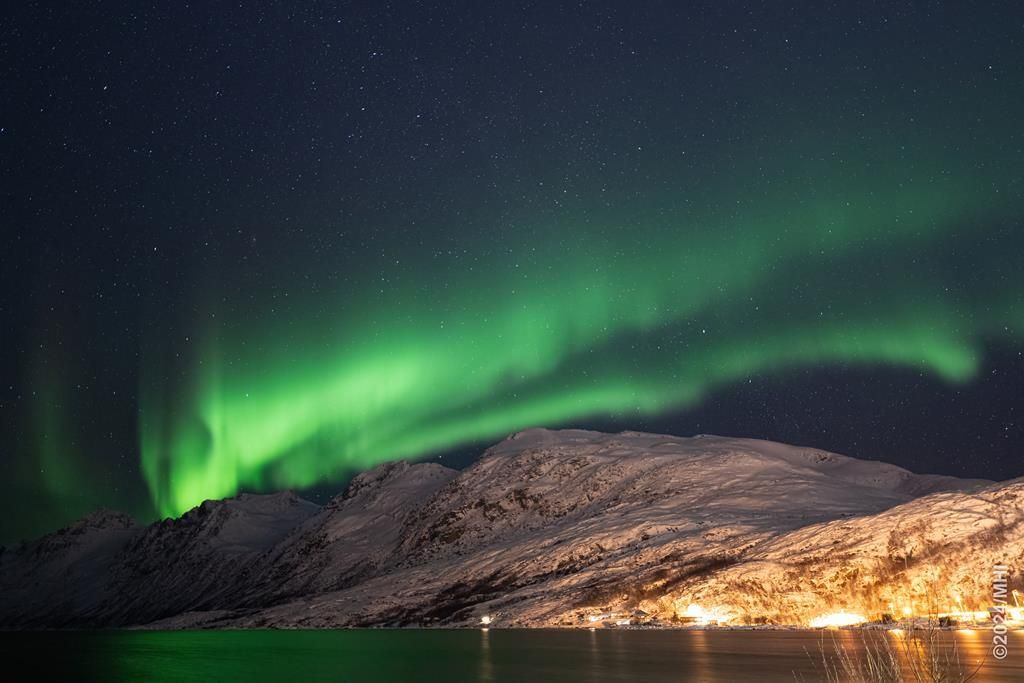 Polarlicht vom Tromtindvegan. Links sieht man das Dorf Tromvik, rechts die Insel Vengsoya.