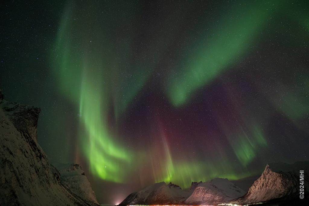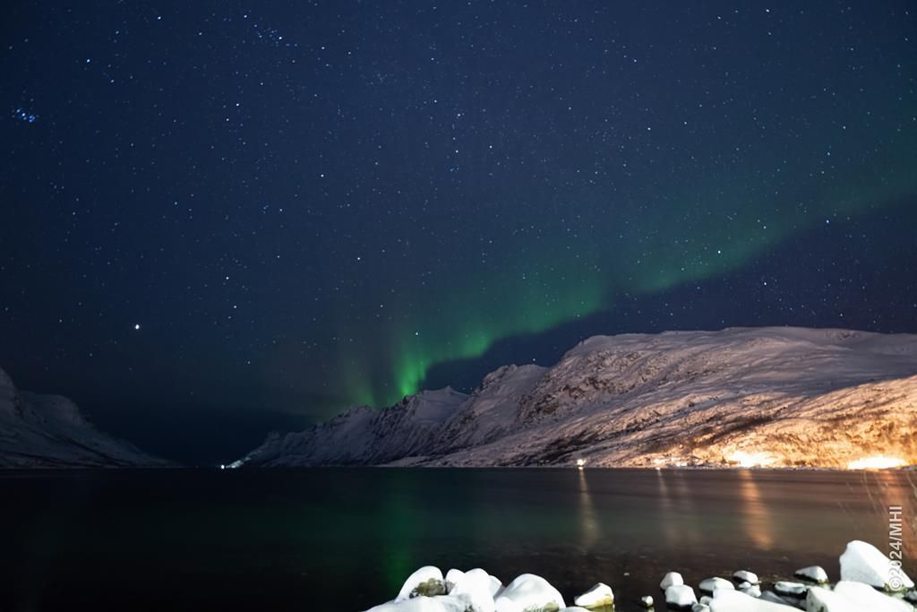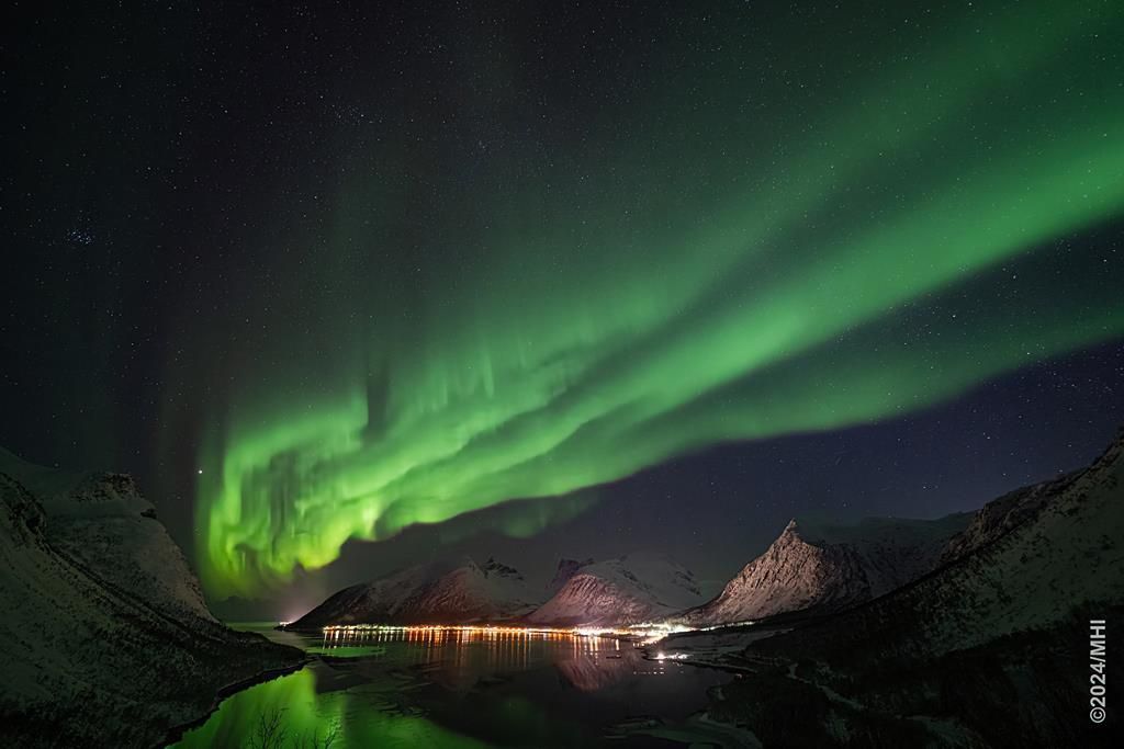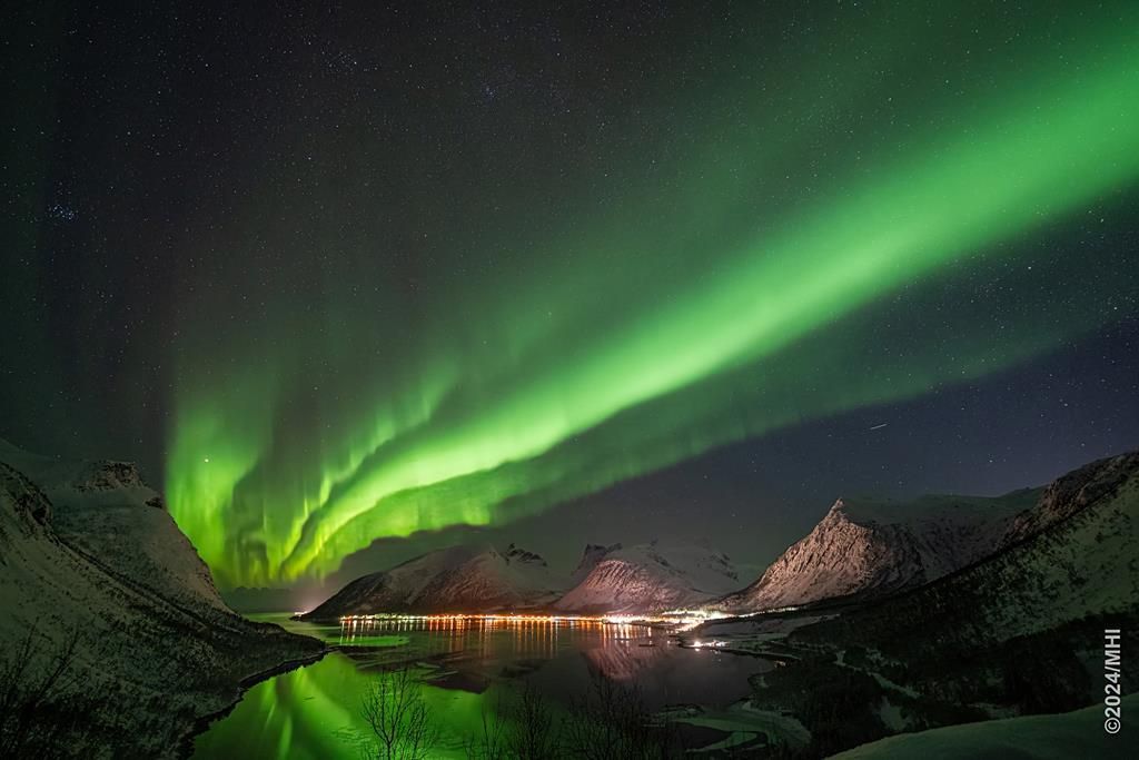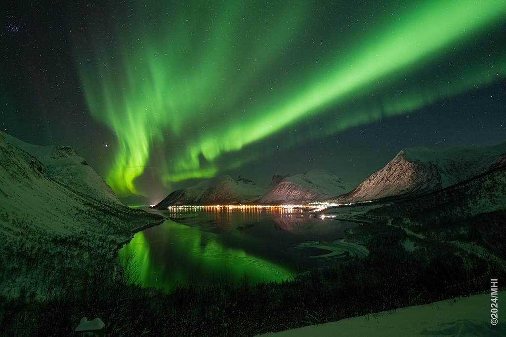 Polarlicht vom Tromtindvegan. Links sieht man das Dorf Tromvik, rechts die Insel Vengsoya.