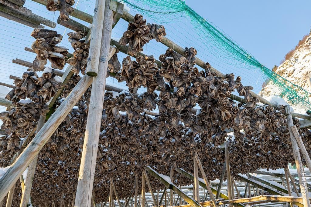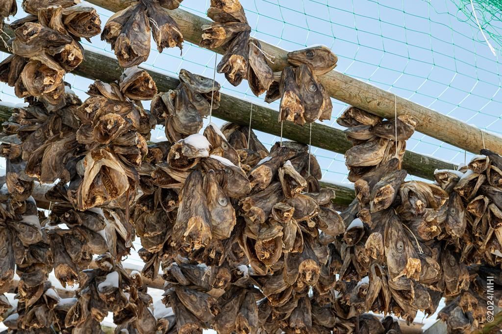 Am letzten Tag auf Senja fahren wir noch in den Süden der Insel. Da widmen wir uns wieder der Landschaftsfotografie. Wir fahren bis Grunnfarnes. Ganz am Ende des Dorfes finden wir dann noch Holzgestelle auf denen Fischköpfe zum trocknen aufgehängt sind. Die getrockneten Fischköpfe werden vor allem nach Nigeria als Eiweisslieferant für Suppen exportiert.
