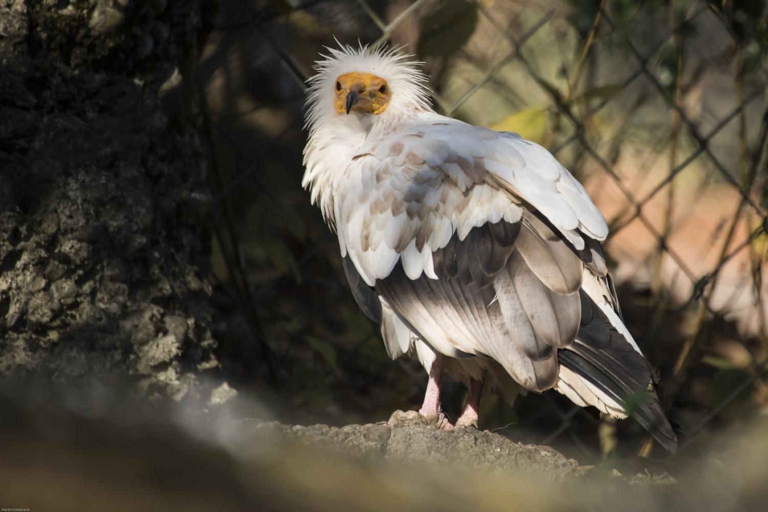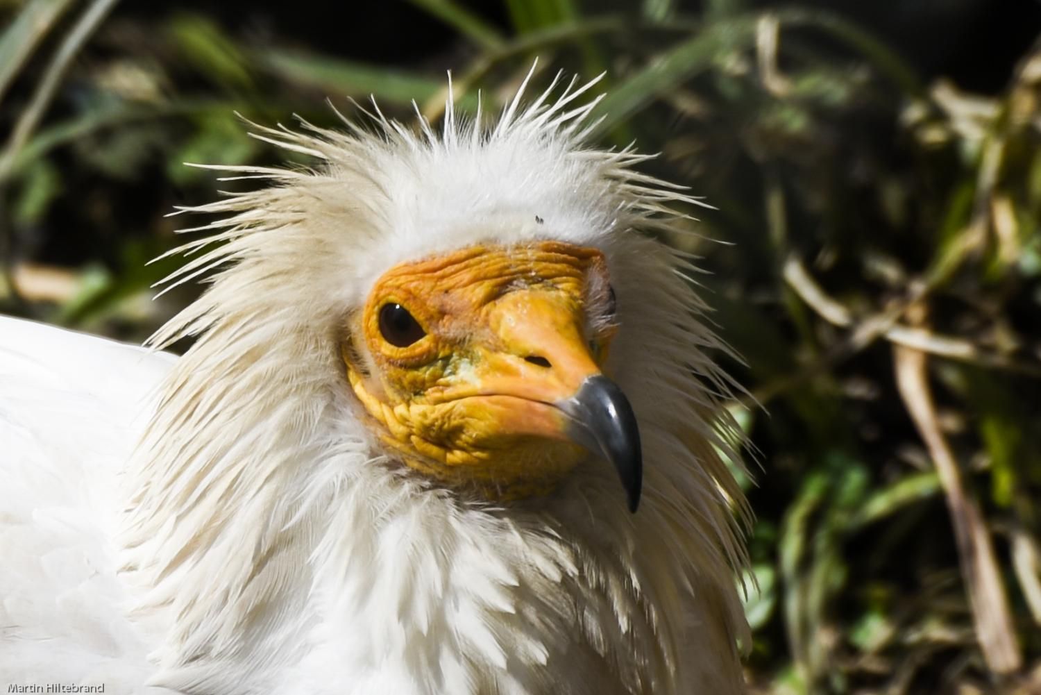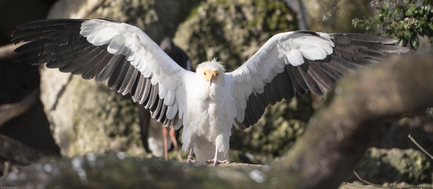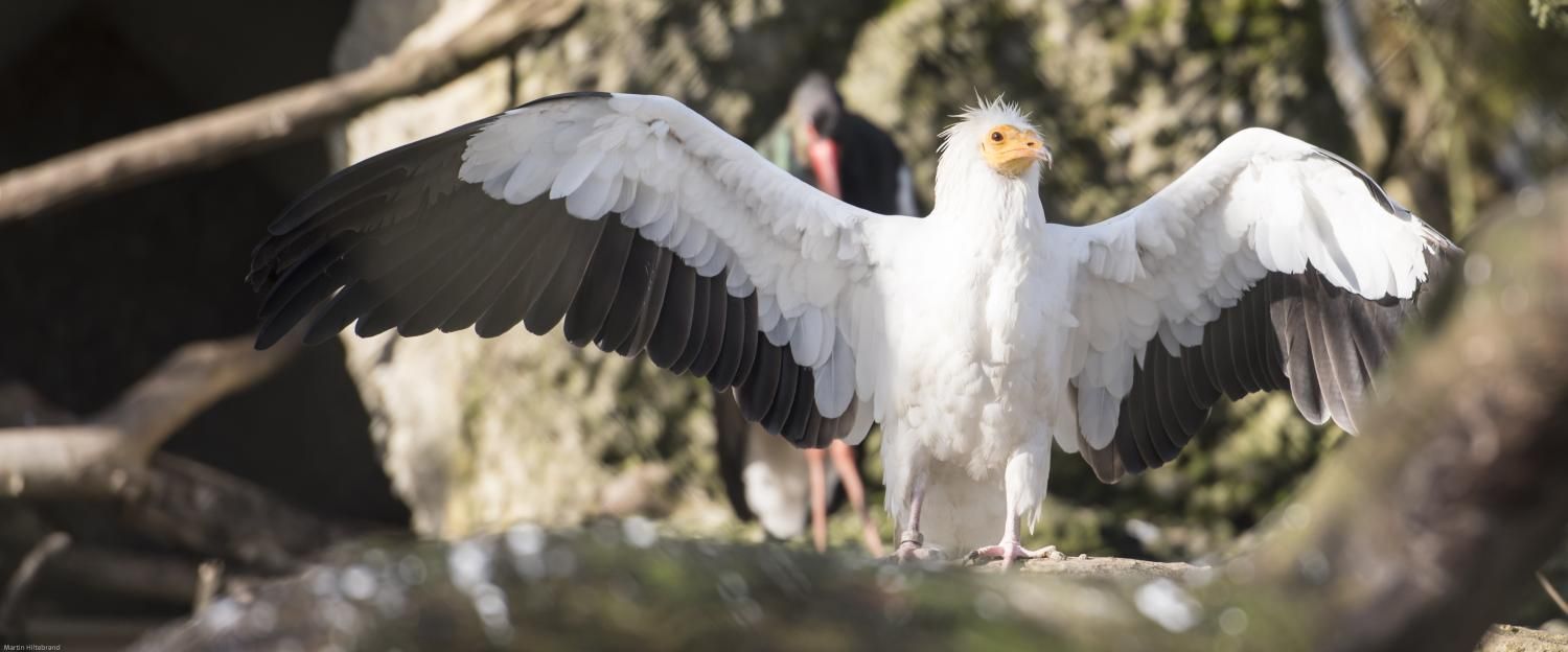 Der etwa 60 cm grosse Schmutzgeier, gut erkennbar am schmutzig weissen Gefieder, dem nackten gelben Gesicht und der struppigen, weissen Halskrause, gehört zu den ganz wenigen Vogelarten, die Werkzeuge benutzen: Strausseneier öffnet er, indem er einen Stein solange darauf wirft, bis sie zerbrechen. Neben einem findigen Nestplünderer ist er auch ein geschickter Kleintier- und Insektenjäger, frisst aber mit seinem sehr weichen Schnabel mehr als andere Geier Aas und gilt darum auch als Gesundheitspolizist. Seine Eier legt er zum Schutz vor Feinden in unzugängliche Felswände.
