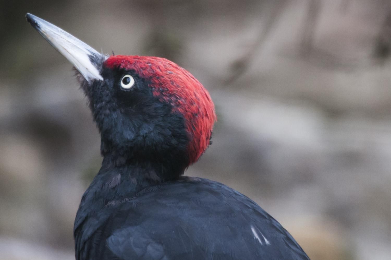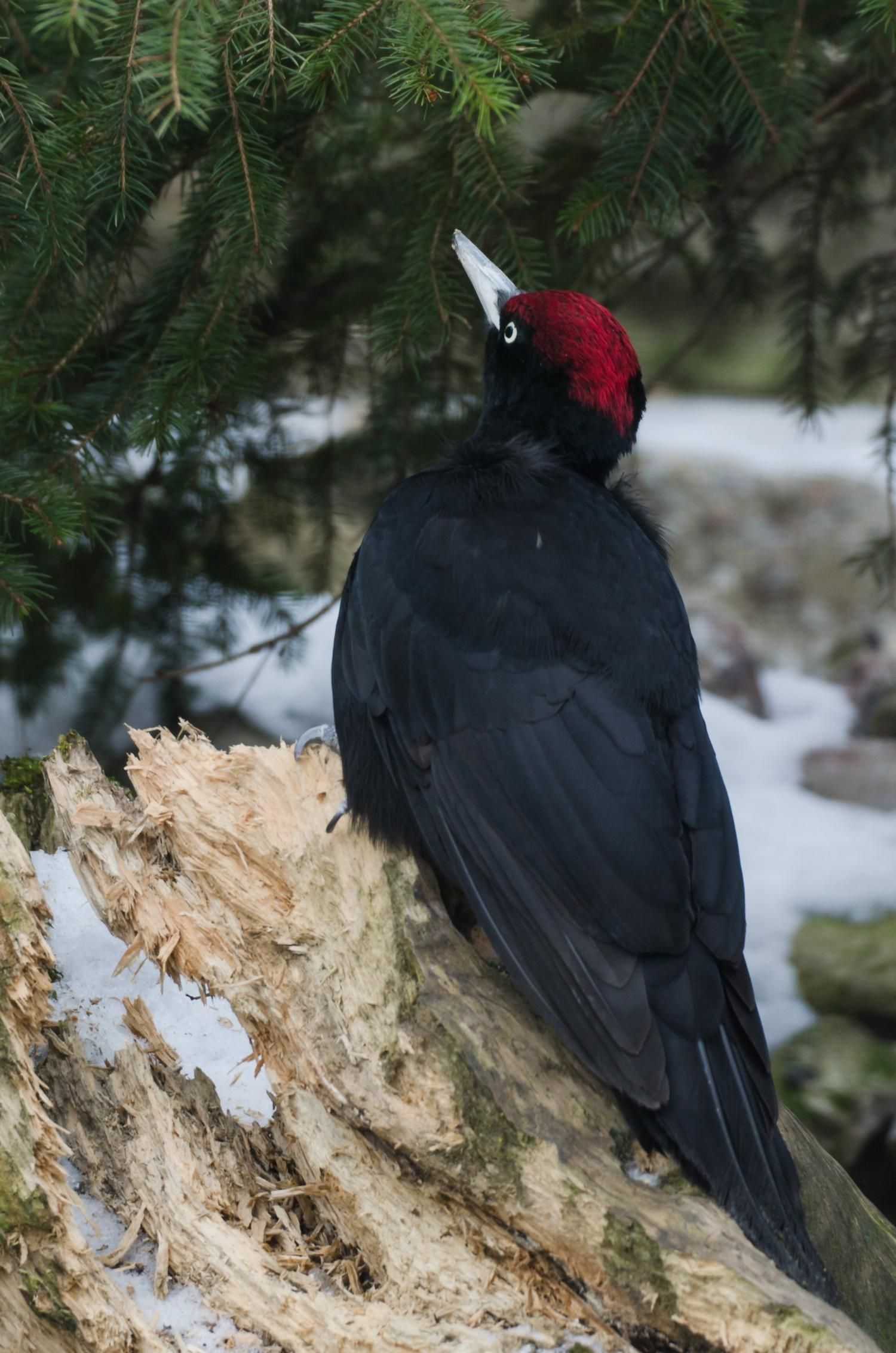 Der krähengrosse Schwarzspecht ist die grösste europäische Spechtart. Mit dem einheitlich schwarzen Gefieder, dem roten Scheitel, dem mächtigen, elfenbeinfarbenen Schnabel und der hellen Iris ist er kaum zu verwechseln. Trotz seiner Grösse bekommt man den scheuen Vogel nicht oft zu Gesicht. Er ist ruffreudig und verfügt über zahlreiche verschiedene Lautäusserungen. Gerne zerhackt er morsche Holzstümpfe, entrindet frische Strünke und insektenbefallene Bäume und meisselt tiefe Löcher in kernfaule Fichten.
