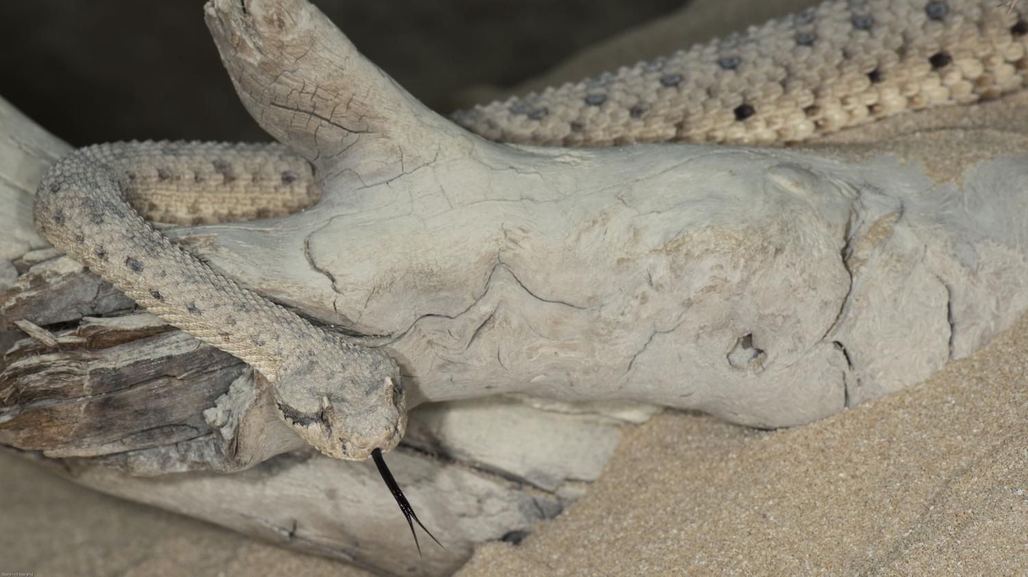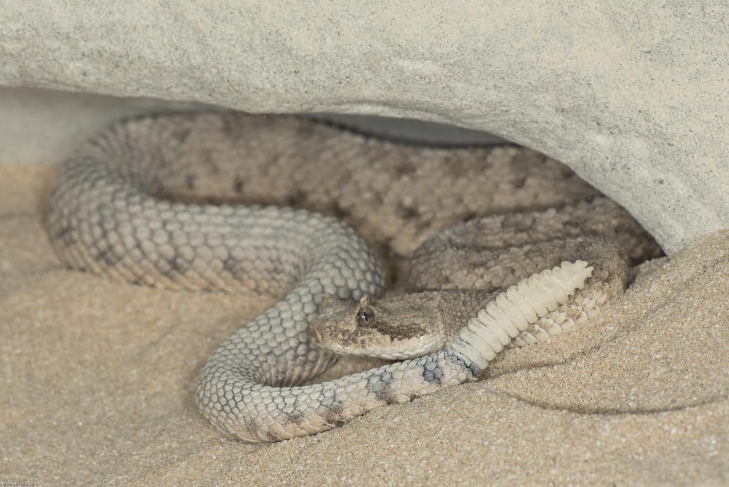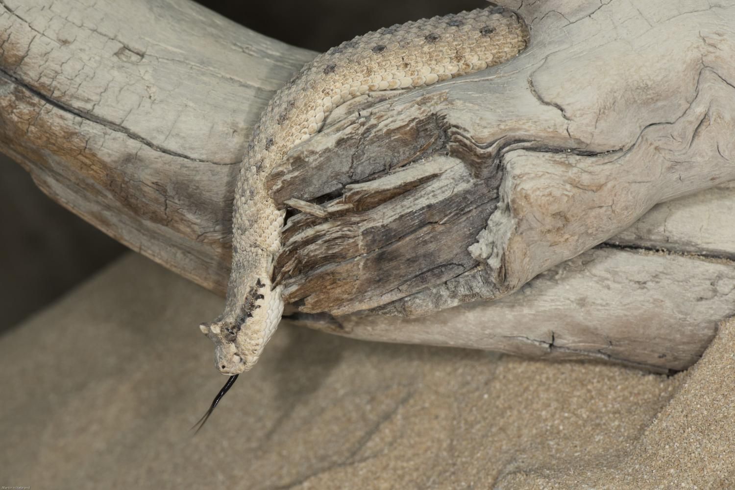 Die bis 75 cm lange Schlange lebt in Sandwüsten im Südwesten der USA. Charakteristisches Merkmal aller Klapperschlangen sind die verhornten Glieder am Schwanzende, mit denen sie durch schnelle vibrierende Bewegungen ihr typisches Rasseln erzeugen, wenn sie sich bedroht fühlen. Die Seitenwinder-Klapperschlange verdankt ihren Namen der Fortbewegungsart: Als Anpassung an das Leben auf dem heissen Sand berührt sie den Boden jeweils nur an zwei bis drei Punkten und bewegt sich mit seitlichem, fast sprungartigem Gleiten durch S-förmige Körperbewegungen fort. Die Paarung der Klapperschlangen erfolgt nach ausgedehnten Rangordnungskämpfen zwischen den Männchen.