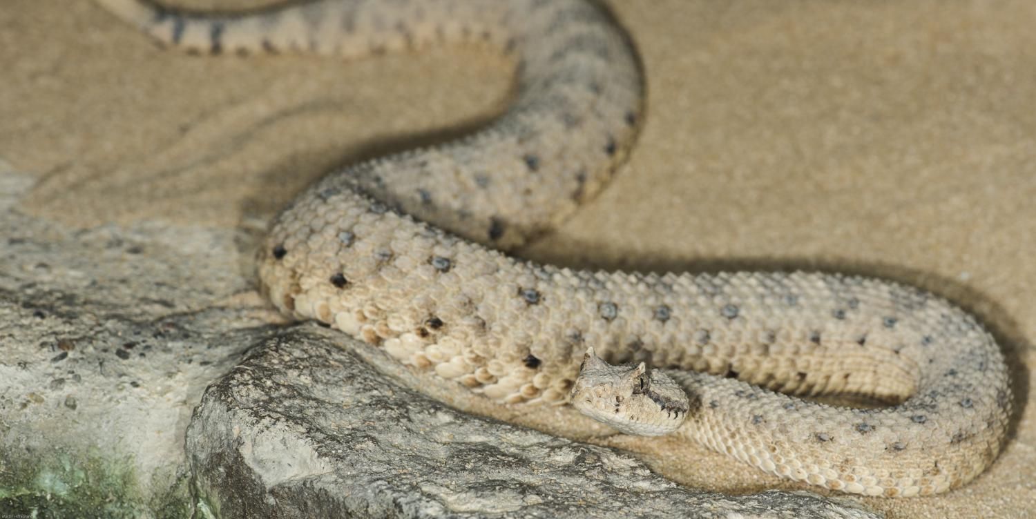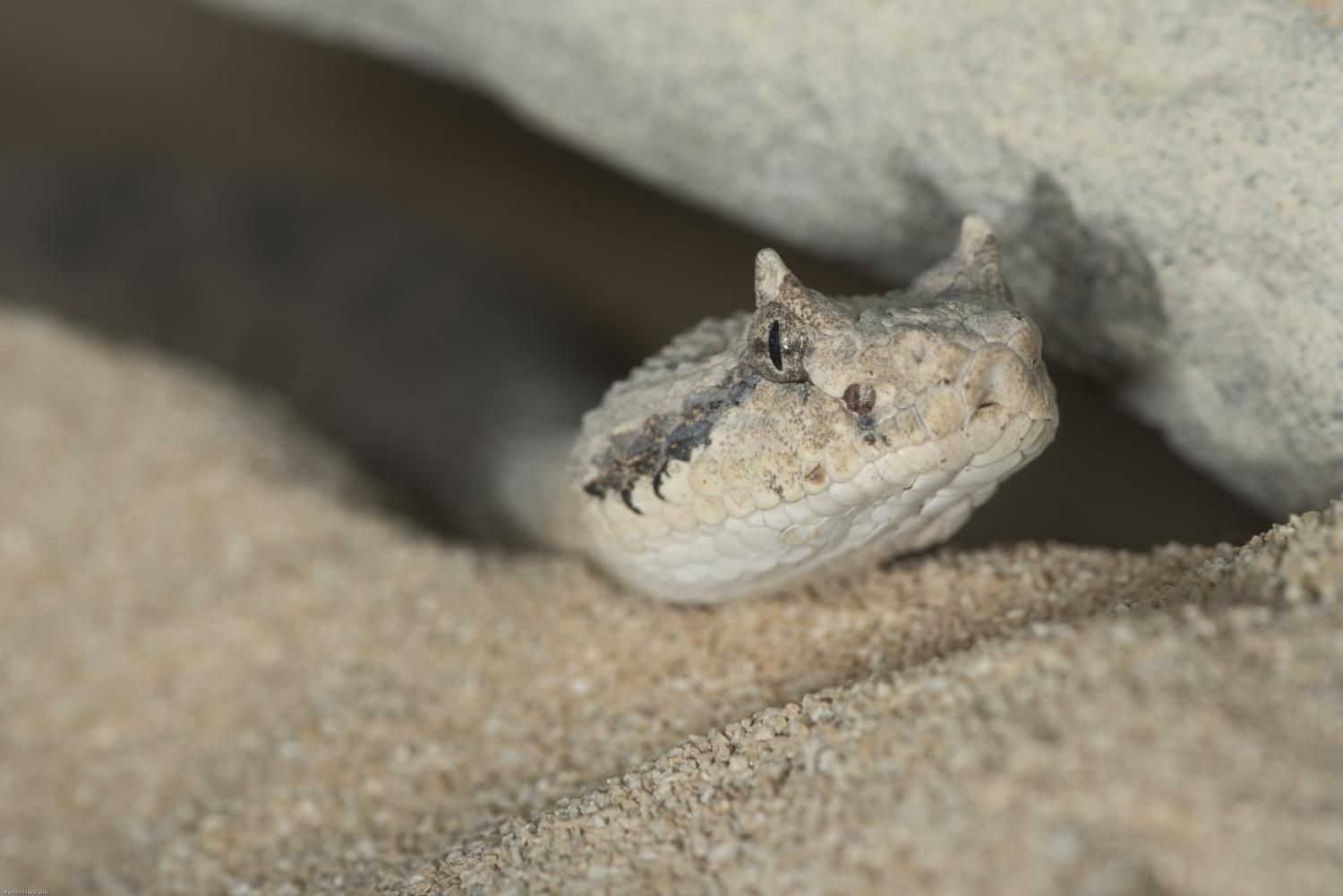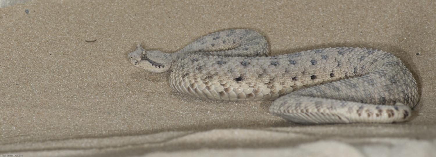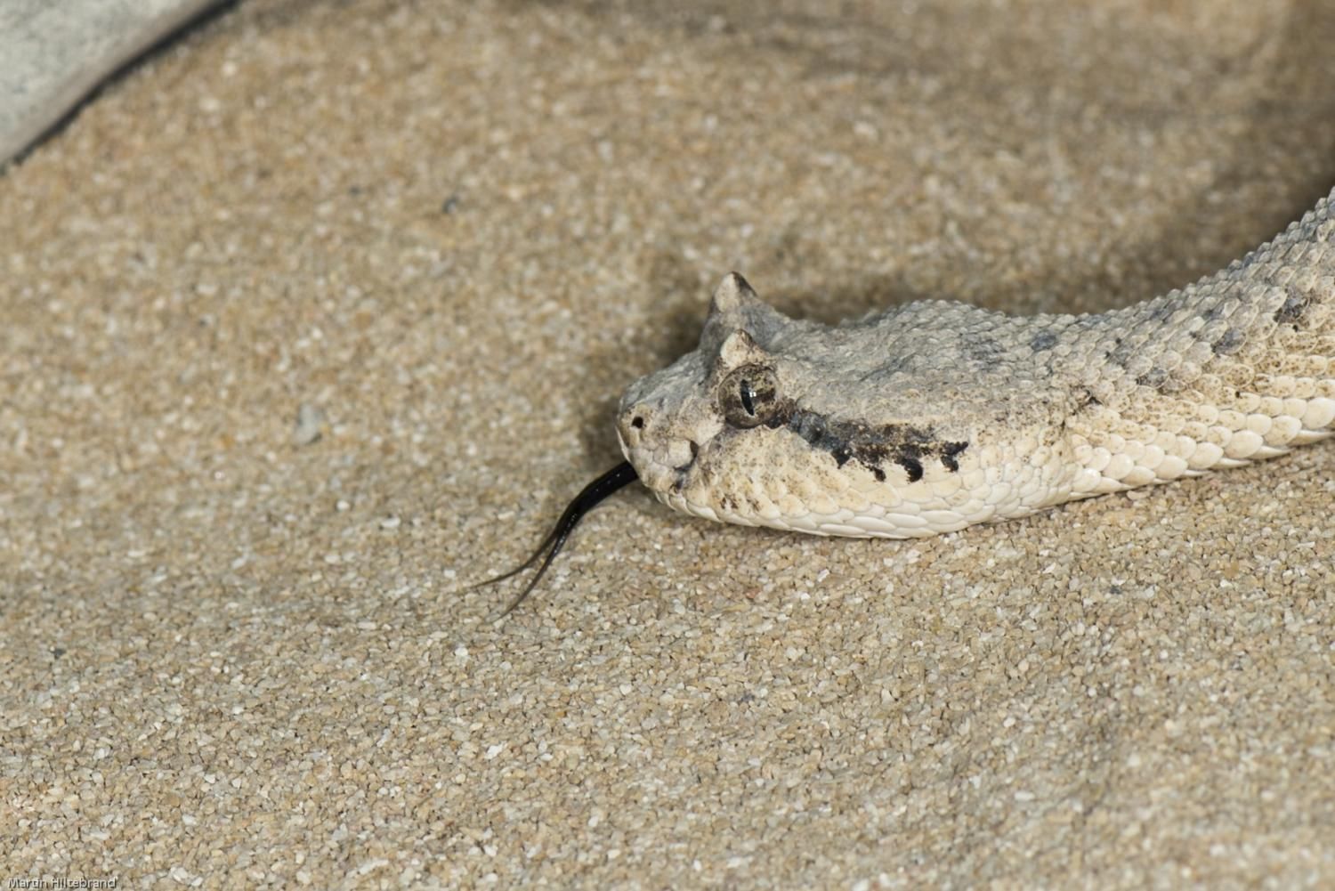 Die bis 75 cm lange Schlange lebt in Sandwüsten im Südwesten der USA. Charakteristisches Merkmal aller Klapperschlangen sind die verhornten Glieder am Schwanzende, mit denen sie durch schnelle vibrierende Bewegungen ihr typisches Rasseln erzeugen, wenn sie sich bedroht fühlen. Die Seitenwinder-Klapperschlange verdankt ihren Namen der Fortbewegungsart: Als Anpassung an das Leben auf dem heissen Sand berührt sie den Boden jeweils nur an zwei bis drei Punkten und bewegt sich mit seitlichem, fast sprungartigem Gleiten durch S-förmige Körperbewegungen fort. Die Paarung der Klapperschlangen erfolgt nach ausgedehnten Rangordnungskämpfen zwischen den Männchen.