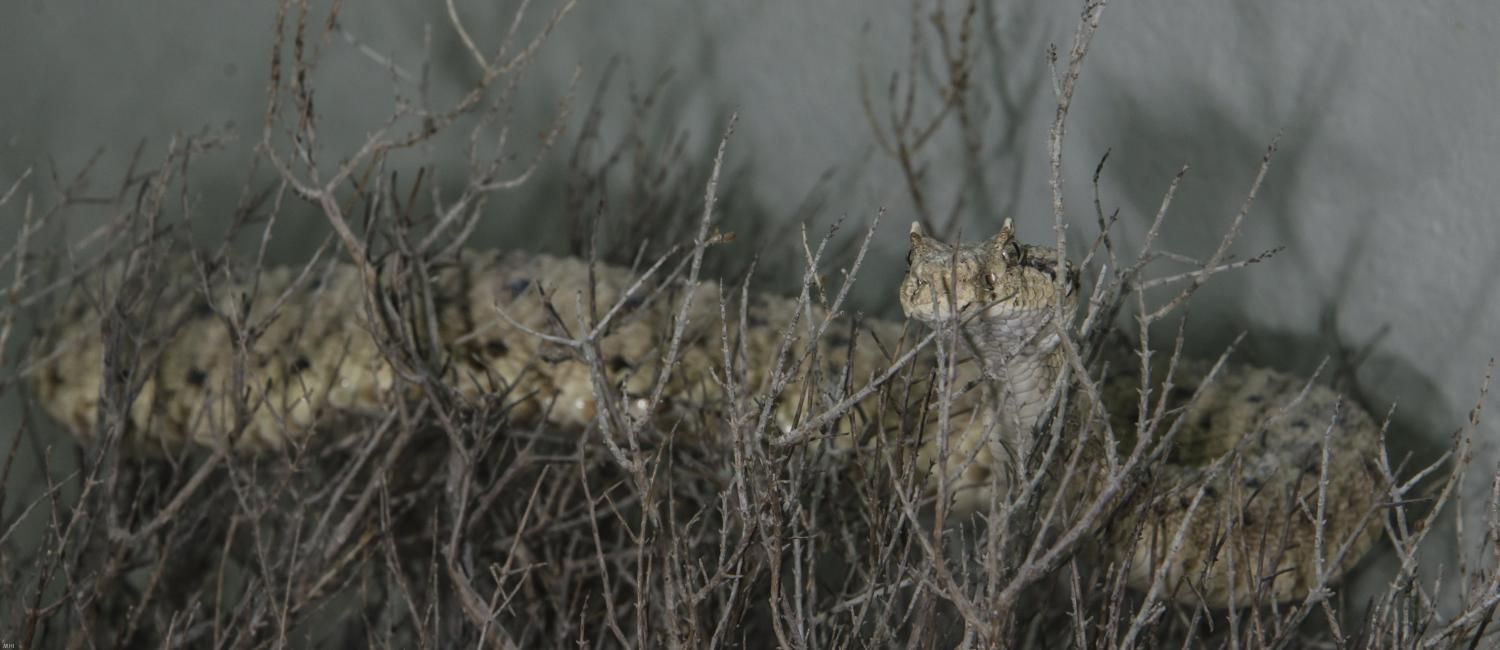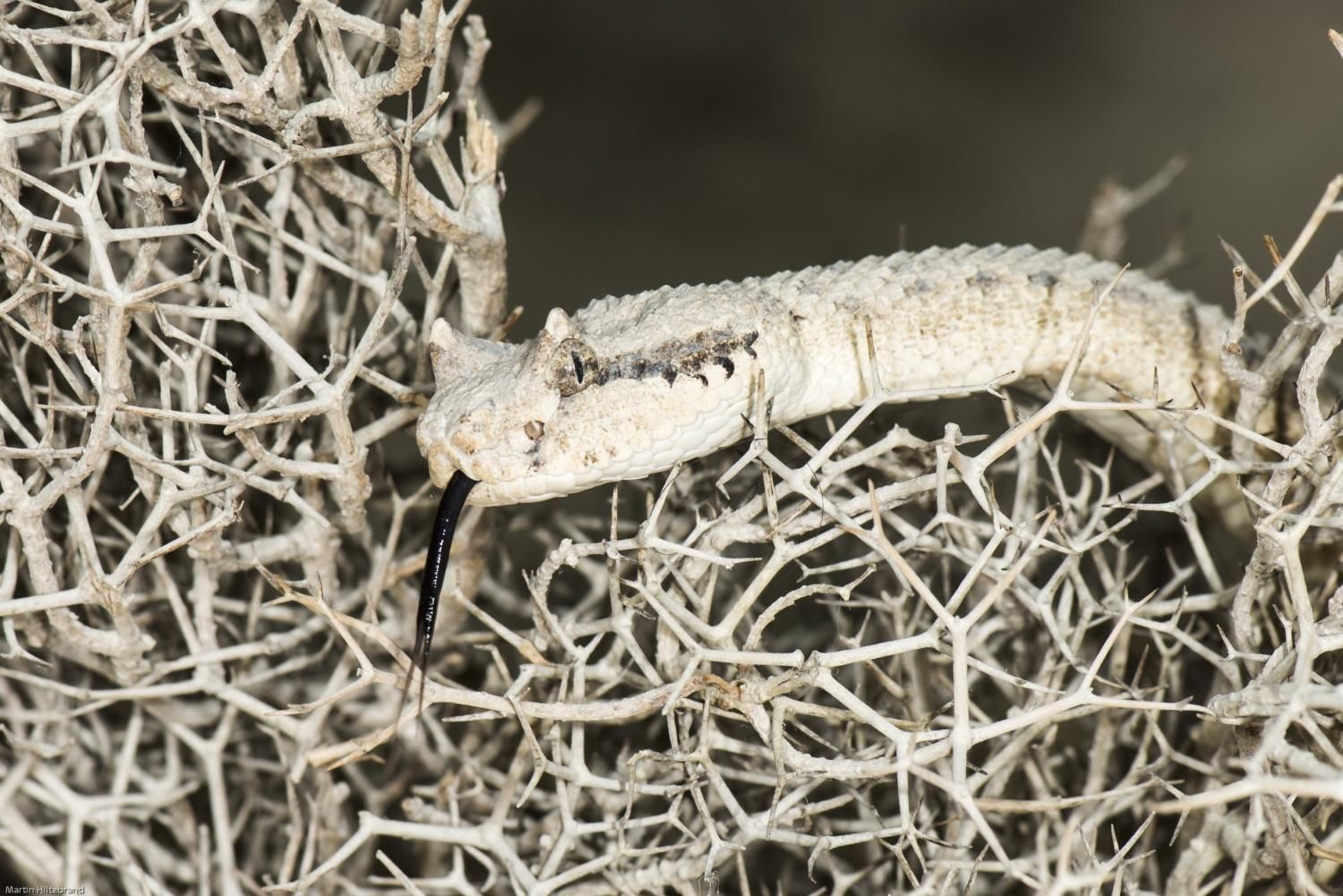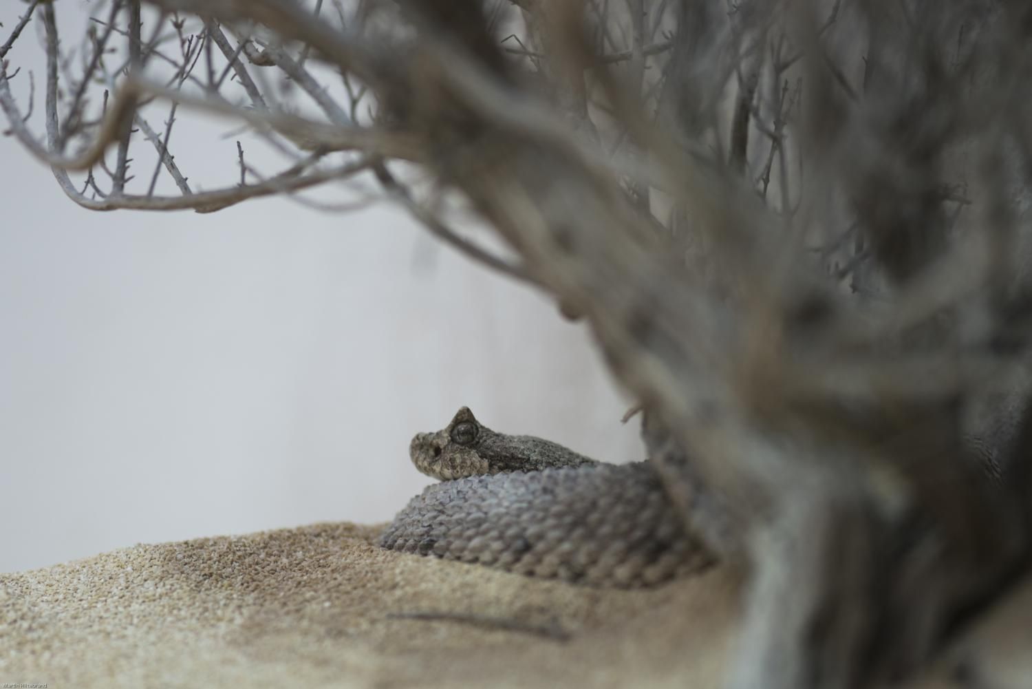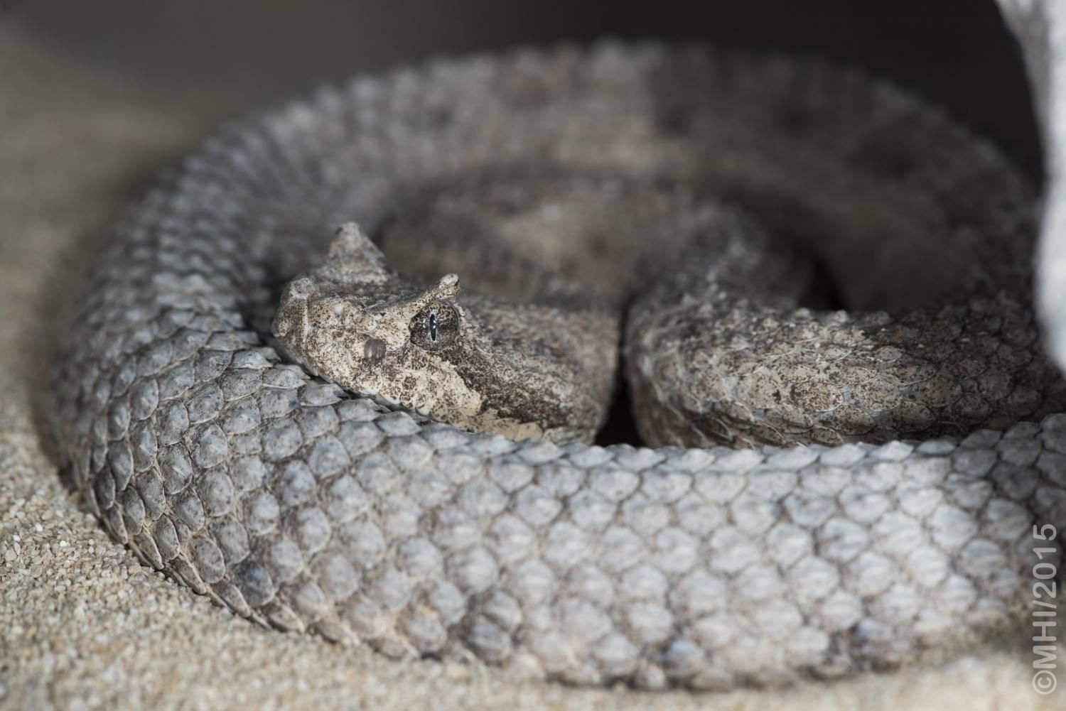 Die bis 75 cm lange Schlange lebt in Sandwüsten im Südwesten der USA. Charakteristisches Merkmal aller Klapperschlangen sind die verhornten Glieder am Schwanzende, mit denen sie durch schnelle vibrierende Bewegungen ihr typisches Rasseln erzeugen, wenn sie sich bedroht fühlen. Die Seitenwinder-Klapperschlange verdankt ihren Namen der Fortbewegungsart: Als Anpassung an das Leben auf dem heissen Sand berührt sie den Boden jeweils nur an zwei bis drei Punkten und bewegt sich mit seitlichem, fast sprungartigem Gleiten durch S-förmige Körperbewegungen fort. Die Paarung der Klapperschlangen erfolgt nach ausgedehnten Rangordnungskämpfen zwischen den Männchen.