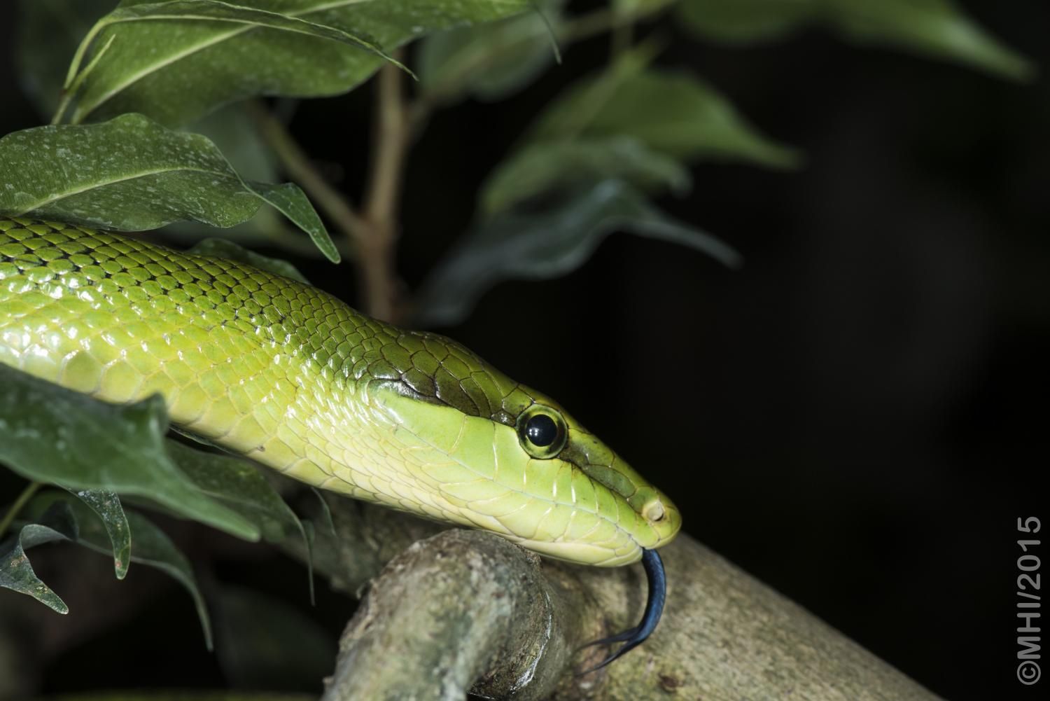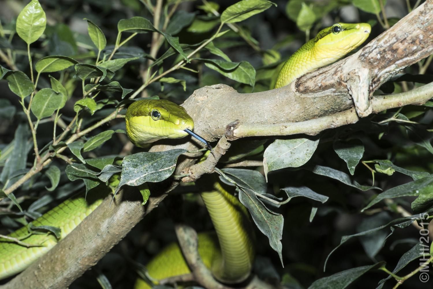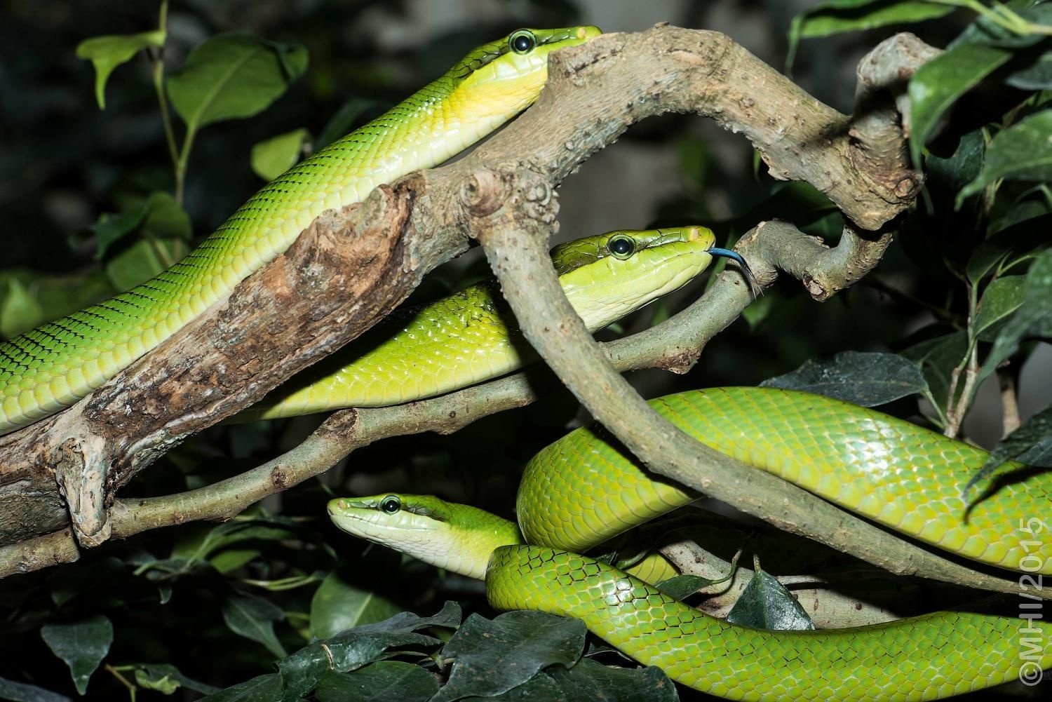 Nattern sind die artenreichste Familie der Schlangen und kommen auf der ganzen Welt vor. Die ungiftige Spitzkopfnatter ist dank ihrer grünen Körperfarbe hervorragend an das Leben in den Blätterregionen der Bäume angepasst. Diese Form der Anpassung an die Umgebung, mit dem Ziel sich unsichtbar zu machen, nennt man in der Fachsprache Mimese. Kommt sie dennoch einmal in eine gefährliche Situation, hat sie eine wirksame Verhaltensweise entwickelt: Sie verharrt erst ruhig mit ausgestrecktem Vorderkörper, bläht dann den Hals auf und beginnt als weiteres Zeichen der Erregung mit dem Schwanz zu zittern. Wie alle Schlangen kann auch die Spitzkopfnatter teils monatelang ohne Nahrung auskommen.