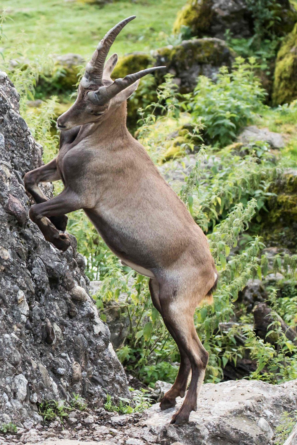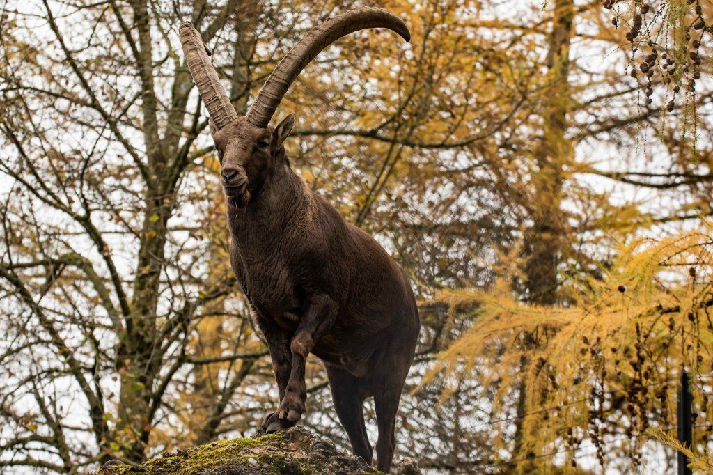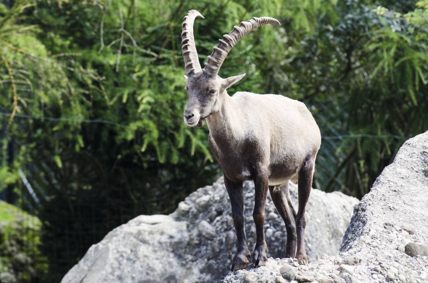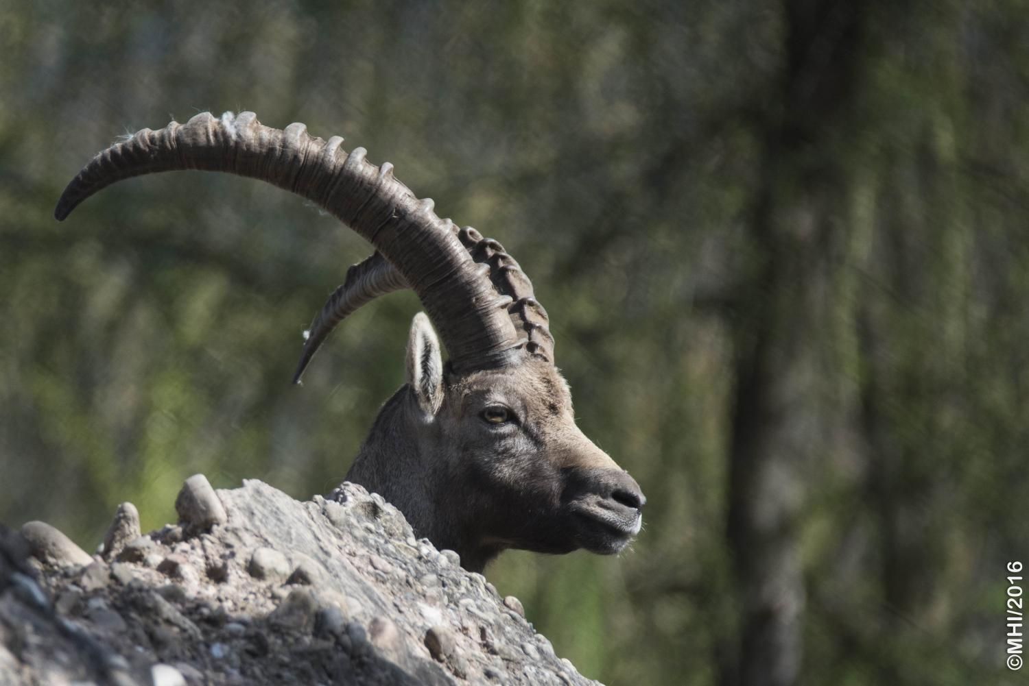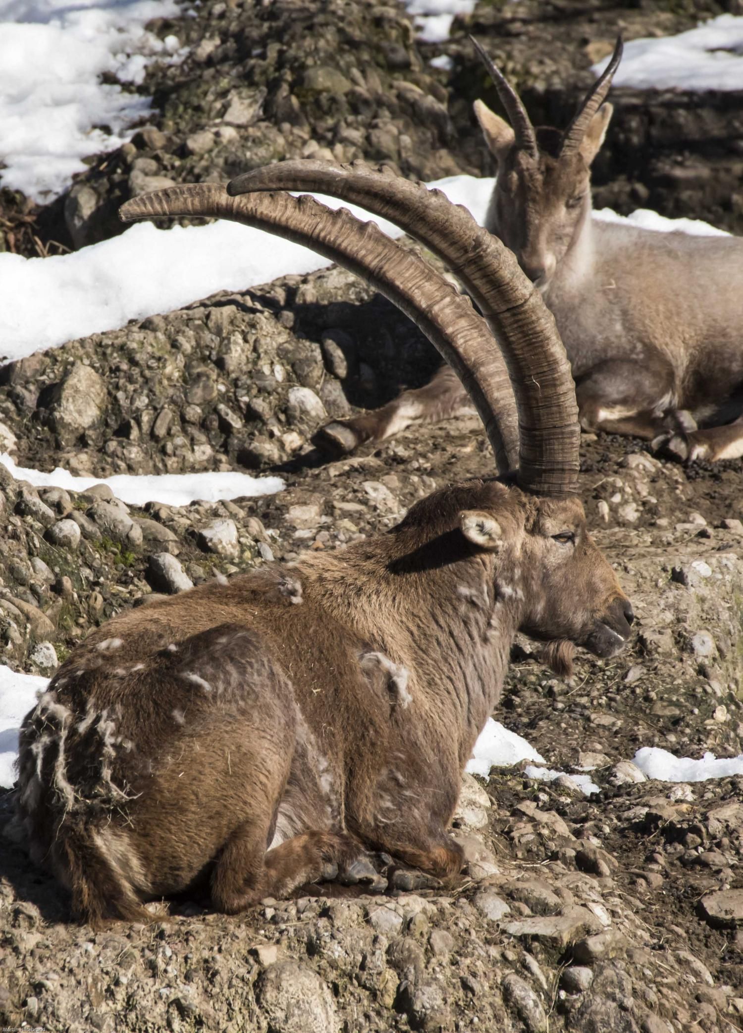 Der Steinbock ist eines der eindrücklichsten Tiere unserer Alpen. Heute gehört der Steinbock wie selbstverständlich zum Bild der Schweizer Bergwelt, was aber Ende des 19. Jahrhunderts ganz anders aussah. Die bis zu 1m langen Hörner der männlichen Tiere, welche über 10kg wiegen können, galten früher in allen möglichen Verarbeitungen als Wunder- und Heilmittel. Deshalb setzte man dem Steinbock durch Bejagung so stark zu, bis er um 1850 im ganzen Alpenraum als ausgerottet galt. Lediglich ein kleiner Bestand in Italien wurde vom damaligen König persönlich geschützt. Erst 1911 konnten in der Schweiz wieder Steinböcke aus der Zucht von illegal beschafften Tieren ausgesetzt werden und sich ausbreiten. Die weiblichen Tiere (Steingeissen) sind bedeutend zierlicher als die Böcke. Ihre Hörner werden lediglich 35cm lang, sind dadurch aber nützlicher für die Verteidigung gegen Feinde und aufdringliche Artgenossen. Der Kopf wird dabei gesenkt, so dass die spitzen Enden nach vorne schauen. Anhand der am Horn gebildeten Jahresringe lässt sich das Alter der Steinböcke bestimmen, die Knoten oder Schmuckwülste auf der Vorderseite entstehen in der Regel zweimal jährlich. Nicht nur die Steingeissen, sondern auch die massigeren Böcke sind geschickte Kletterer. Die Hufe haben aussen einen harten Rand und innen weiche, haftende Ballen, die auch im steilsten Gelände einen guten Halt ermöglichen. Ein Steinbock kann aus dem Stand mehrere Meter hoch und weit springen. Das Gehege im Tierpark verlässt er aber trotzdem nicht, da Steinböcke sehr ortstreue Tiere sind, die ein nahrungssicheres Gebiet nicht so schnell verlassen. Das Steinbockgehege finden Sie gleich neben der Eulenvoliere. Der gegenüberliegende Rastplatz bietet eine gute Gelegenheit, die Steinböcke in aller Ruhe zu beobachten.