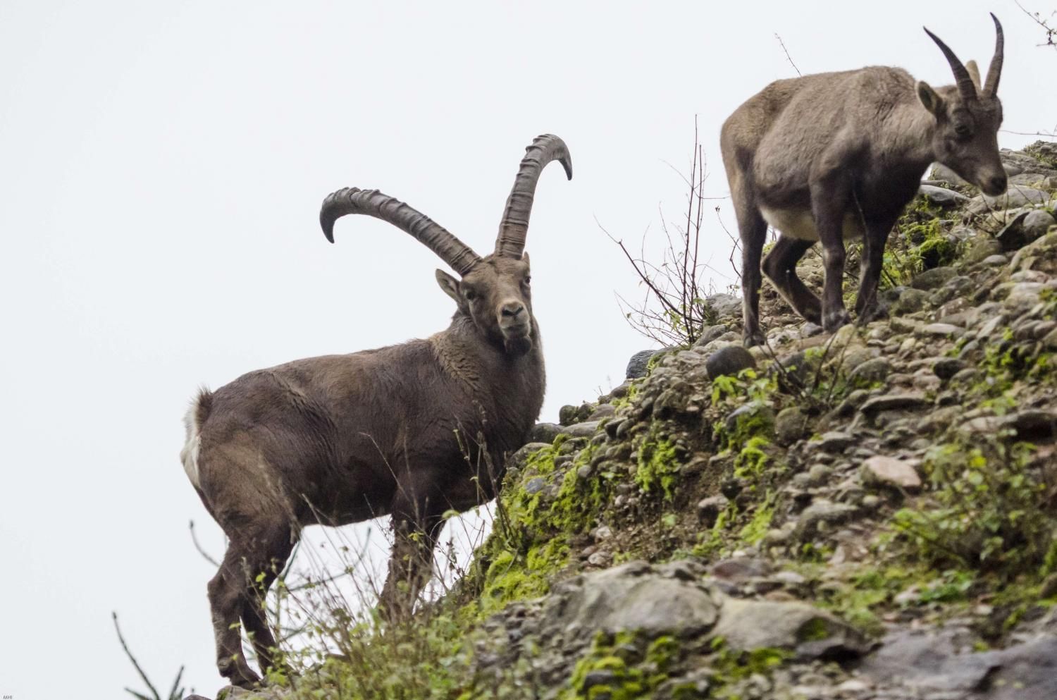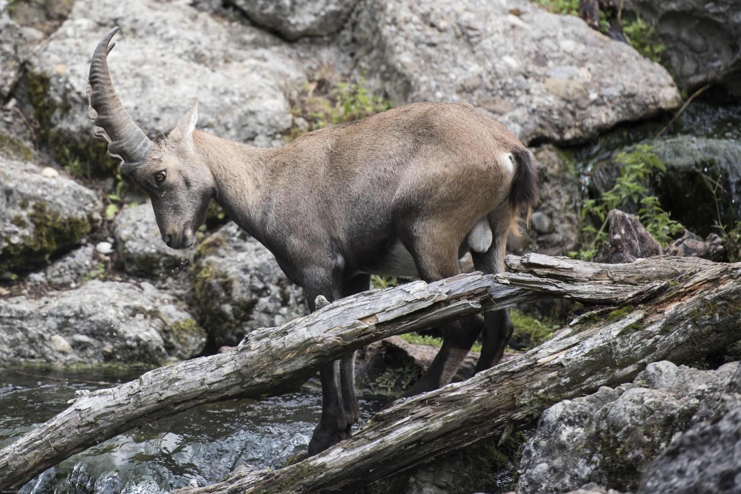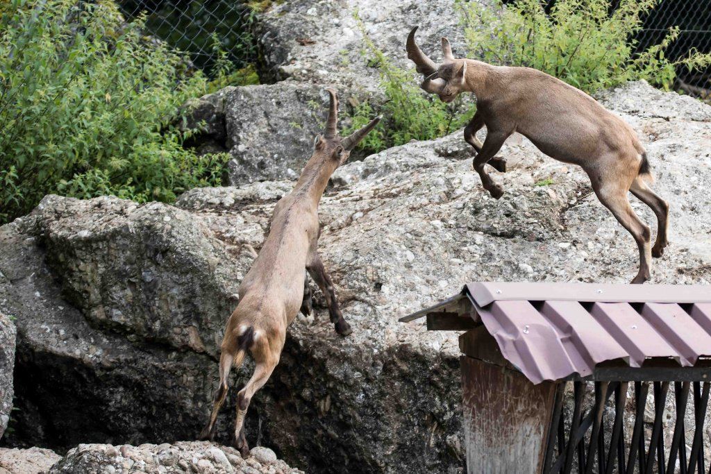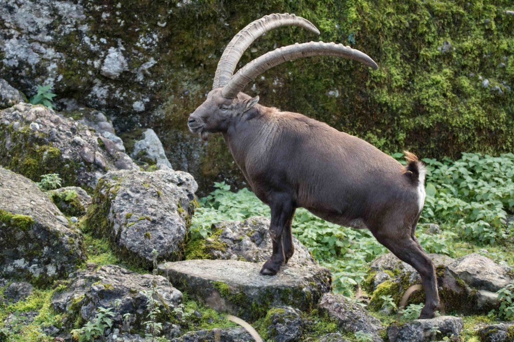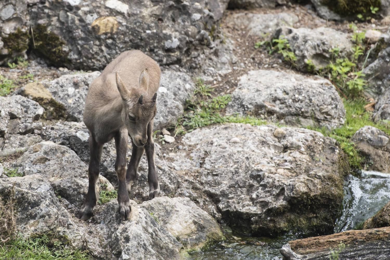 Der Steinbock ist eines der eindrücklichsten Tiere unserer Alpen. Heute gehört der Steinbock wie selbstverständlich zum Bild der Schweizer Bergwelt, was aber Ende des 19. Jahrhunderts ganz anders aussah. Die bis zu 1m langen Hörner der männlichen Tiere, welche über 10kg wiegen können, galten früher in allen möglichen Verarbeitungen als Wunder- und Heilmittel. Deshalb setzte man dem Steinbock durch Bejagung so stark zu, bis er um 1850 im ganzen Alpenraum als ausgerottet galt. Lediglich ein kleiner Bestand in Italien wurde vom damaligen König persönlich geschützt. Erst 1911 konnten in der Schweiz wieder Steinböcke aus der Zucht von illegal beschafften Tieren ausgesetzt werden und sich ausbreiten. Die weiblichen Tiere (Steingeissen) sind bedeutend zierlicher als die Böcke. Ihre Hörner werden lediglich 35cm lang, sind dadurch aber nützlicher für die Verteidigung gegen Feinde und aufdringliche Artgenossen. Der Kopf wird dabei gesenkt, so dass die spitzen Enden nach vorne schauen. Anhand der am Horn gebildeten Jahresringe lässt sich das Alter der Steinböcke bestimmen, die Knoten oder Schmuckwülste auf der Vorderseite entstehen in der Regel zweimal jährlich. Nicht nur die Steingeissen, sondern auch die massigeren Böcke sind geschickte Kletterer. Die Hufe haben aussen einen harten Rand und innen weiche, haftende Ballen, die auch im steilsten Gelände einen guten Halt ermöglichen. Ein Steinbock kann aus dem Stand mehrere Meter hoch und weit springen. Das Gehege im Tierpark verlässt er aber trotzdem nicht, da Steinböcke sehr ortstreue Tiere sind, die ein nahrungssicheres Gebiet nicht so schnell verlassen. Das Steinbockgehege finden Sie gleich neben der Eulenvoliere. Der gegenüberliegende Rastplatz bietet eine gute Gelegenheit, die Steinböcke in aller Ruhe zu beobachten.
