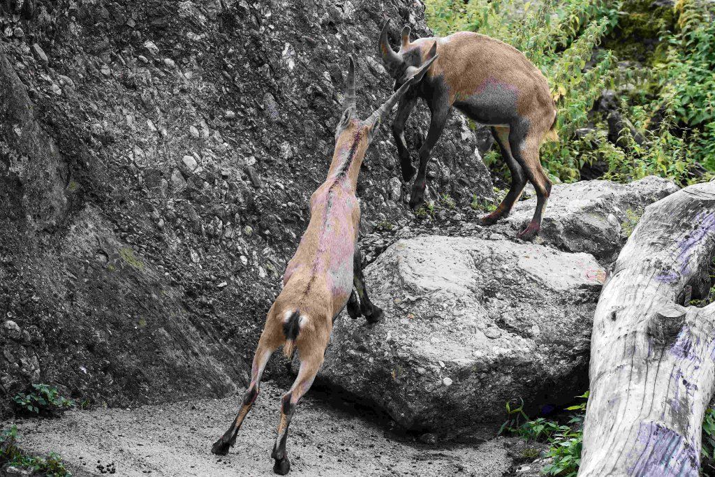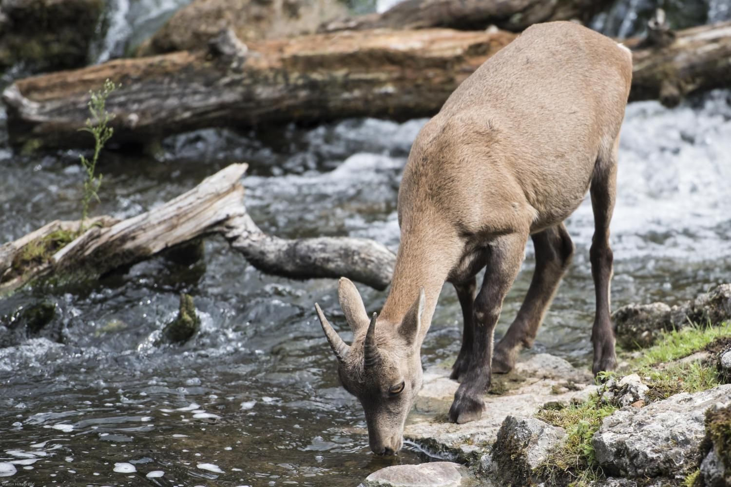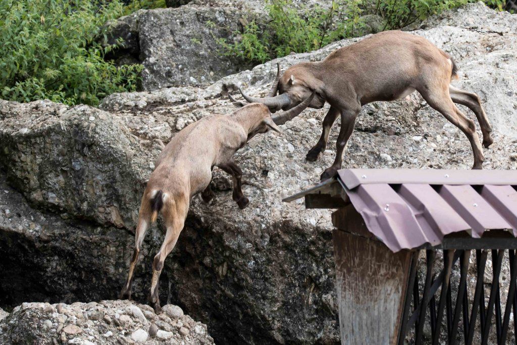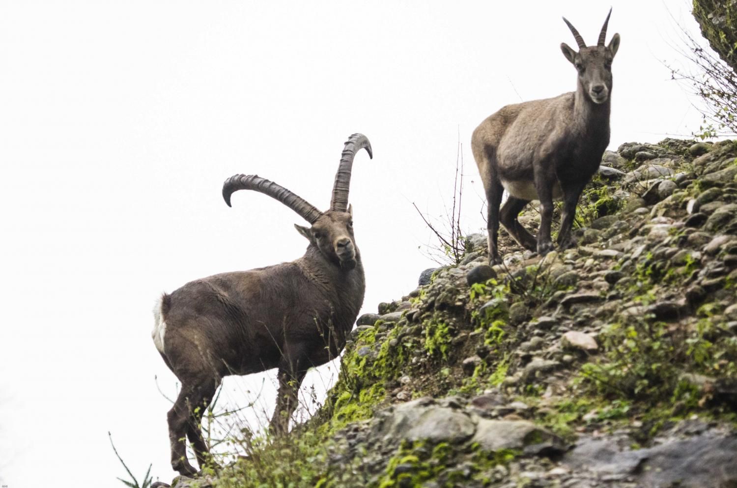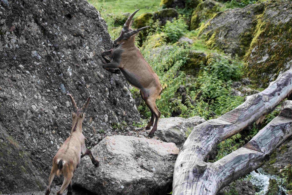 Der Steinbock ist eines der eindrücklichsten Tiere unserer Alpen. Heute gehört der Steinbock wie selbstverständlich zum Bild der Schweizer Bergwelt, was aber Ende des 19. Jahrhunderts ganz anders aussah. Die bis zu 1m langen Hörner der männlichen Tiere, welche über 10kg wiegen können, galten früher in allen möglichen Verarbeitungen als Wunder- und Heilmittel. Deshalb setzte man dem Steinbock durch Bejagung so stark zu, bis er um 1850 im ganzen Alpenraum als ausgerottet galt. Lediglich ein kleiner Bestand in Italien wurde vom damaligen König persönlich geschützt. Erst 1911 konnten in der Schweiz wieder Steinböcke aus der Zucht von illegal beschafften Tieren ausgesetzt werden und sich ausbreiten. Die weiblichen Tiere (Steingeissen) sind bedeutend zierlicher als die Böcke. Ihre Hörner werden lediglich 35cm lang, sind dadurch aber nützlicher für die Verteidigung gegen Feinde und aufdringliche Artgenossen. Der Kopf wird dabei gesenkt, so dass die spitzen Enden nach vorne schauen. Anhand der am Horn gebildeten Jahresringe lässt sich das Alter der Steinböcke bestimmen, die Knoten oder Schmuckwülste auf der Vorderseite entstehen in der Regel zweimal jährlich. Nicht nur die Steingeissen, sondern auch die massigeren Böcke sind geschickte Kletterer. Die Hufe haben aussen einen harten Rand und innen weiche, haftende Ballen, die auch im steilsten Gelände einen guten Halt ermöglichen. Ein Steinbock kann aus dem Stand mehrere Meter hoch und weit springen. Das Gehege im Tierpark verlässt er aber trotzdem nicht, da Steinböcke sehr ortstreue Tiere sind, die ein nahrungssicheres Gebiet nicht so schnell verlassen. Das Steinbockgehege finden Sie gleich neben der Eulenvoliere. Der gegenüberliegende Rastplatz bietet eine gute Gelegenheit, die Steinböcke in aller Ruhe zu beobachten.