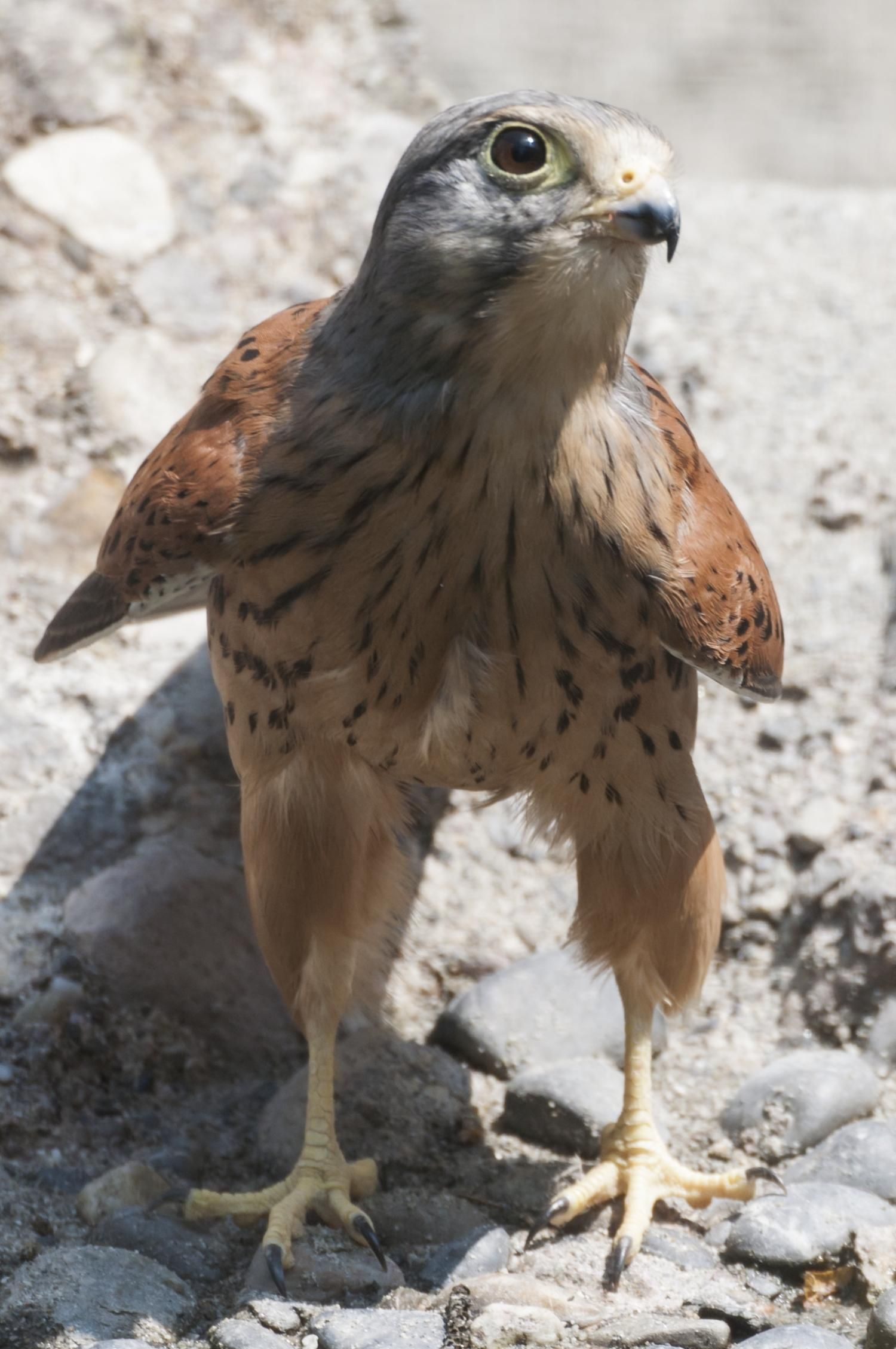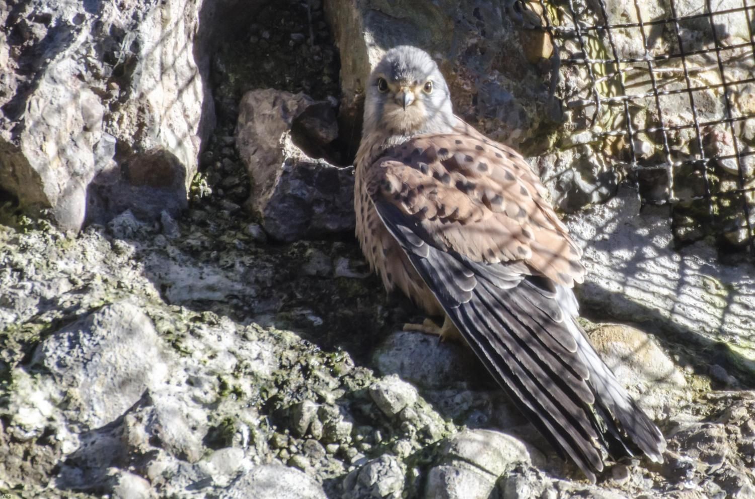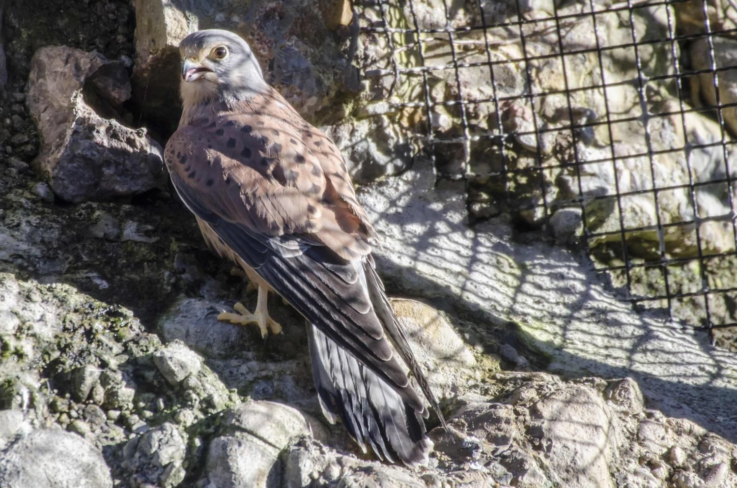 Der Turmfalke ist ein eher zierlicher Vertreter der Falken. Als Greifvogel jagt er vornehmlich im freien Feld nach Mäusen und grossen Insekten. Schon von weitem kann man den Turmfalken erkennen, wenn er in der Luft am Ort stehen bleibt (das so genannte „Rütteln“) und den Boden genauer nach Beute absucht. Weil Turmfalken häufig dabei beobachtet werden können, werden sie auch „Rüttelfalken“ genannt. Das Verbreitungsgebiet des Turmfalken erstreckt sich über Eurasien und grosse Teile Afrikas. In der Schweiz ist er die häufigste Falkenart und öfters zu sehen. Als anpassungsfähiger Vogel hat sich der Turmfalke die verschiedensten Lebensräume erschlossen, wie z.B. offene Landschaften, Industrie- und Kulturlandflächen, Heiden, Moore mit Bäumen und auch Gebirge. In den Siebziger Jahren gab es bei den Raubvögeln, allen voran bei den Falken, eine schreckliche Entdeckung zu vermelden. Die Nachwuchsrate brach sprichwörtlich zusammen: Beim Bebrüten der Eier zerbrachen deren Schalen. Man fand heraus, dass in der Agrarwirtschaft eingesetztes DDT, ein Schädlingsbekämpfungsmittel, zur Bildung von zu dünnen Eierschalen geführt hatte. Die Raubvögel waren am stärksten betroffen, da sie am Ende der Nahrungskette stehen und solche Stoffe in ihrem Körper anhäufen. Daraufhin wurde DDT in Europa verboten, der Bestand der betroffenen Arten erholt sich jedoch nur langsam. Turmfalken brüten meistens in Felsnischen, oft sogar in altem Gemäuer. Daher kommt auch der Name Turmfalke. In der Turmfalkenvoliere, die sich zwischen Eingang und Waldrappenvoliere befindet, sucht man deshalb vergebens ein Nest. Eine Felsnische dient ihnen als geeigneter Brutplatz. Der Turmfalke teilt sich im Tierpark die Voliere in der Regel mit Waldrapp und Steinkauz.