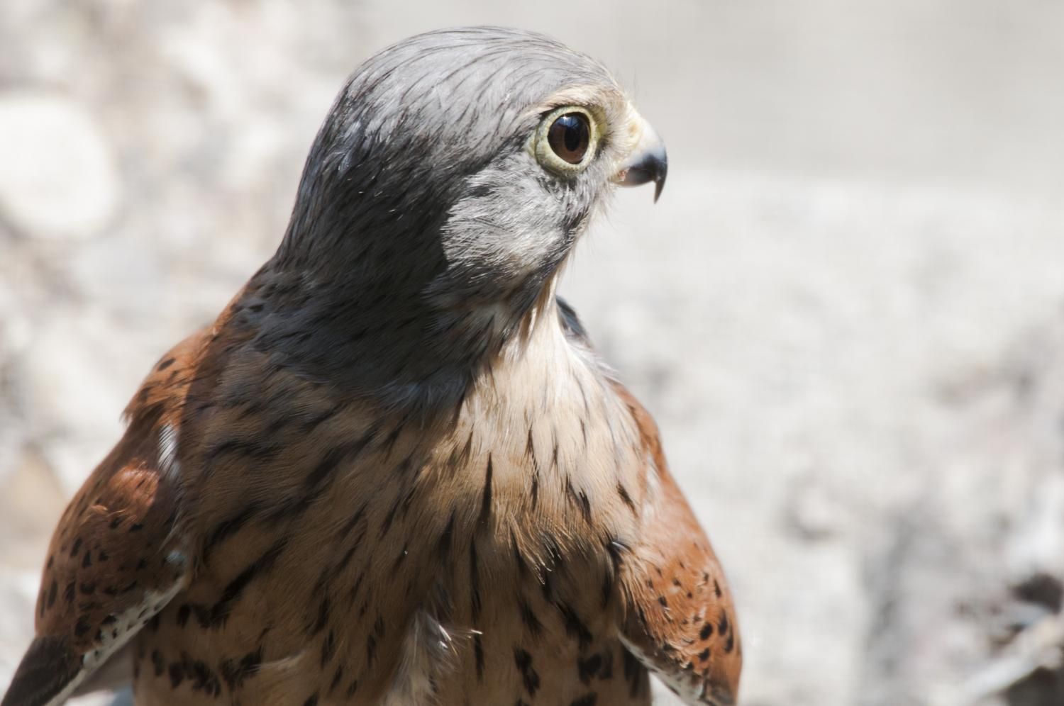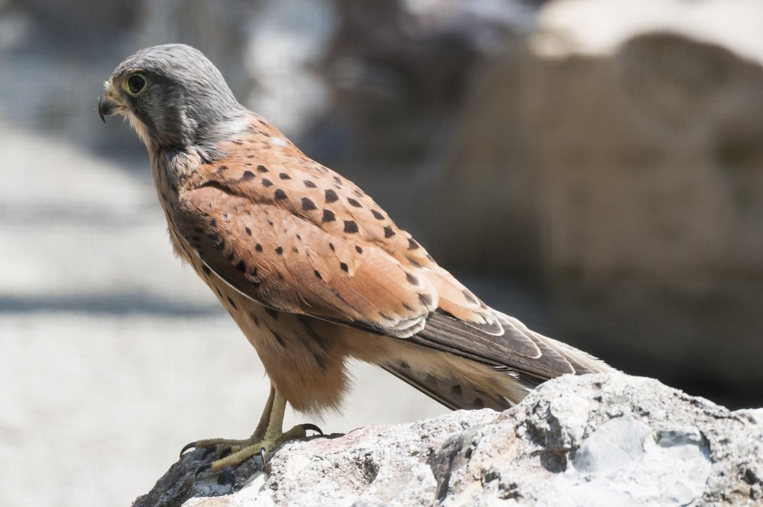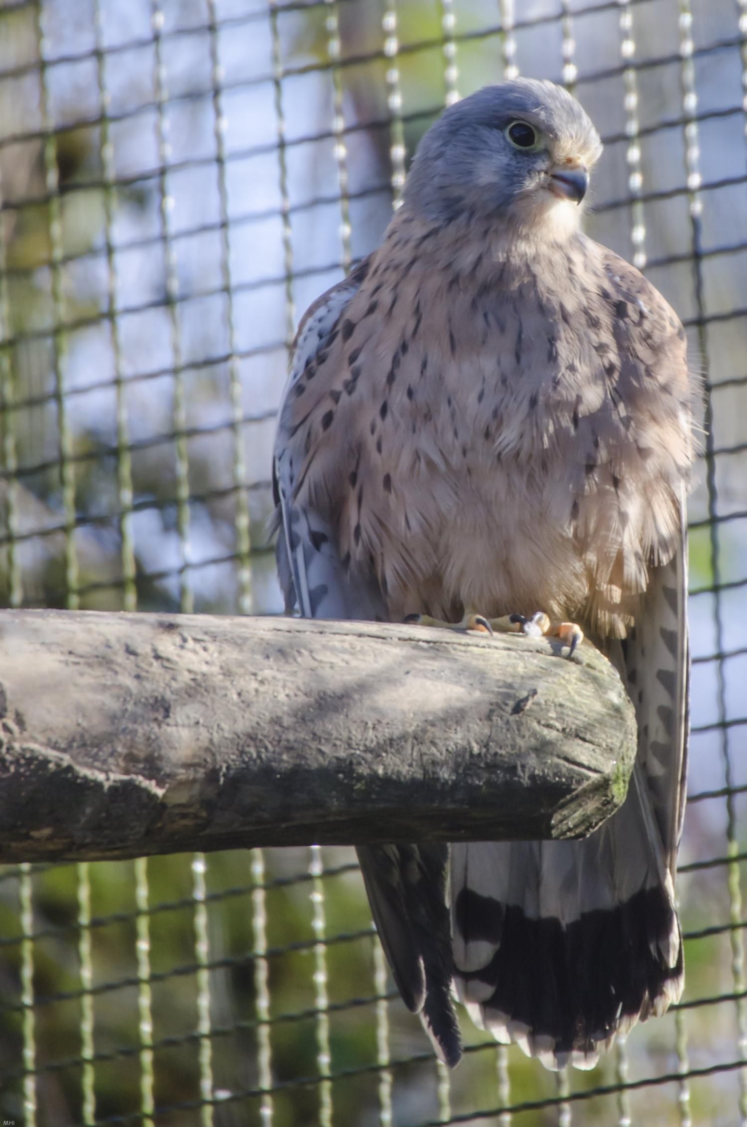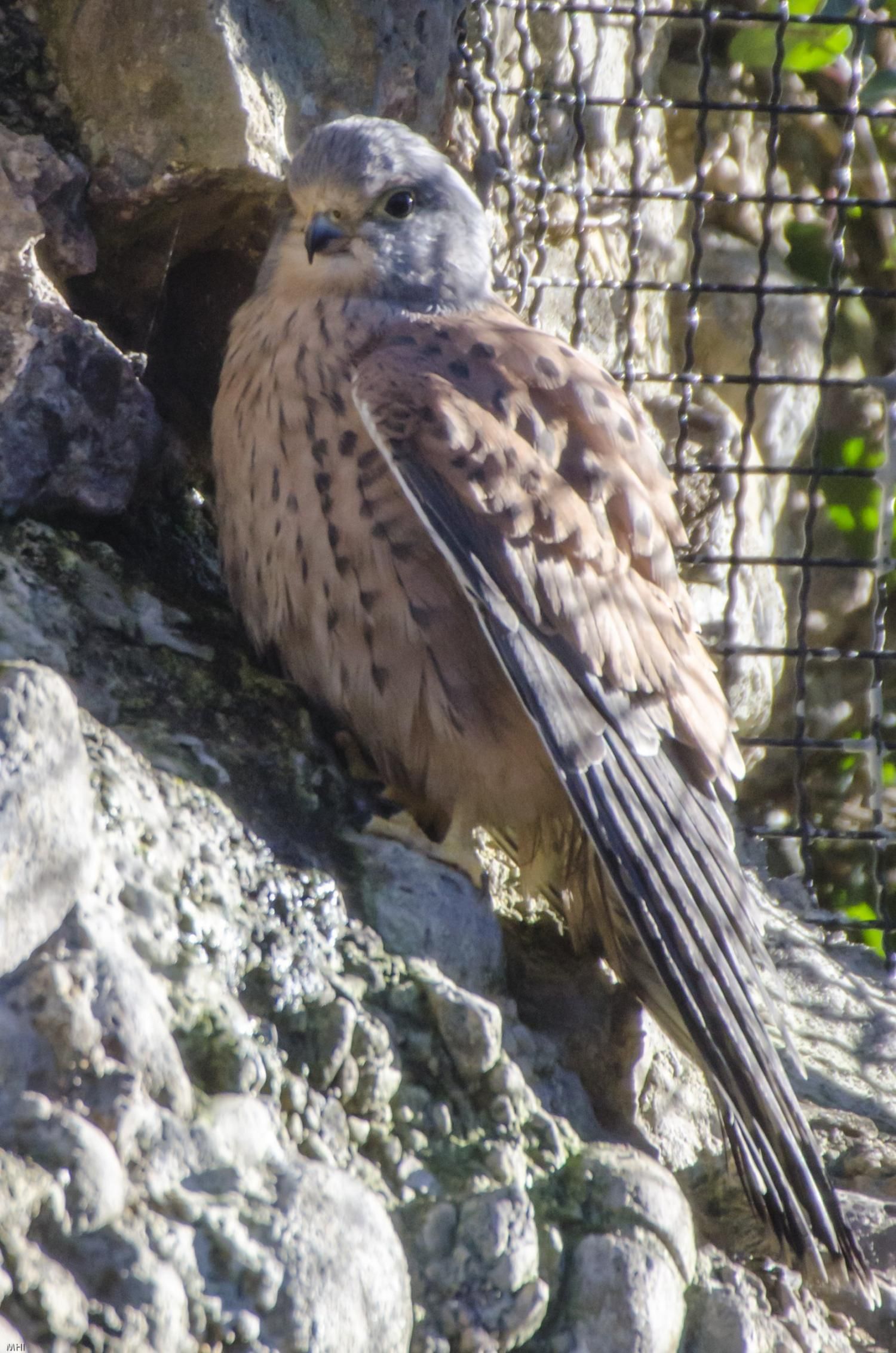 Der Turmfalke ist ein eher zierlicher Vertreter der Falken. Als Greifvogel jagt er vornehmlich im freien Feld nach Mäusen und grossen Insekten. Schon von weitem kann man den Turmfalken erkennen, wenn er in der Luft am Ort stehen bleibt (das so genannte „Rütteln“) und den Boden genauer nach Beute absucht. Weil Turmfalken häufig dabei beobachtet werden können, werden sie auch „Rüttelfalken“ genannt. Das Verbreitungsgebiet des Turmfalken erstreckt sich über Eurasien und grosse Teile Afrikas. In der Schweiz ist er die häufigste Falkenart und öfters zu sehen. Als anpassungsfähiger Vogel hat sich der Turmfalke die verschiedensten Lebensräume erschlossen, wie z.B. offene Landschaften, Industrie- und Kulturlandflächen, Heiden, Moore mit Bäumen und auch Gebirge. In den Siebziger Jahren gab es bei den Raubvögeln, allen voran bei den Falken, eine schreckliche Entdeckung zu vermelden. Die Nachwuchsrate brach sprichwörtlich zusammen: Beim Bebrüten der Eier zerbrachen deren Schalen. Man fand heraus, dass in der Agrarwirtschaft eingesetztes DDT, ein Schädlingsbekämpfungsmittel, zur Bildung von zu dünnen Eierschalen geführt hatte. Die Raubvögel waren am stärksten betroffen, da sie am Ende der Nahrungskette stehen und solche Stoffe in ihrem Körper anhäufen. Daraufhin wurde DDT in Europa verboten, der Bestand der betroffenen Arten erholt sich jedoch nur langsam. Turmfalken brüten meistens in Felsnischen, oft sogar in altem Gemäuer. Daher kommt auch der Name Turmfalke. In der Turmfalkenvoliere, die sich zwischen Eingang und Waldrappenvoliere befindet, sucht man deshalb vergebens ein Nest. Eine Felsnische dient ihnen als geeigneter Brutplatz. Der Turmfalke teilt sich im Tierpark die Voliere in der Regel mit Waldrapp und Steinkauz.