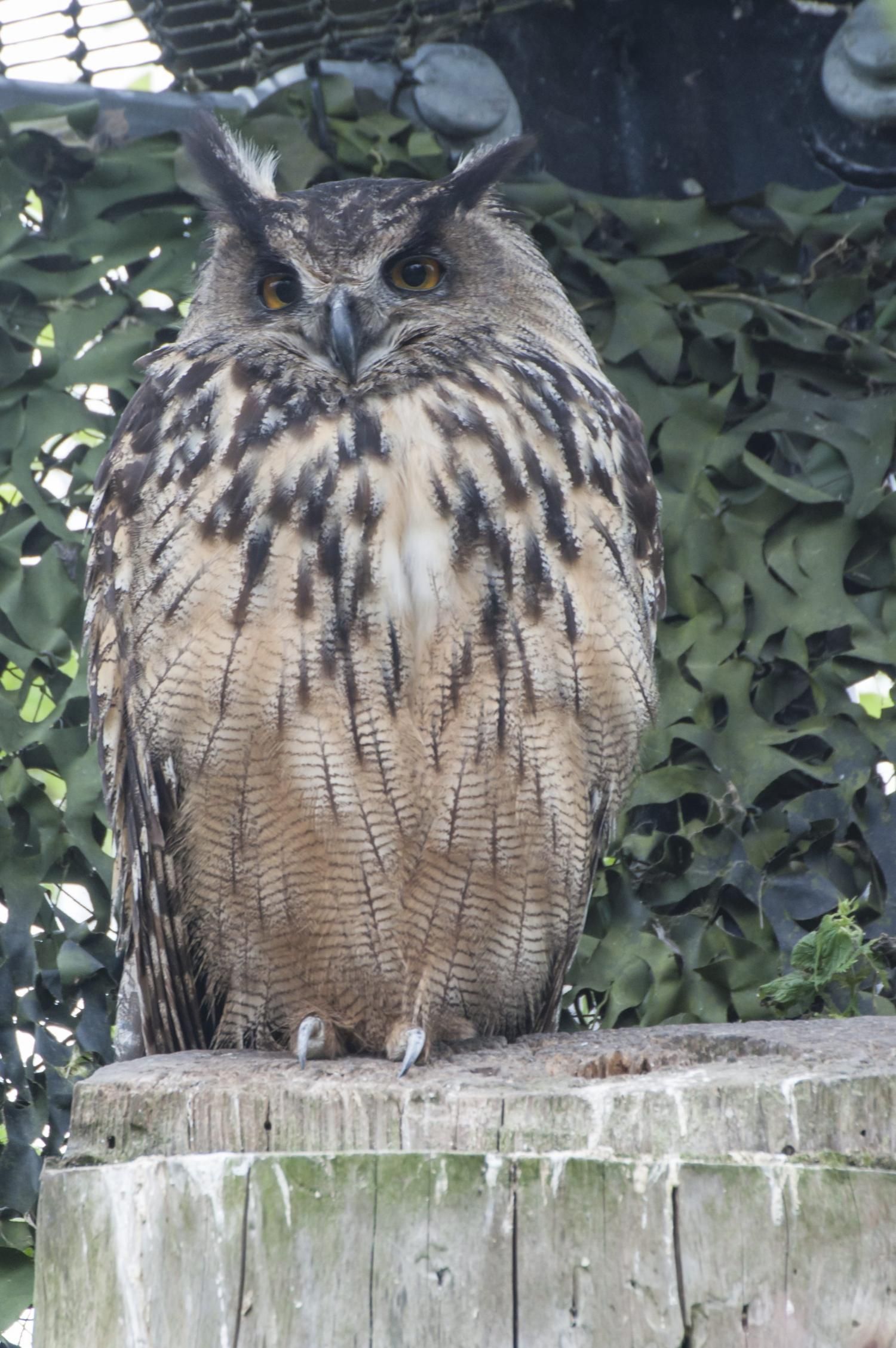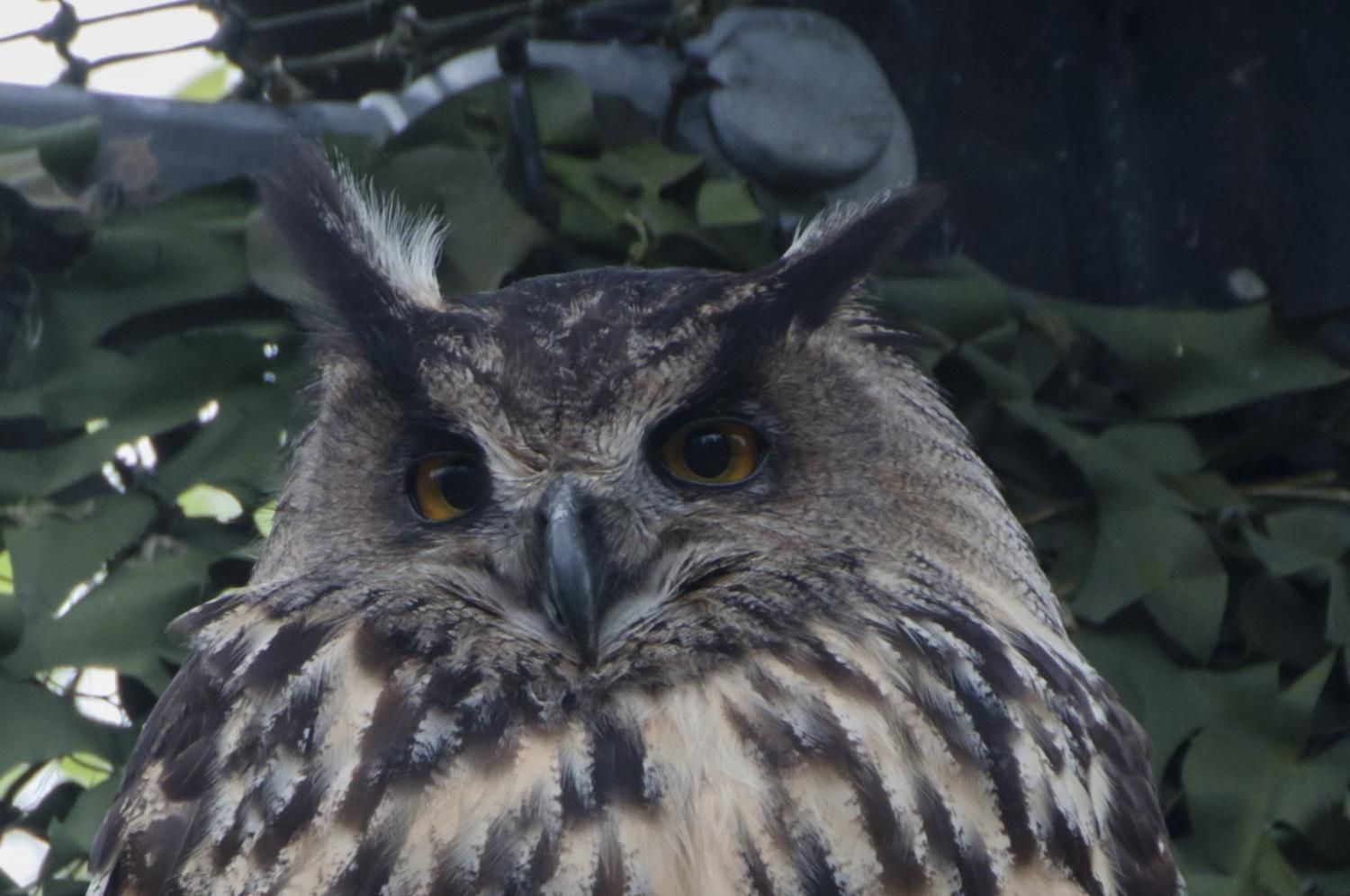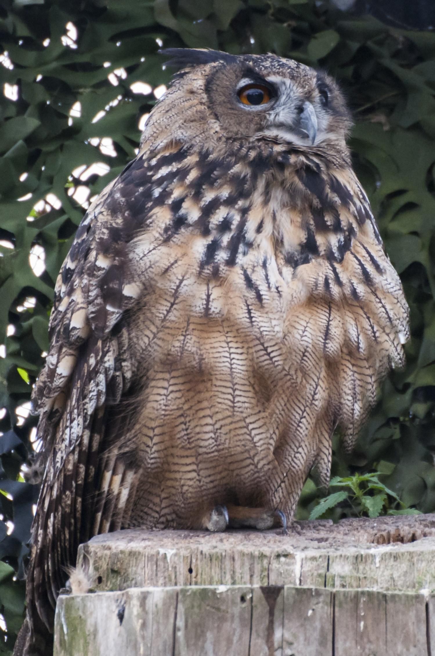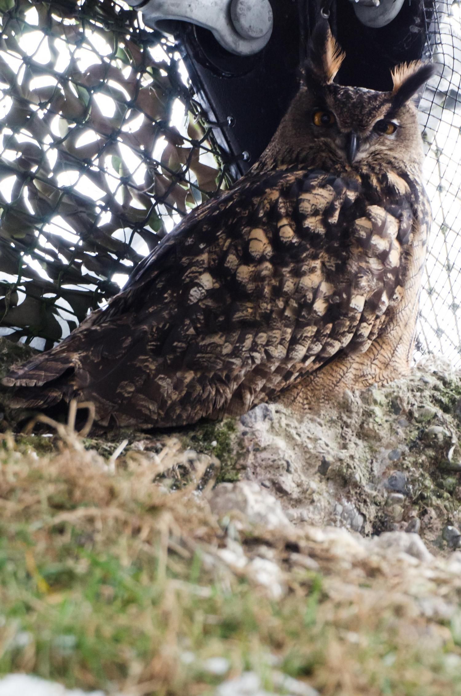 Der Uhu ist mit einer Flügelspannweite bis über 180cm die grösste Eulenart der Welt. Er gehört zur Gruppe der Ohreulen, deren Merkmal die langen, abstehenden Federohren sind, die je nach Gemütszustand waagrecht bis steil aufgerichtet sind. Die eigentlichen Ohren sitzen jedoch seitlich am Kopf. Uhus kommen von Westeuropa und Nordafrika bis nach Ostasien vor. Die einzelnen Unterarten haben sich in ihrer Grösse und Färbung an ihren jeweiligen Lebensraum angepasst. Sie sind vor allem in felsigen Regionen zu finden, wo Wälder und offene Landschaften sich abwechseln. Bekannte Brutgebiete in der Schweiz sind z.B. die grossen Alpentäler wie das Engadin oder Wallis. Zu schaffen machen dem Uhu nebst den schwindenden Lebensräumen auch Hochspannungsleitungen, Stacheldraht und Pestizide. Seit 1925 steht der Uhu unter gesetzlichem Schutz. Uhus sind nacht- und dämmerungsaktiv. Bei der Jagd stürzen sie sich entweder von einer Warte aus auf die Beute nieder oder sie suchen ihre Nahrung im lautlosen Flug. Wie alle Eulen besitzen Uhus spezielle Federstrukturen, welche die Luftturbulenzen beim Flug mindern, und so ein beinahe geräuschloses Fliegen ermöglichen. Die Nahrung besteht zu zwei Dritteln aus Säugetieren, wie Ratten, Spitzmäuse, Hasen oder junge Rotfüchsen. Auch Vögel, Frösche und gelegentlich Fische werden von Uhus gerne gefressen. Die Beute wird vollständig verzehrt. Unverdauliche Teile wie Knochen, Zähne, Haare und Federn werden anschliessend als so genannte Gewölle wieder ausgewürgt. Im Tierpark finden Sie den Uhu in der begehbaren Voliere auf dem Rundgang. Er ist von den kleineren Eulenarten abgetrennt, da er als geschickter Jäger für diese gefährlich wäre.
