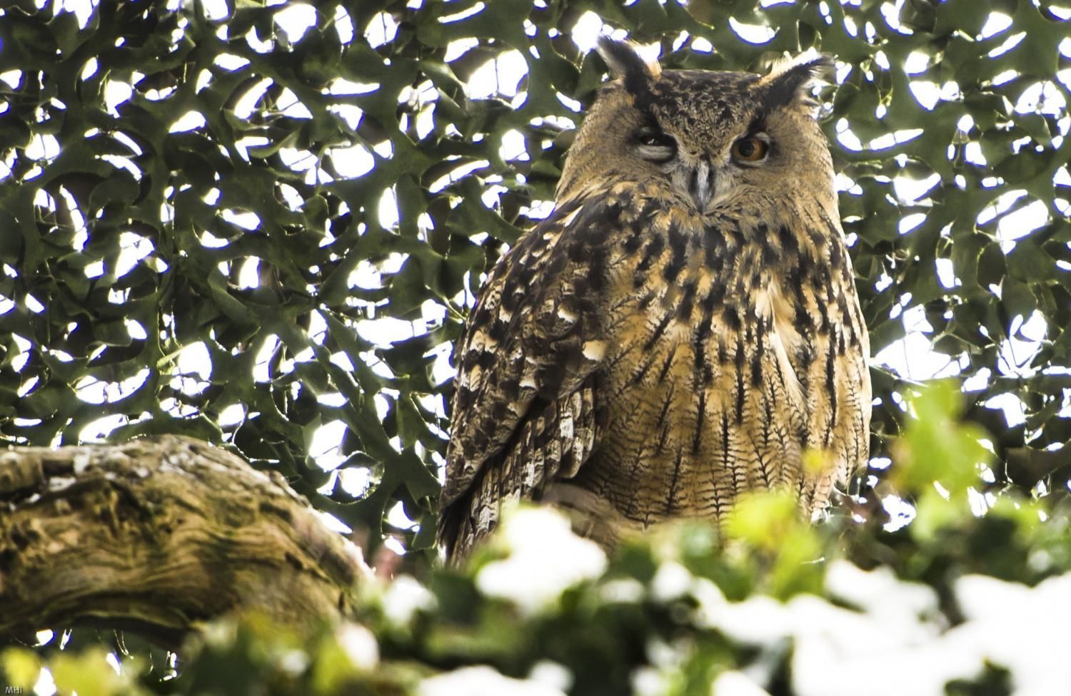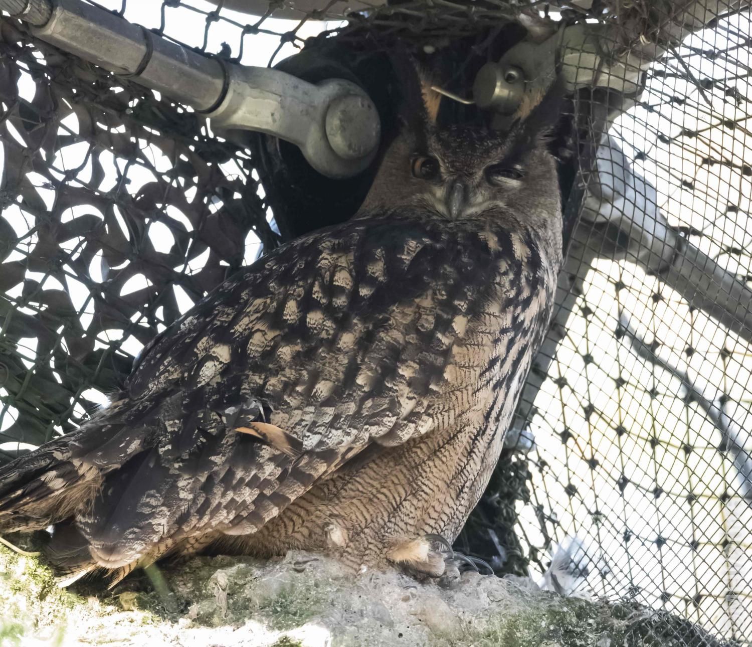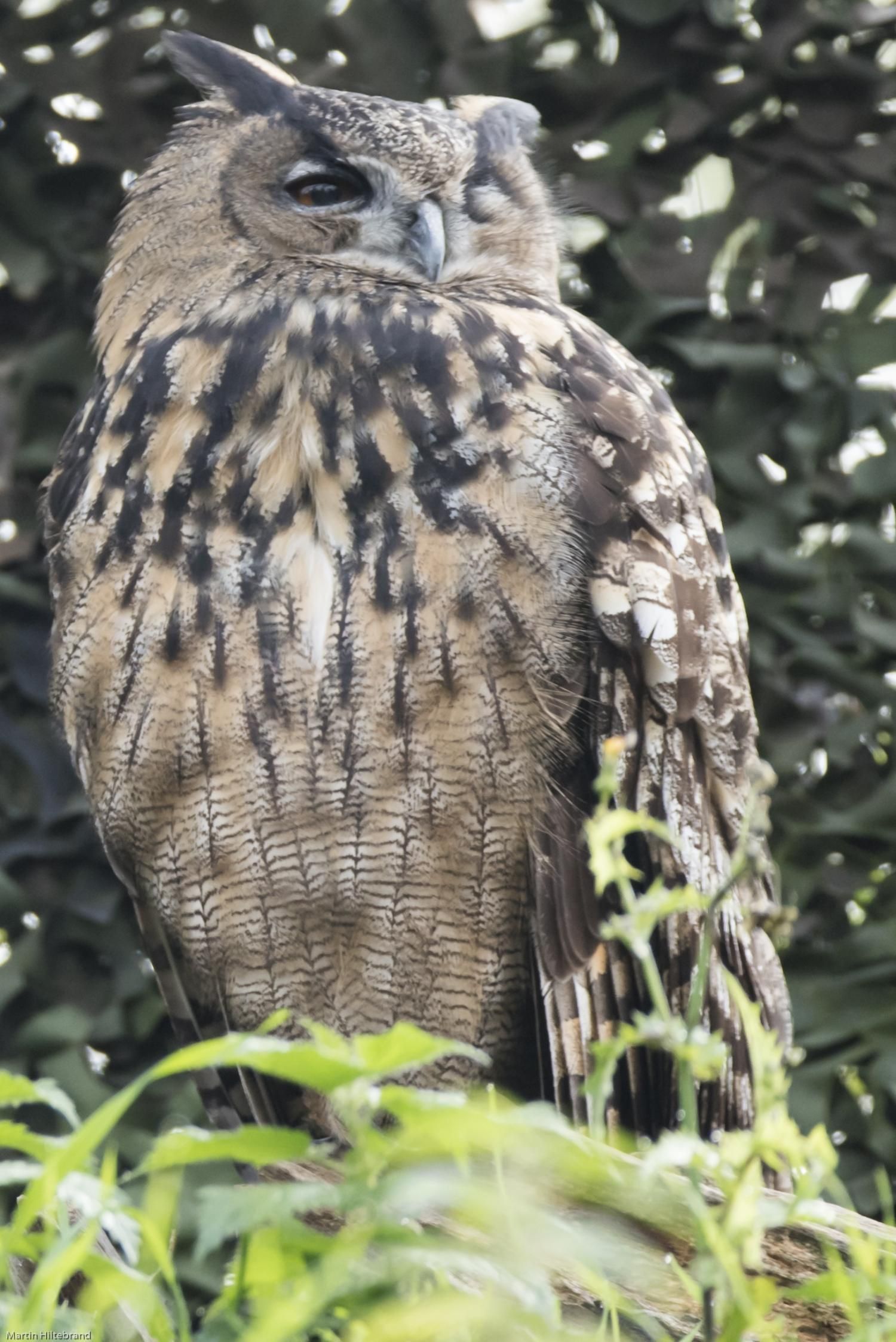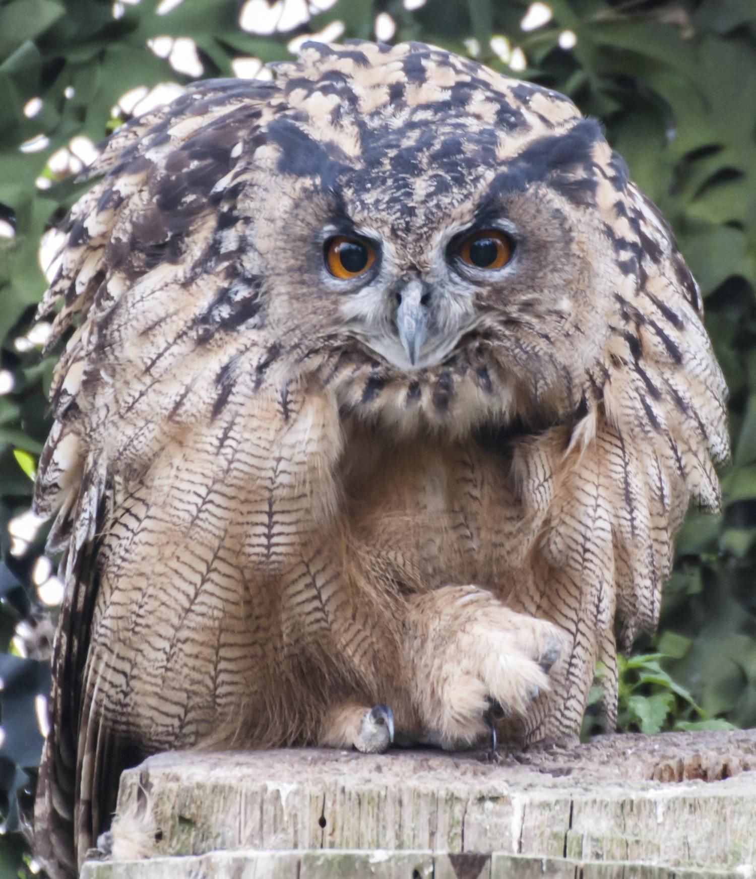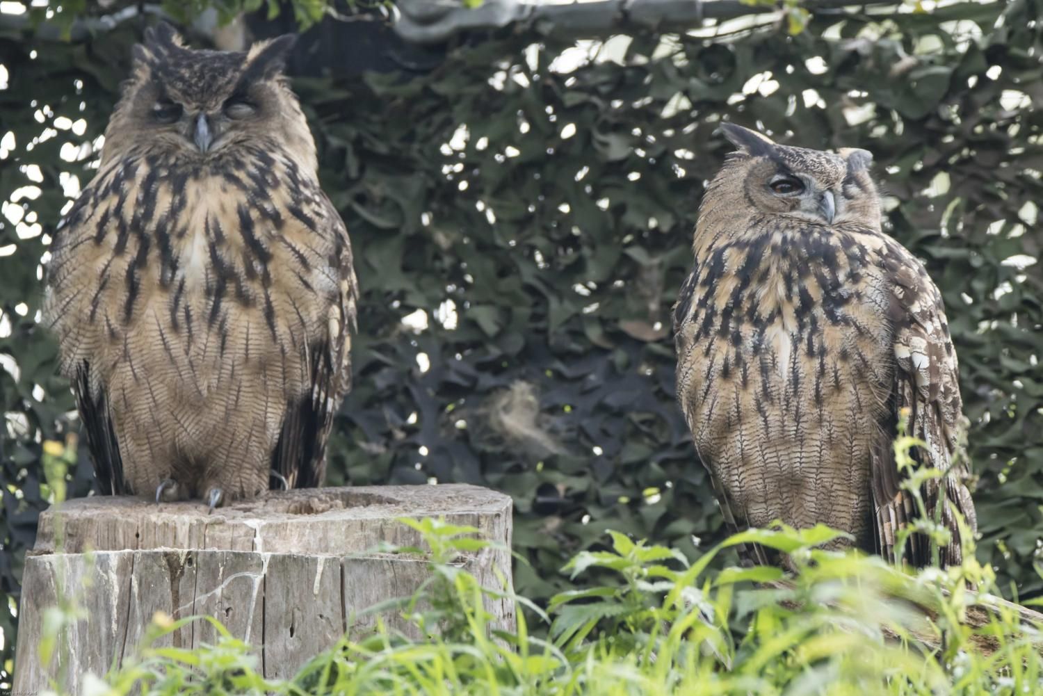 Der Uhu ist mit einer Flügelspannweite bis über 180cm die grösste Eulenart der Welt. Er gehört zur Gruppe der Ohreulen, deren Merkmal die langen, abstehenden Federohren sind, die je nach Gemütszustand waagrecht bis steil aufgerichtet sind. Die eigentlichen Ohren sitzen jedoch seitlich am Kopf. Uhus kommen von Westeuropa und Nordafrika bis nach Ostasien vor. Die einzelnen Unterarten haben sich in ihrer Grösse und Färbung an ihren jeweiligen Lebensraum angepasst. Sie sind vor allem in felsigen Regionen zu finden, wo Wälder und offene Landschaften sich abwechseln. Bekannte Brutgebiete in der Schweiz sind z.B. die grossen Alpentäler wie das Engadin oder Wallis. Zu schaffen machen dem Uhu nebst den schwindenden Lebensräumen auch Hochspannungsleitungen, Stacheldraht und Pestizide. Seit 1925 steht der Uhu unter gesetzlichem Schutz. Uhus sind nacht- und dämmerungsaktiv. Bei der Jagd stürzen sie sich entweder von einer Warte aus auf die Beute nieder oder sie suchen ihre Nahrung im lautlosen Flug. Wie alle Eulen besitzen Uhus spezielle Federstrukturen, welche die Luftturbulenzen beim Flug mindern, und so ein beinahe geräuschloses Fliegen ermöglichen. Die Nahrung besteht zu zwei Dritteln aus Säugetieren, wie Ratten, Spitzmäuse, Hasen oder junge Rotfüchsen. Auch Vögel, Frösche und gelegentlich Fische werden von Uhus gerne gefressen. Die Beute wird vollständig verzehrt. Unverdauliche Teile wie Knochen, Zähne, Haare und Federn werden anschliessend als so genannte Gewölle wieder ausgewürgt. Im Tierpark finden Sie den Uhu in der begehbaren Voliere auf dem Rundgang. Er ist von den kleineren Eulenarten abgetrennt, da er als geschickter Jäger für diese gefährlich wäre.