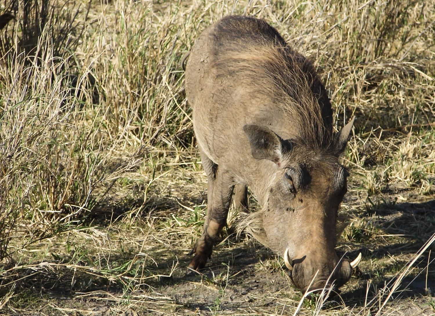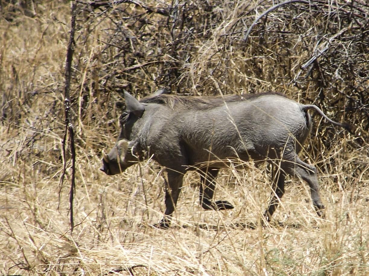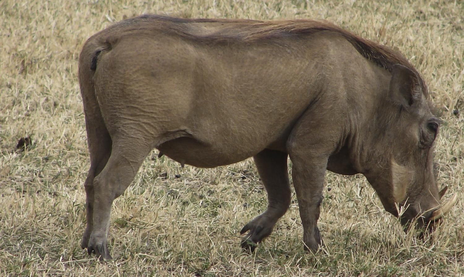 Das Warzenschwein ist eine in weiten Teilen Afrikas beheimatete Säugetier-art aus der Familie der Echten Schweine. Zusammen mit dem Wüstenwarzen-schwein bildet es die Gattung der Warzenschweine. Warzenschweine sind nahezu in ganz Afrika südlich der Sahara verbreitet. Ihr Verbreitungsgebiet reicht vom Süden Mauretaniens und Senegal bis Äthiopien und südlich bis Namibia und Südafrika. Ihr Lebensraum sind offene Gelände, vorzugsweise in Savannen und lichten Wäldern. Warzenschweine ähneln auf den ersten Blick einem etwas flacheren Wildschwein mit einem etwas zu groß geratenen bizarren Kopf. Vor allem die vier paarig angeordneten Warzen am Kopf und die halbkreisförmigen, bis zu 30 cm langen, gekrümmten Hauer (die Eckzähne des Oberkiefers) tragen zu diesem Eindruck bei. Die unteren Eckzähne sind ebenfalls verlängert; sie sind kürzer, aber schärfer. Die Warzen, die besonders bei alten Männchen sehr groß sein können, sind reine Hautgebilde ohne knöcherne oder Muskelgrundlage, die bereits beim Embryo angelegt sind. Der kurze Hals trägt eine Art Wamme. Das gewöhnlich graue Fell der Warzenschweine ist aufgrund seiner wärmeren Heimat wesentlich weniger dick als das der mitteleuropäischen Wildschweine. Warzenschweine haben eine lange Nacken- und Rückenmähne, die sich bei Gefahr aufrichtet, und einen mit einer Quaste versehenen Schwanz, den sie bei Flucht oder Angriff aufstellen – diesem Verhalten verdanken sie auch den Spitznamen „Radio Afrika“. Diese Tiere erreichen eine Kopfrumpflänge von 90 bis 150 cm, der Schwanz wird 25 bis 50 cm lang und die Schulterhöhe beträgt 64 bis 85 cm. Das Gewicht liegt zwischen 50 und 150 kg, wobei die Männchen schwerer als die Weibchen werden.