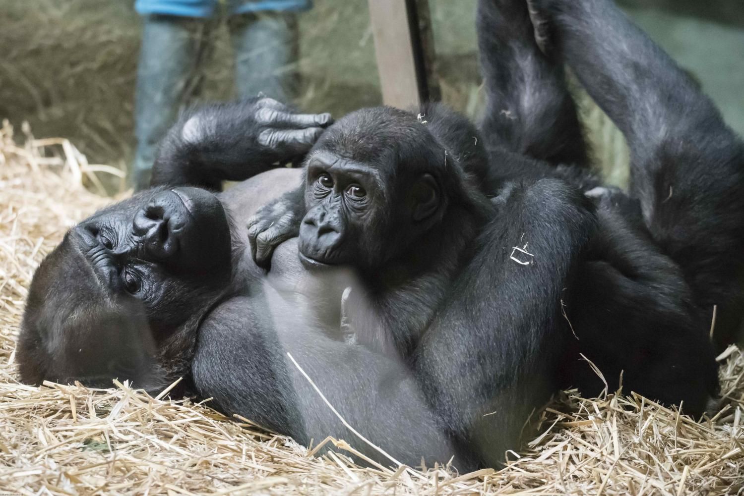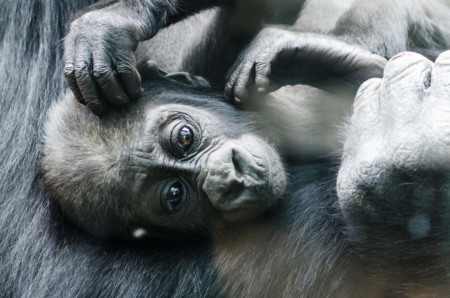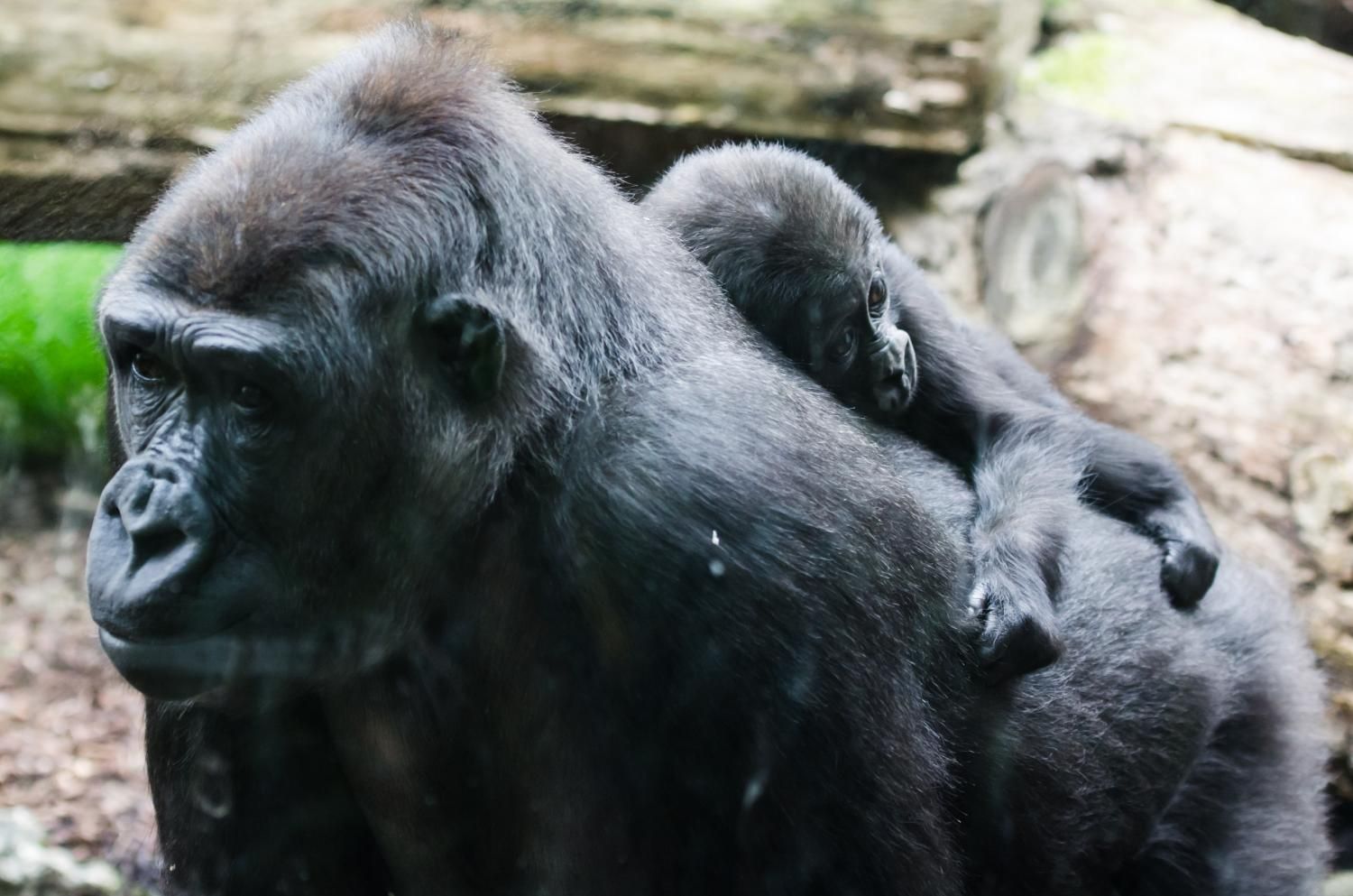 Gorillas sind ausgesprochene Bodenbewohner, die sich auf allen Vieren fortbewegen. Sie leben in Gruppen mit vier bis fünf Weibchen und Jungtieren, die von einem dominanten Silberrückenmann angeführt werden. Er verteidigt sein Revier durch Imponierverhalten, ist aber sonst genauso friedfertig wie alle anderen Gorillas und sogar ausgesprochen liebevoll und geduldig im Umgang mit den verspielten Jungen. Zwischen den einzelnen Gruppenmitgliedern besteht keine enge Bindung. Die bei Schimpansen häufige gegenseitige Haarpflege ist bei Gorillas selten.
